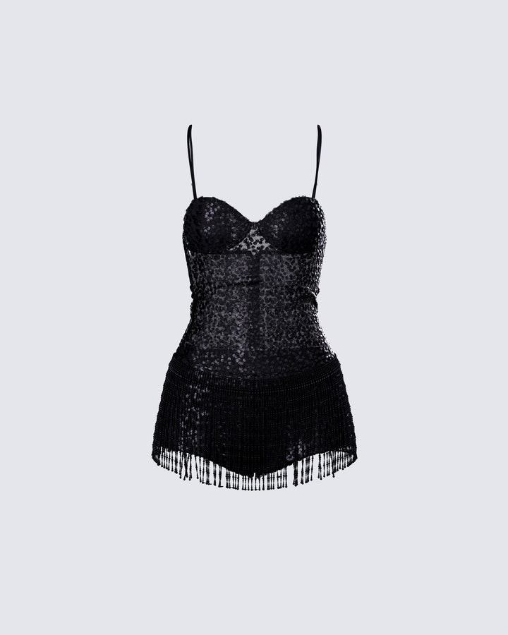 Clover Hand Beaded Rhinestone Black Mini Dress