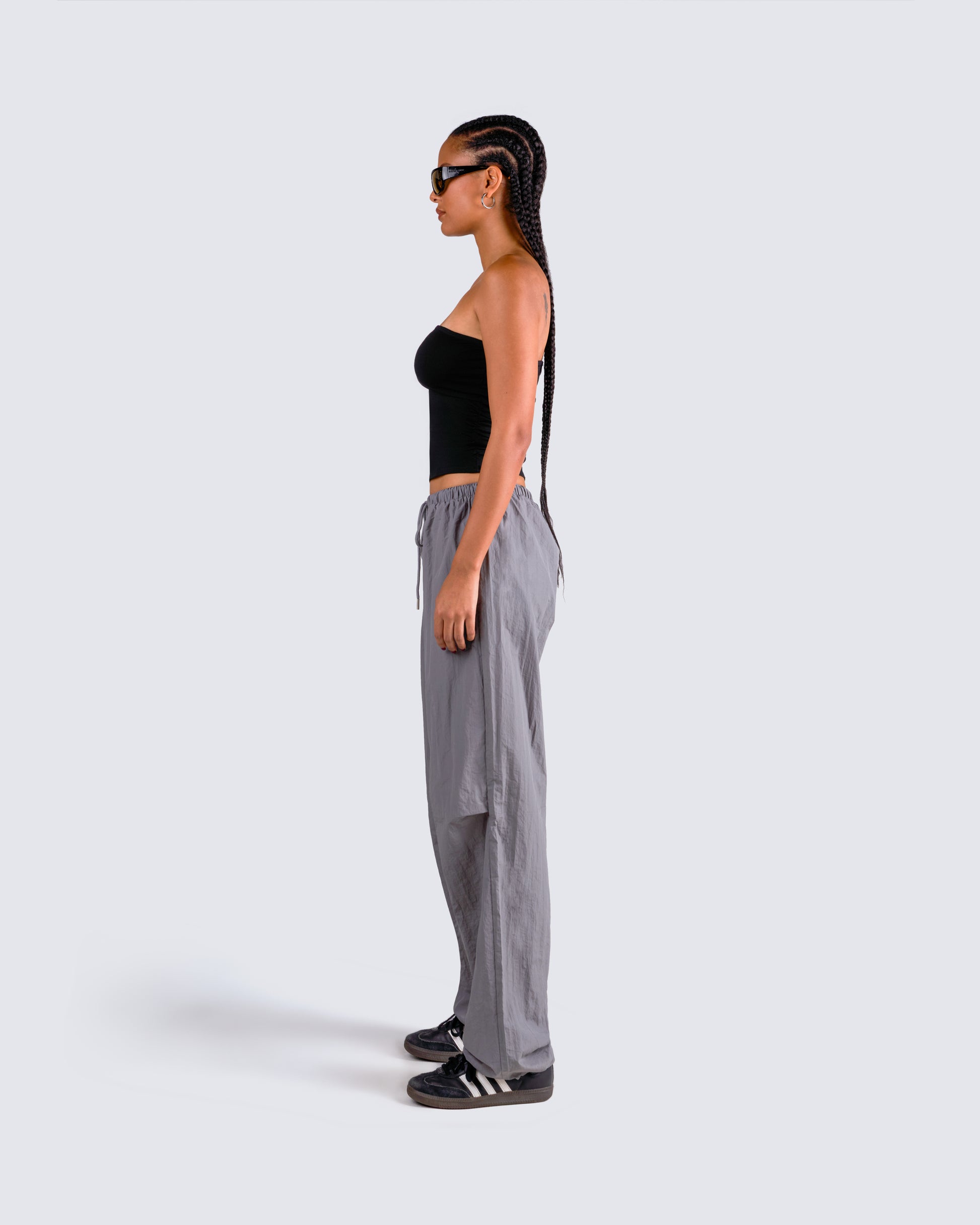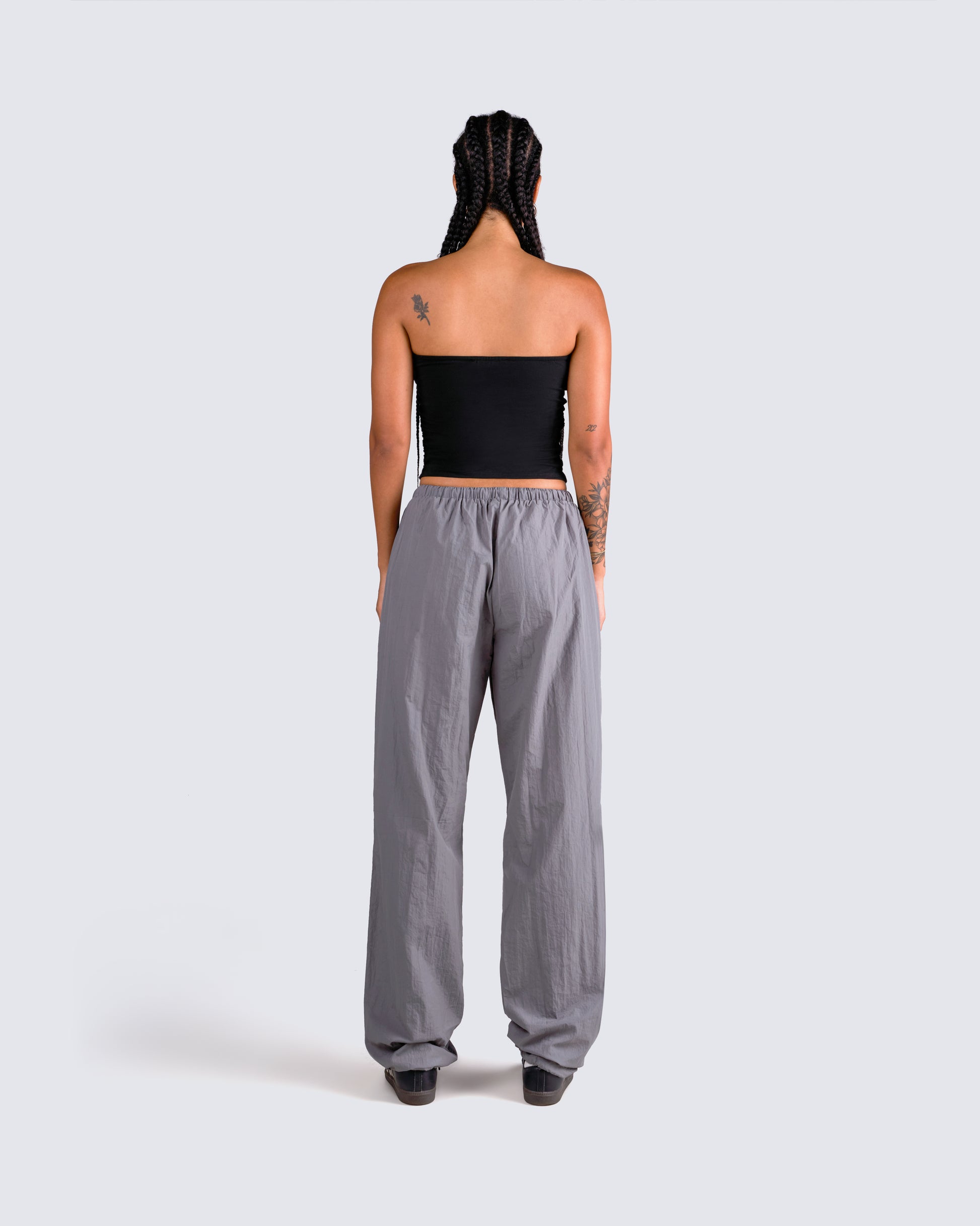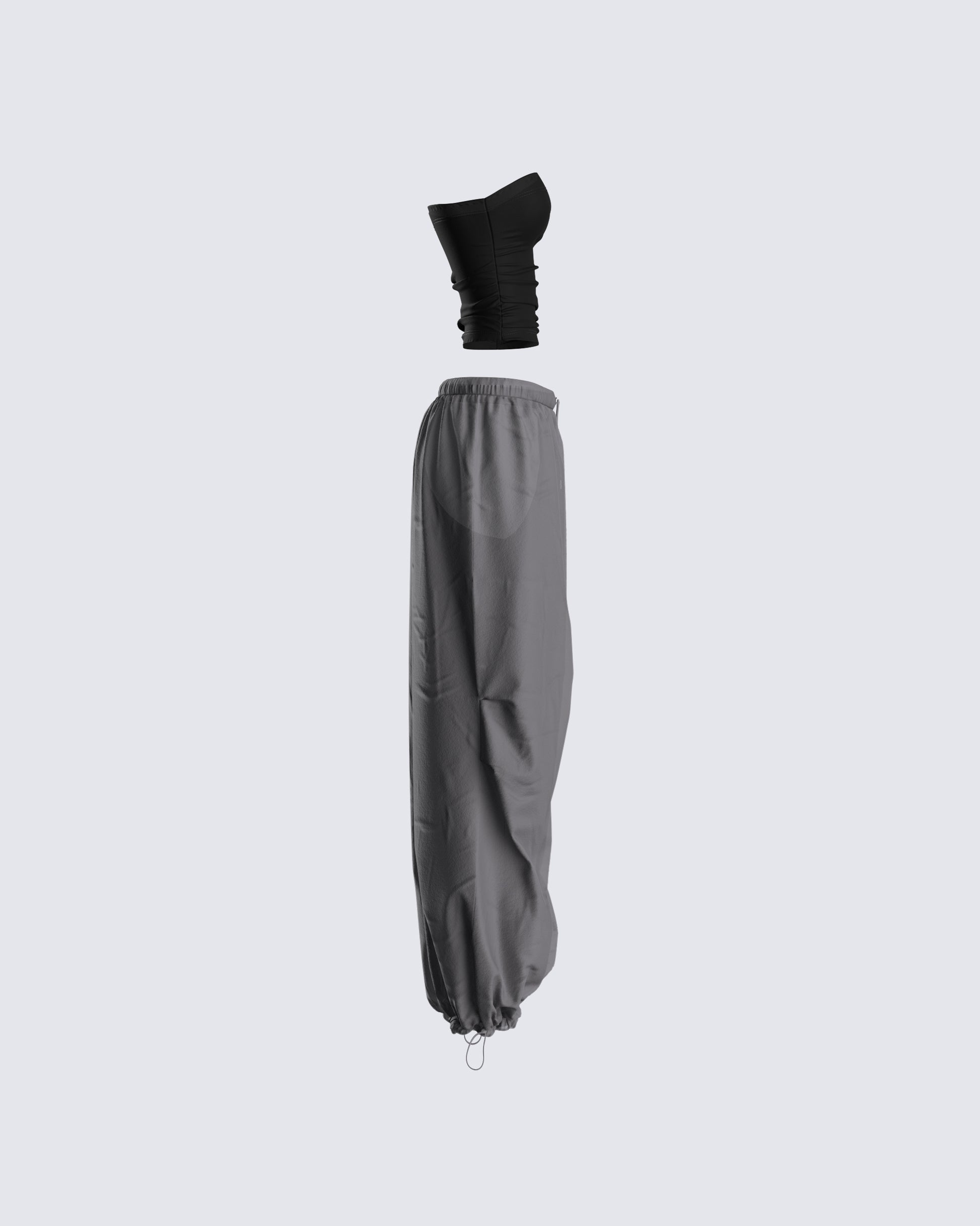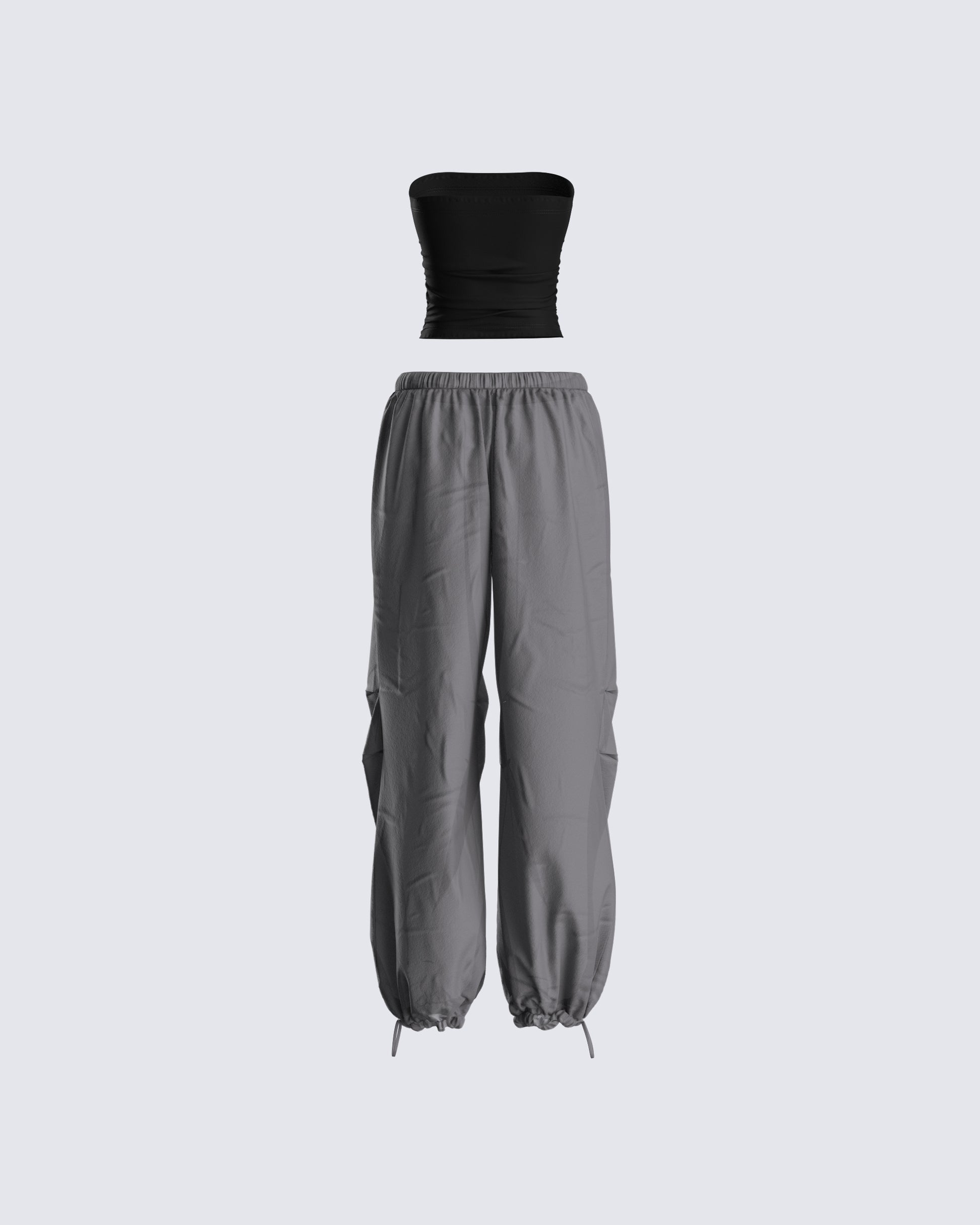Give off a vibe that everyone will want more of in this 2 piece set 😌 This effortless baddie fit features a black jersey tube top and a pair of grey parachute pants for the perfect everyday look 🖤