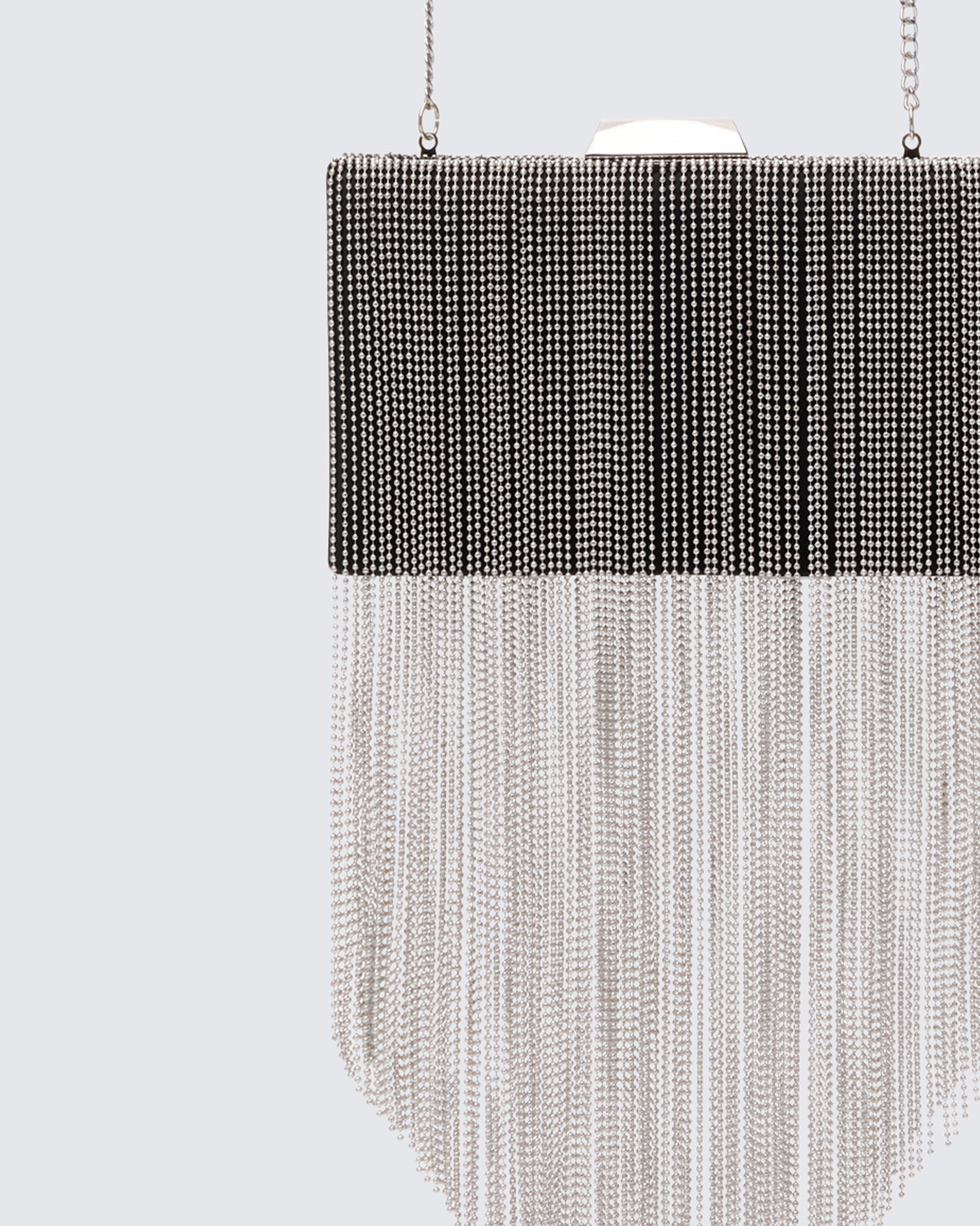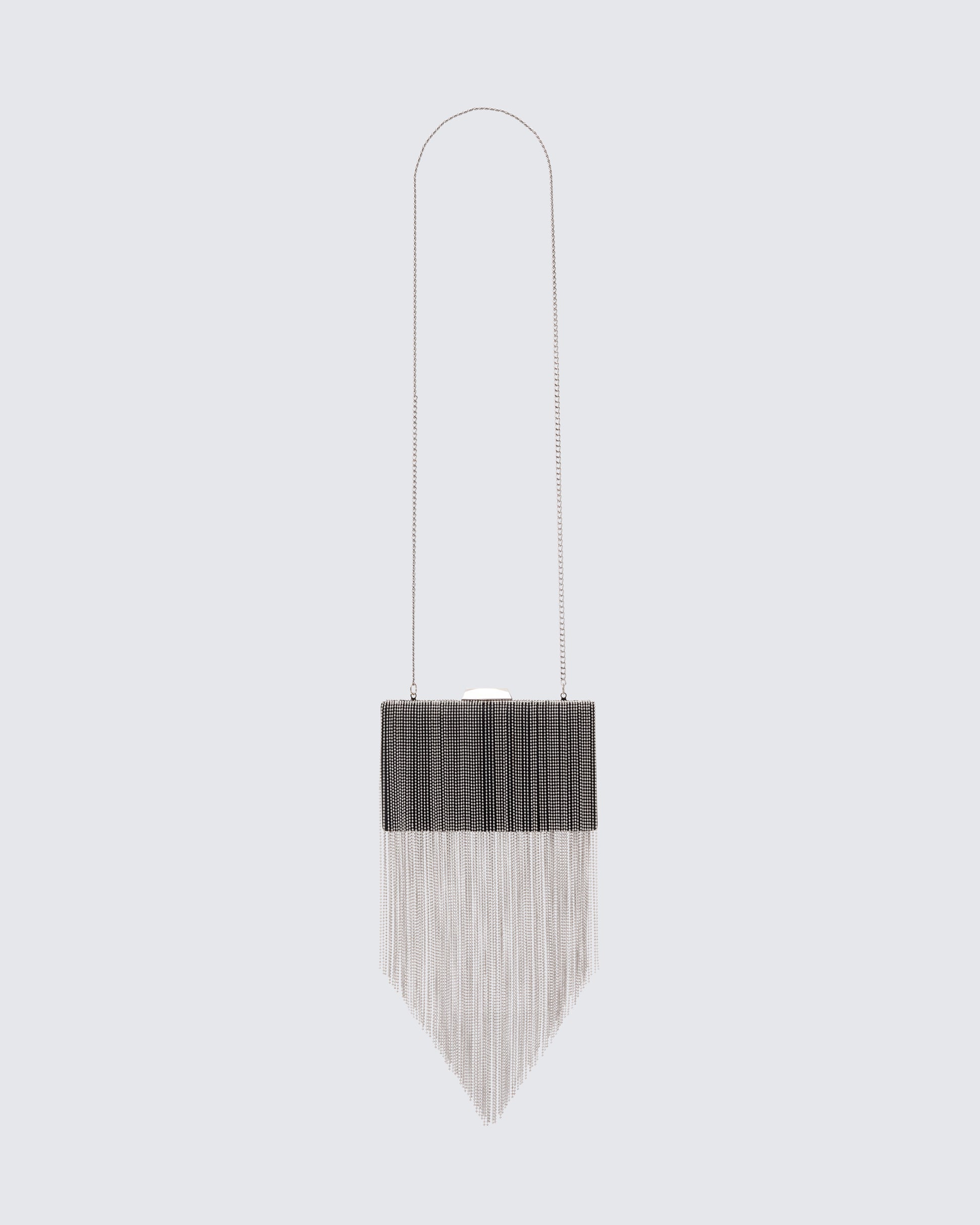 If looks could kill… 🖤 Draped in gunmetal fringe with a dagger-sharp edge, this clutch was built for looking lethal, luxe, and just a little untouchable ✨