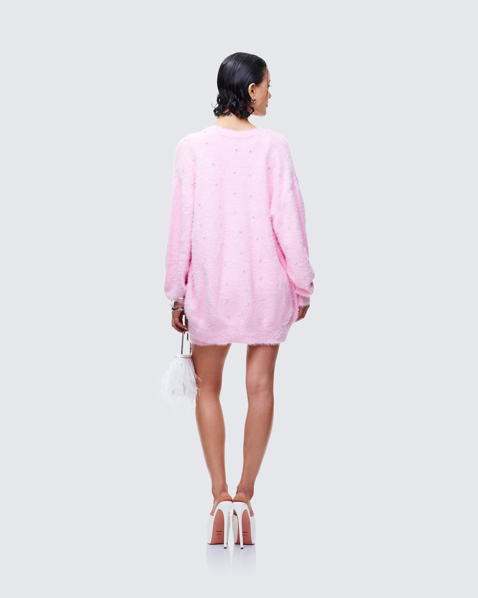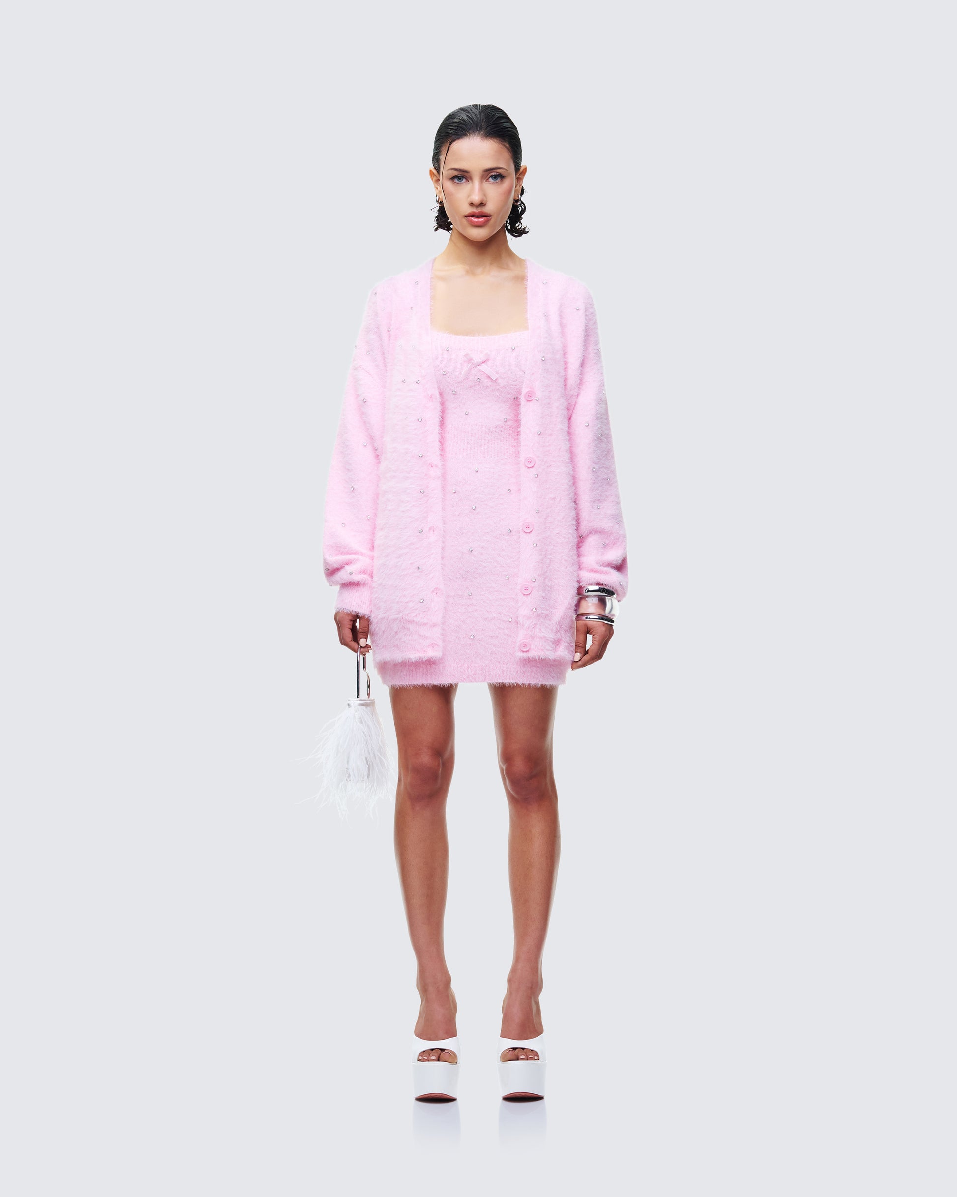 Bring all the cute, fun, and sassy energy in this matching two-piece set π Featuring a pink fuzzy knit mini dress, cardigan constructed from fuzzy yarn - this fit is almost as sweet as you π