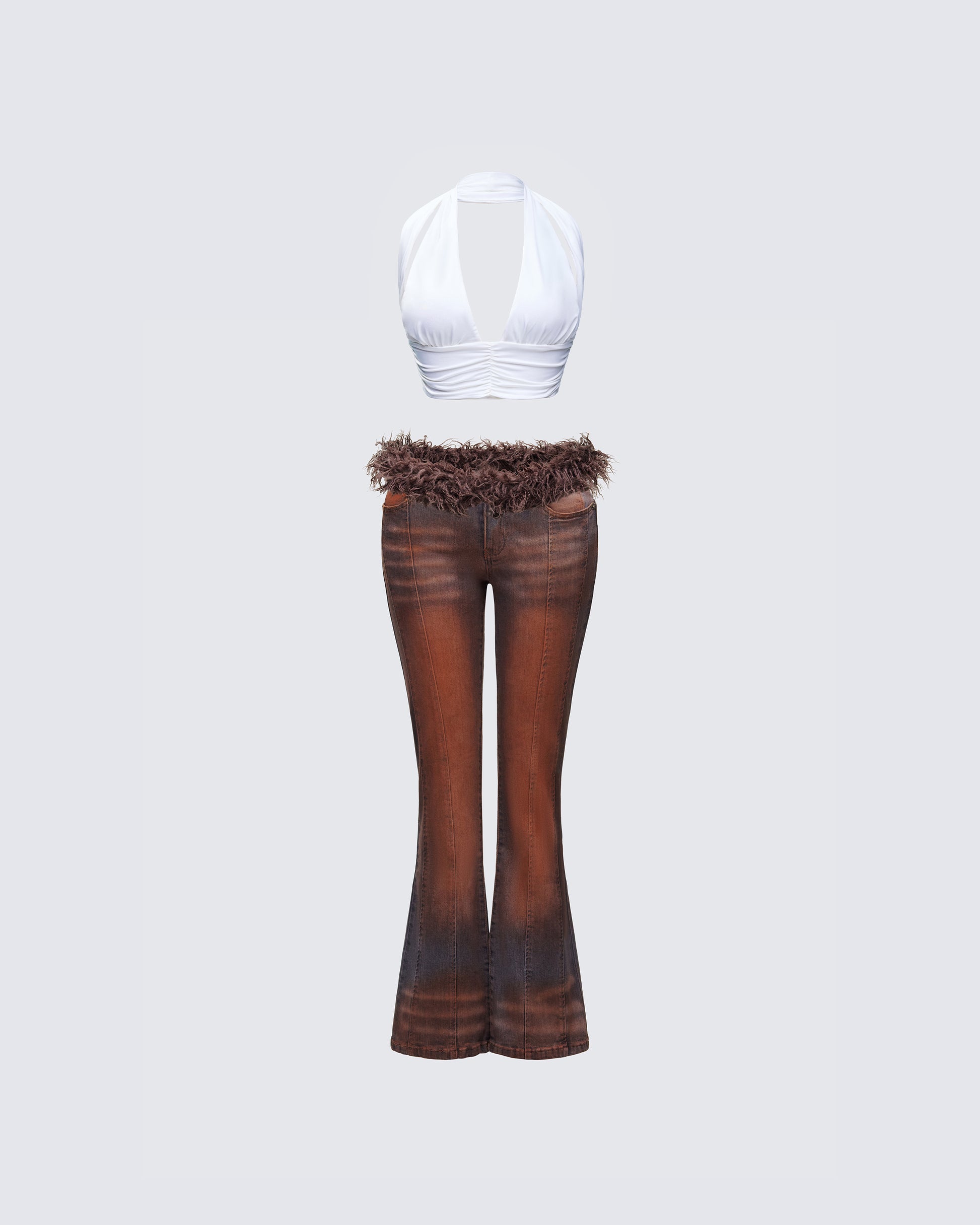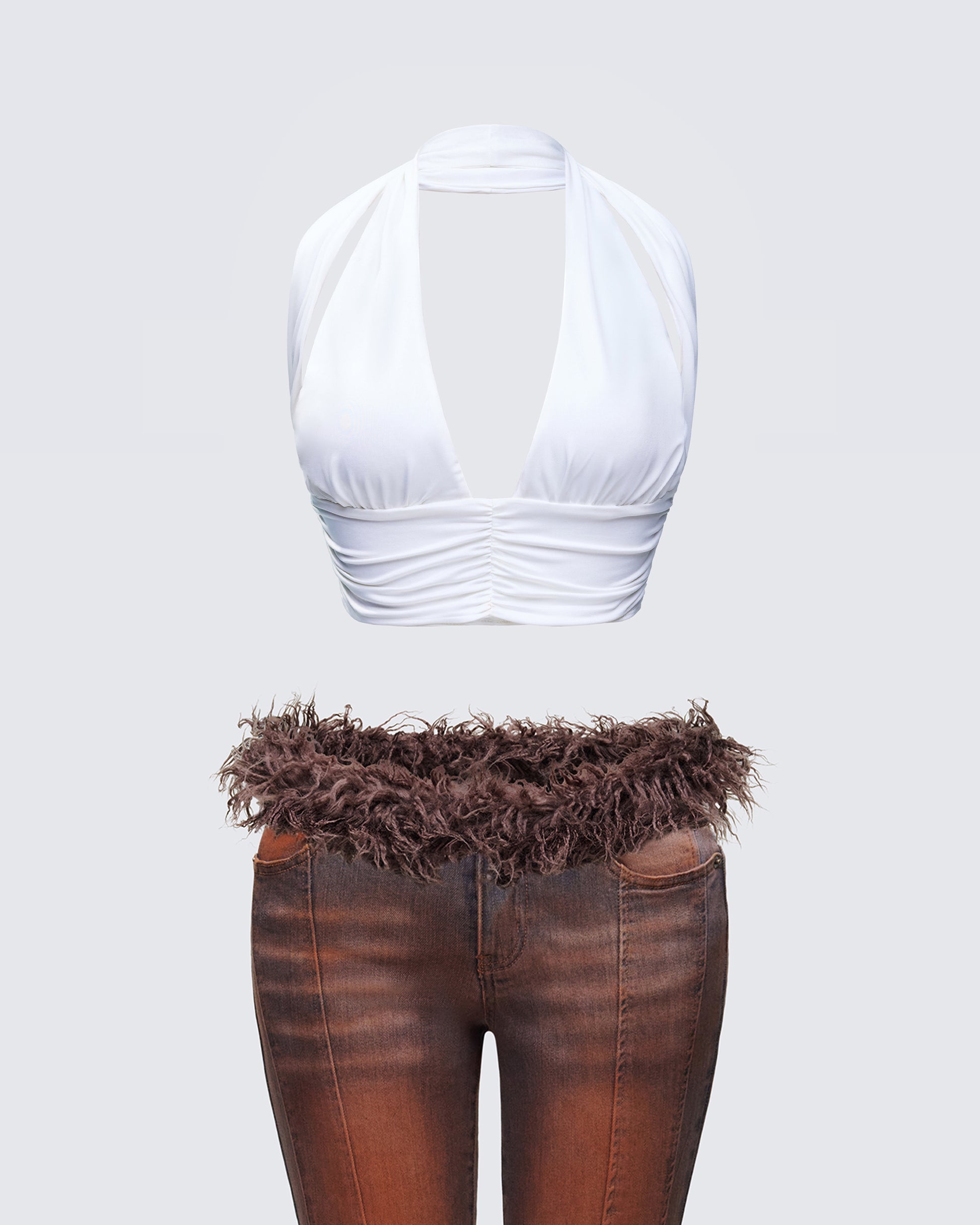 Bring the drama in this two-piece set š¤Ā Pairing a white halter top with brown denim fur jeans, this fit will have them all running back to you any chance they get šĀ