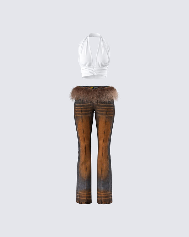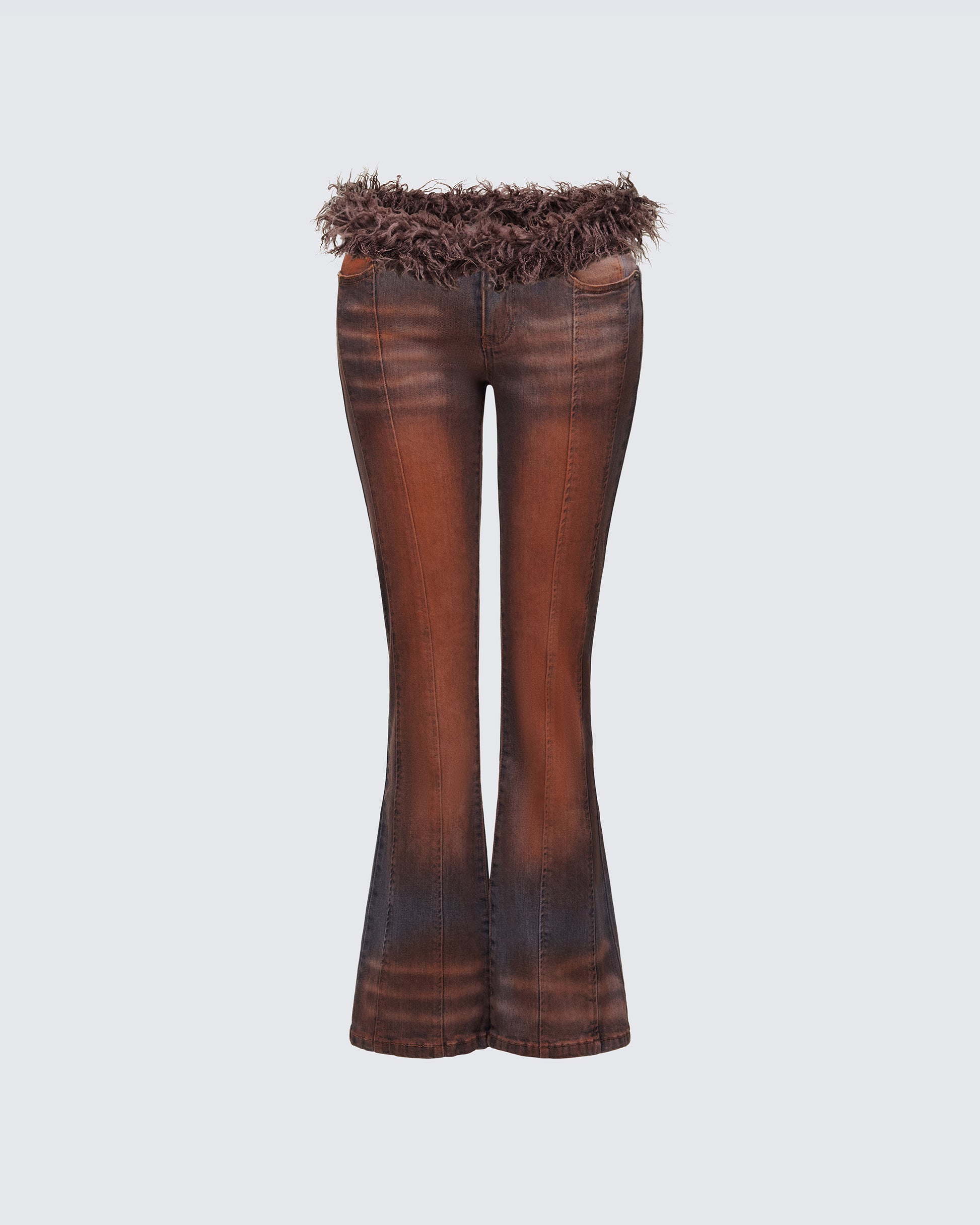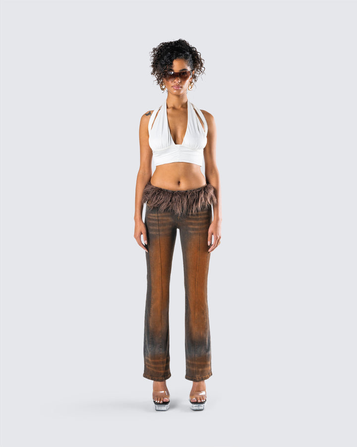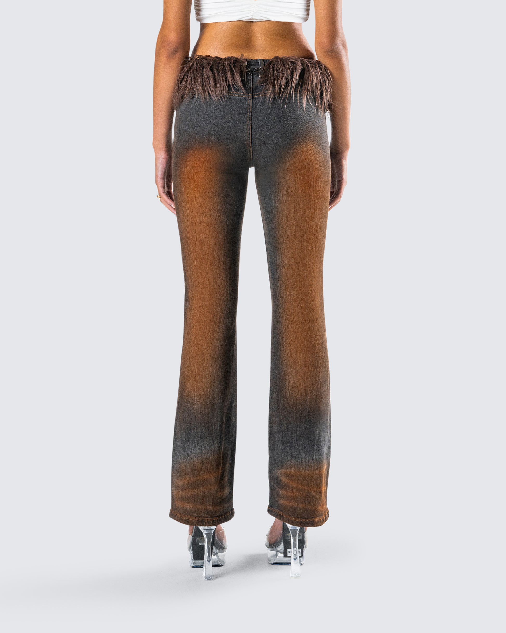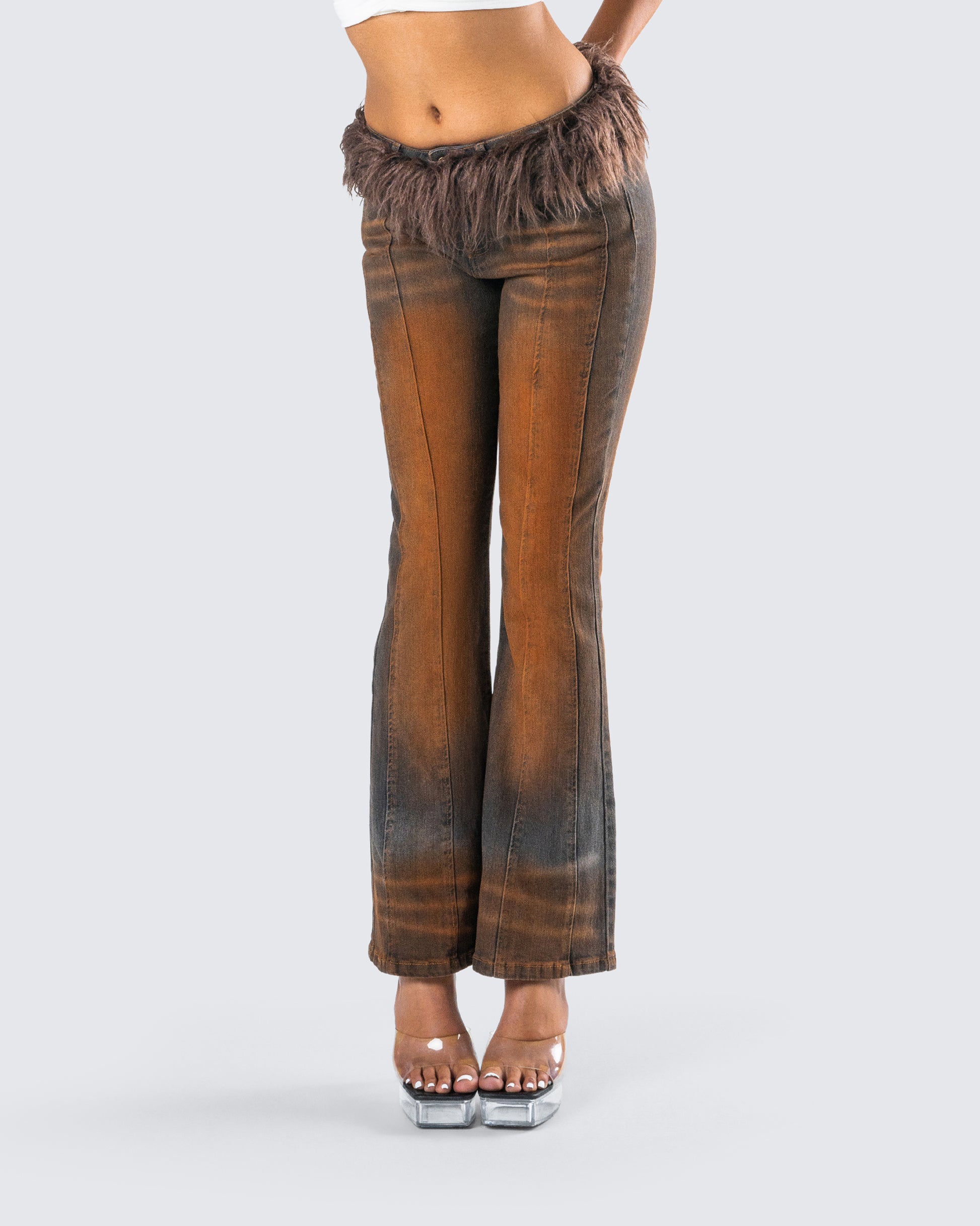 Lure them into the jungle with these brown denim fur jeans 🤎 With a chic and trendy look, these stretch denim pants are complete with a vintage wash and comes with a detachable brown faux fur belt 👀