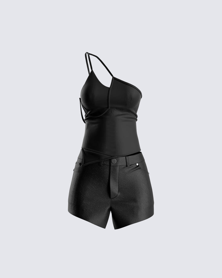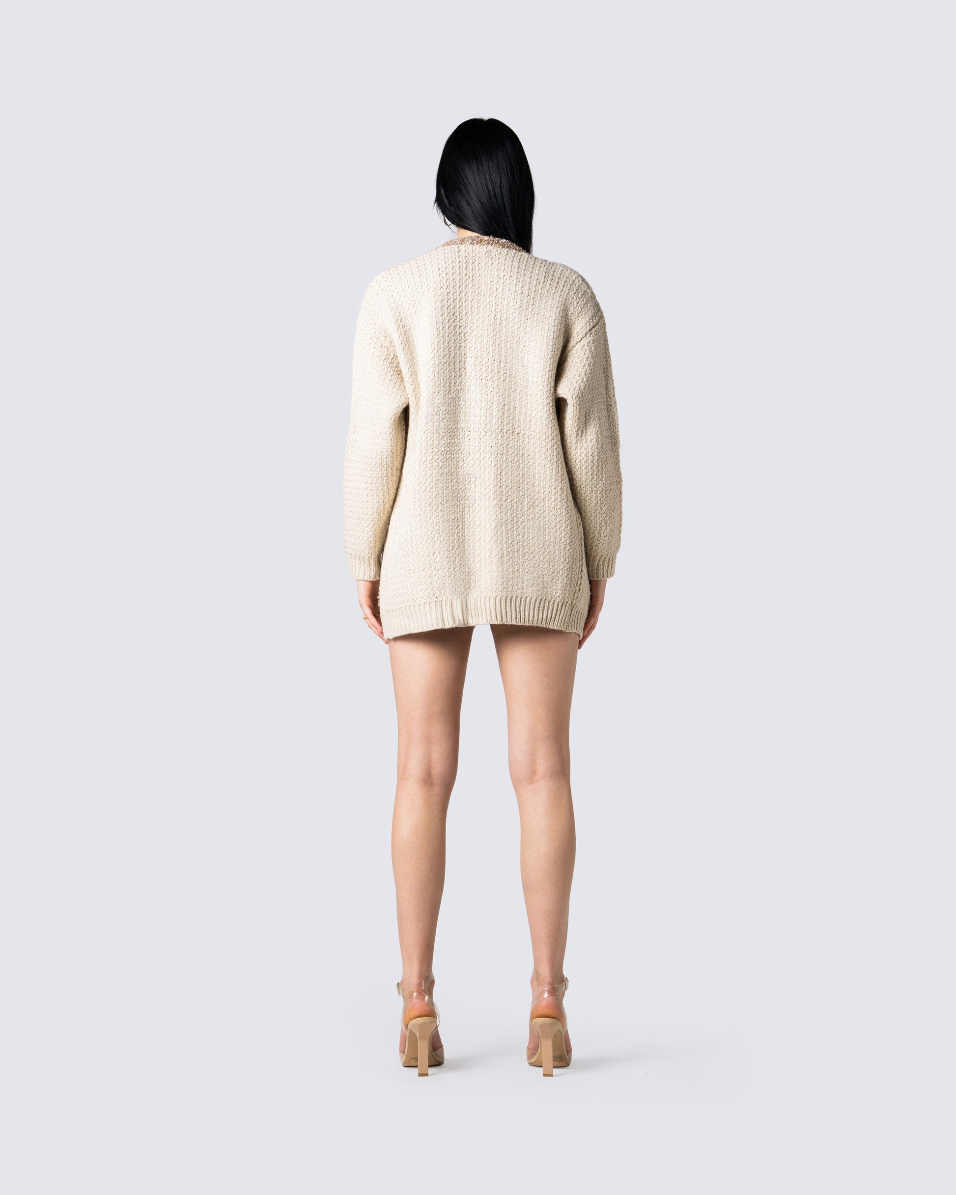 <p>Sonny Black Rib Tank Top: 53% Polyamide, 47% Viscose</p><p>Alfie Beige Cardigan Top: 72% Acrylic, 20% Polyamide, 8% Polyester </p><p>Rhett Black Mini Skirt: 95% Polyester 5% Spandex Coating: Polyurethane</p>