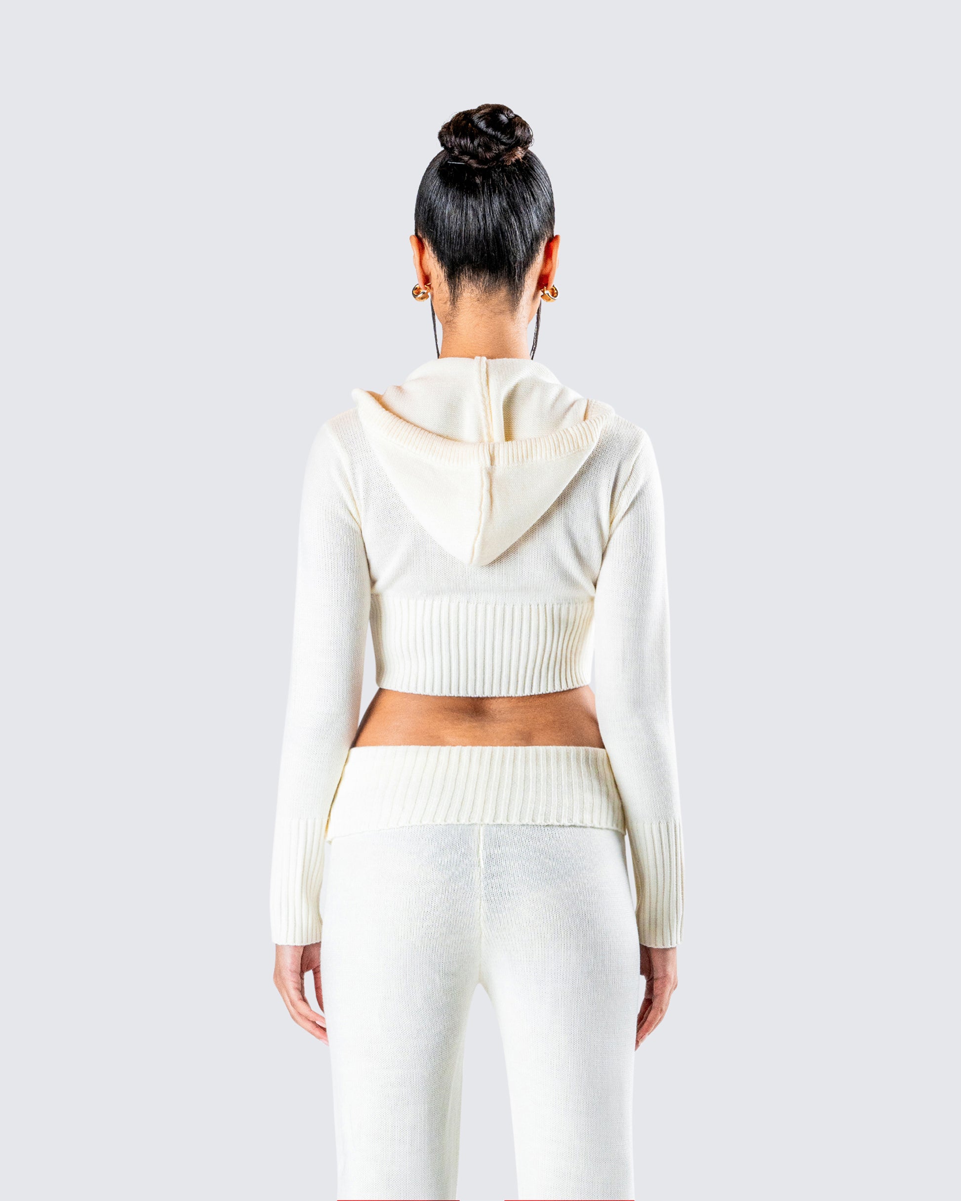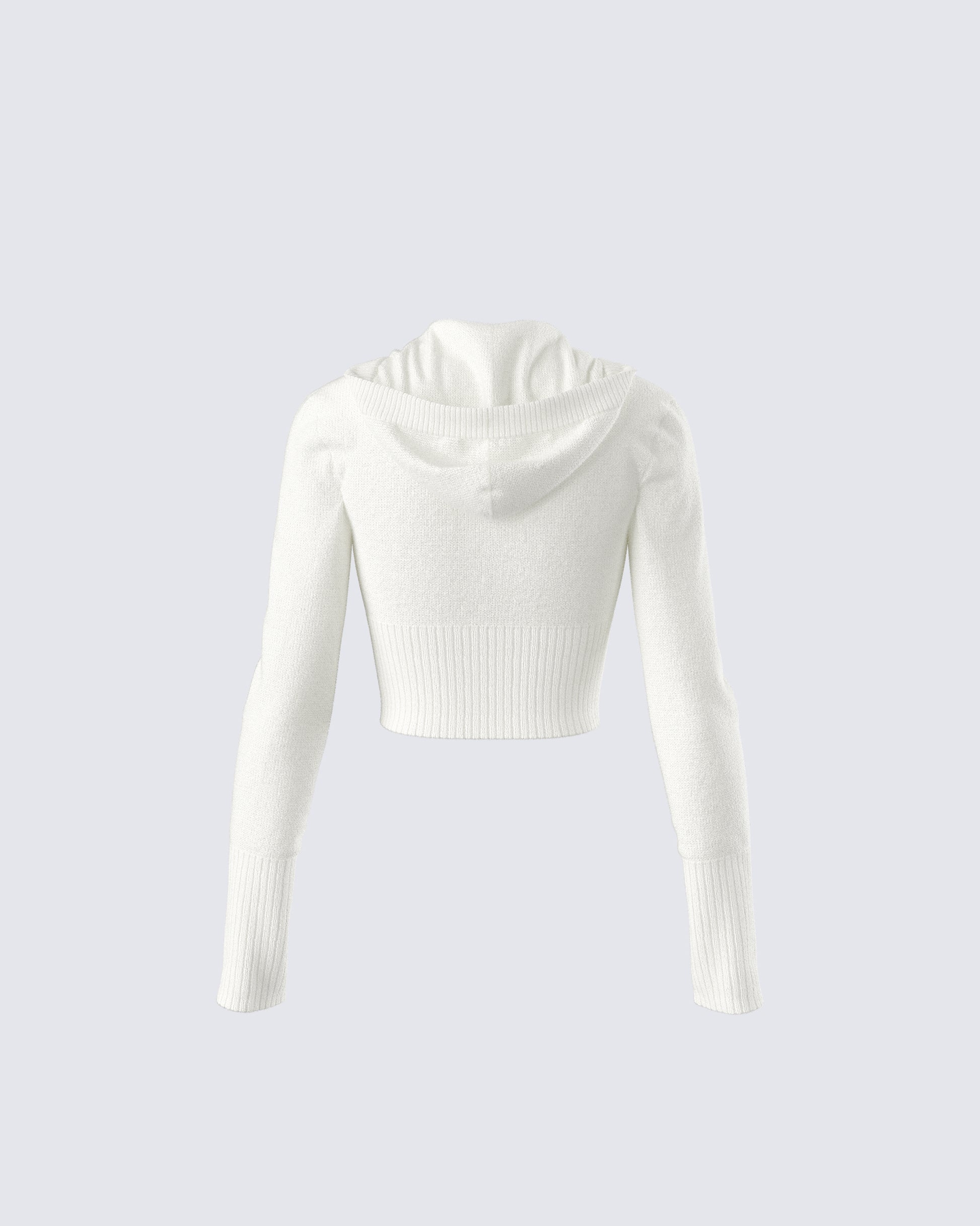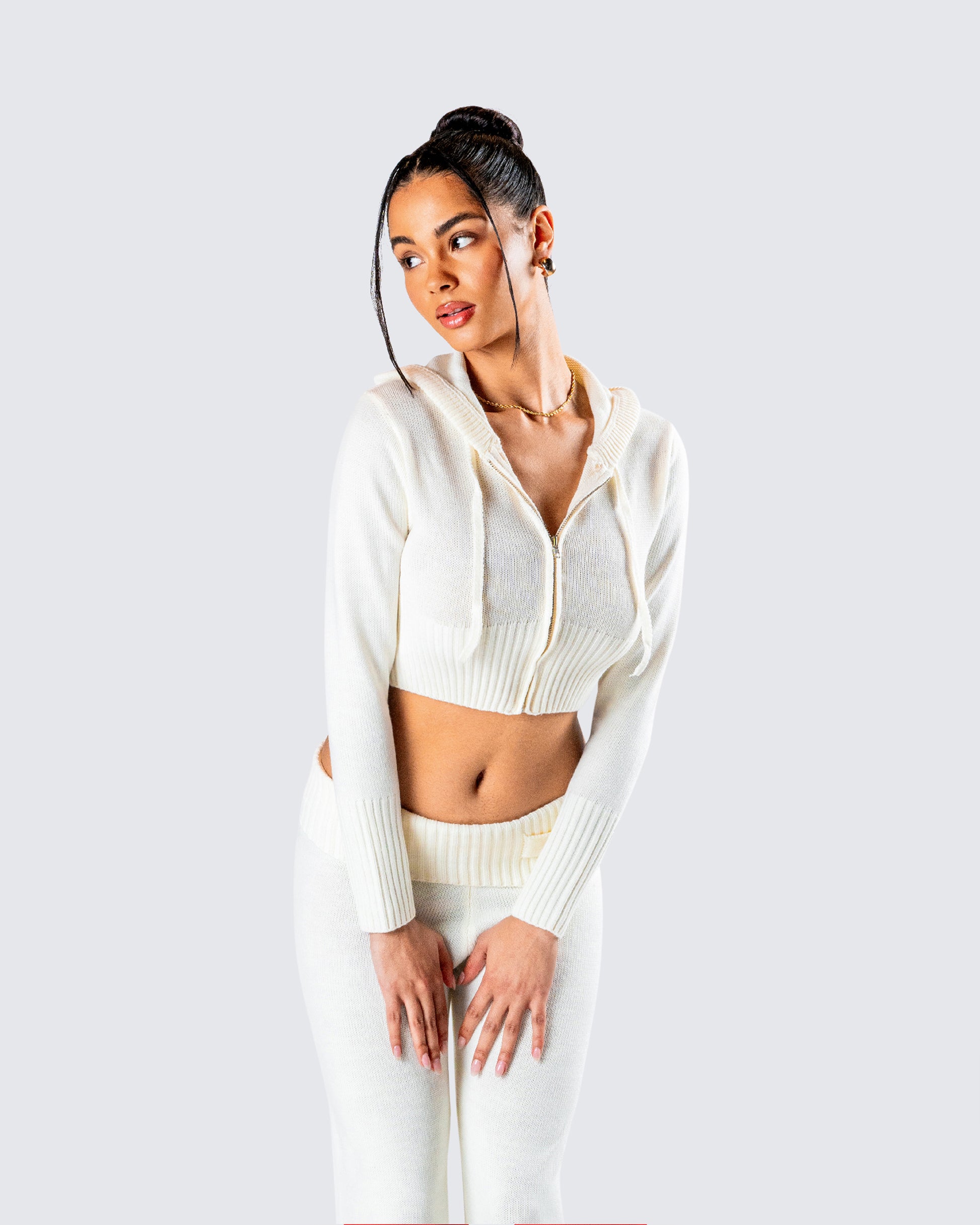 Say hello to your new fav essential 🤍 This white knit cropped jacket featuring a zip front, a rib hem, and extended long sleeves is perfect for keeping you hawt all day and night 😏