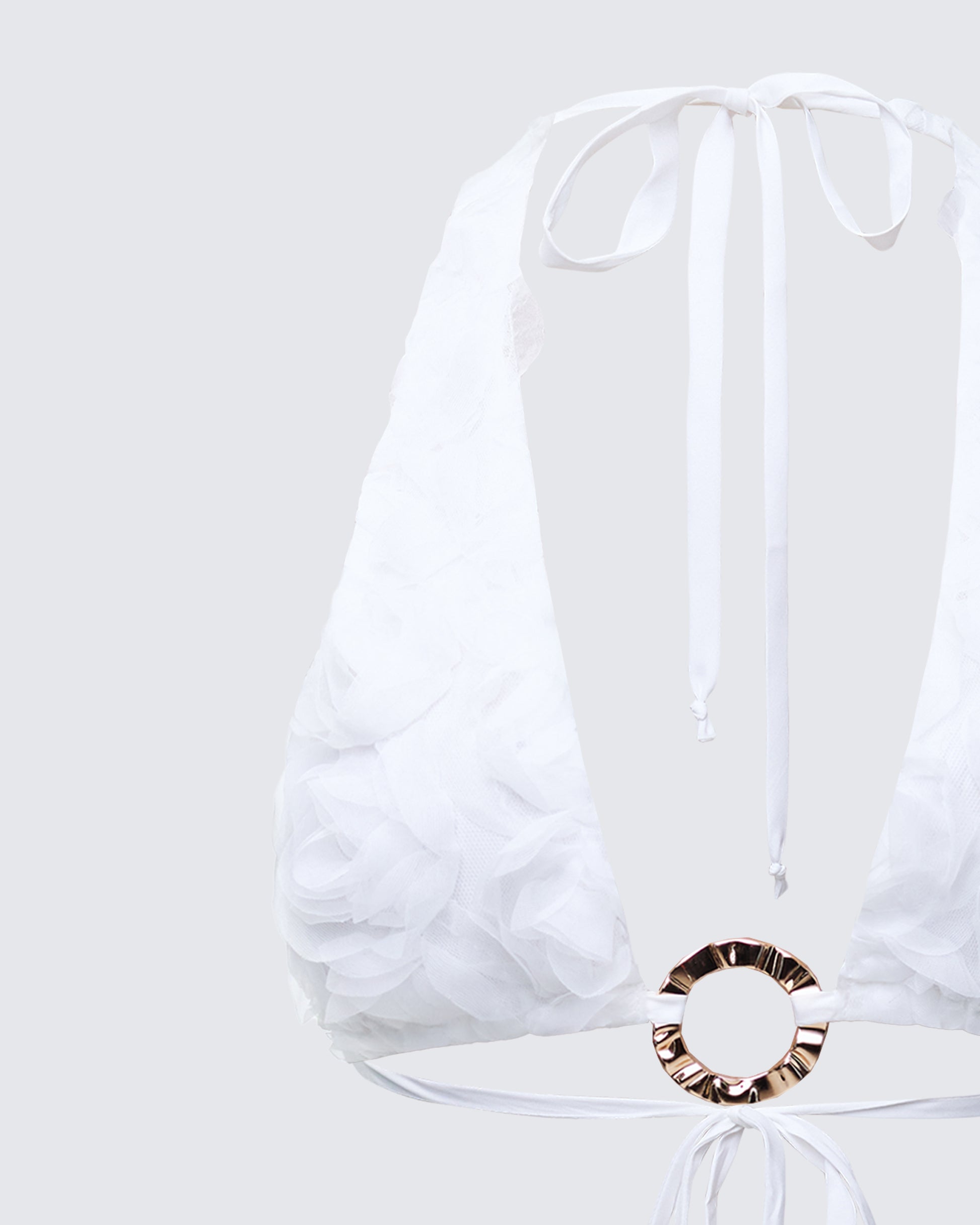Sweet… but not exactly subtle 😏 This halter-style triangle bra top blooms with soft 3D floral appliqués and a sculptural ring detail at the center. Romantic, flirty, and definitely the focal point 🤍