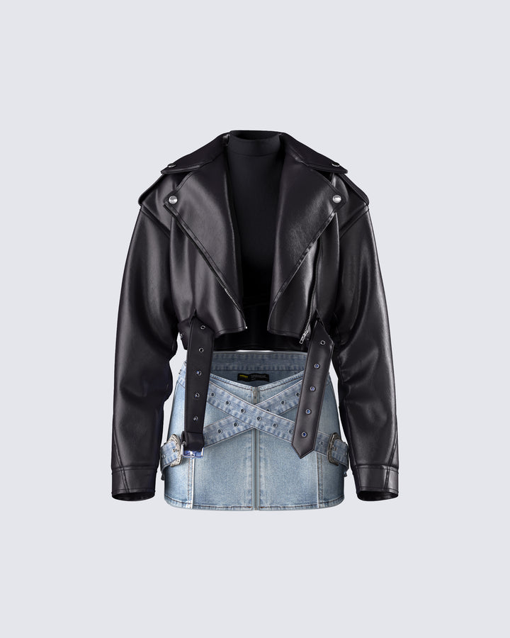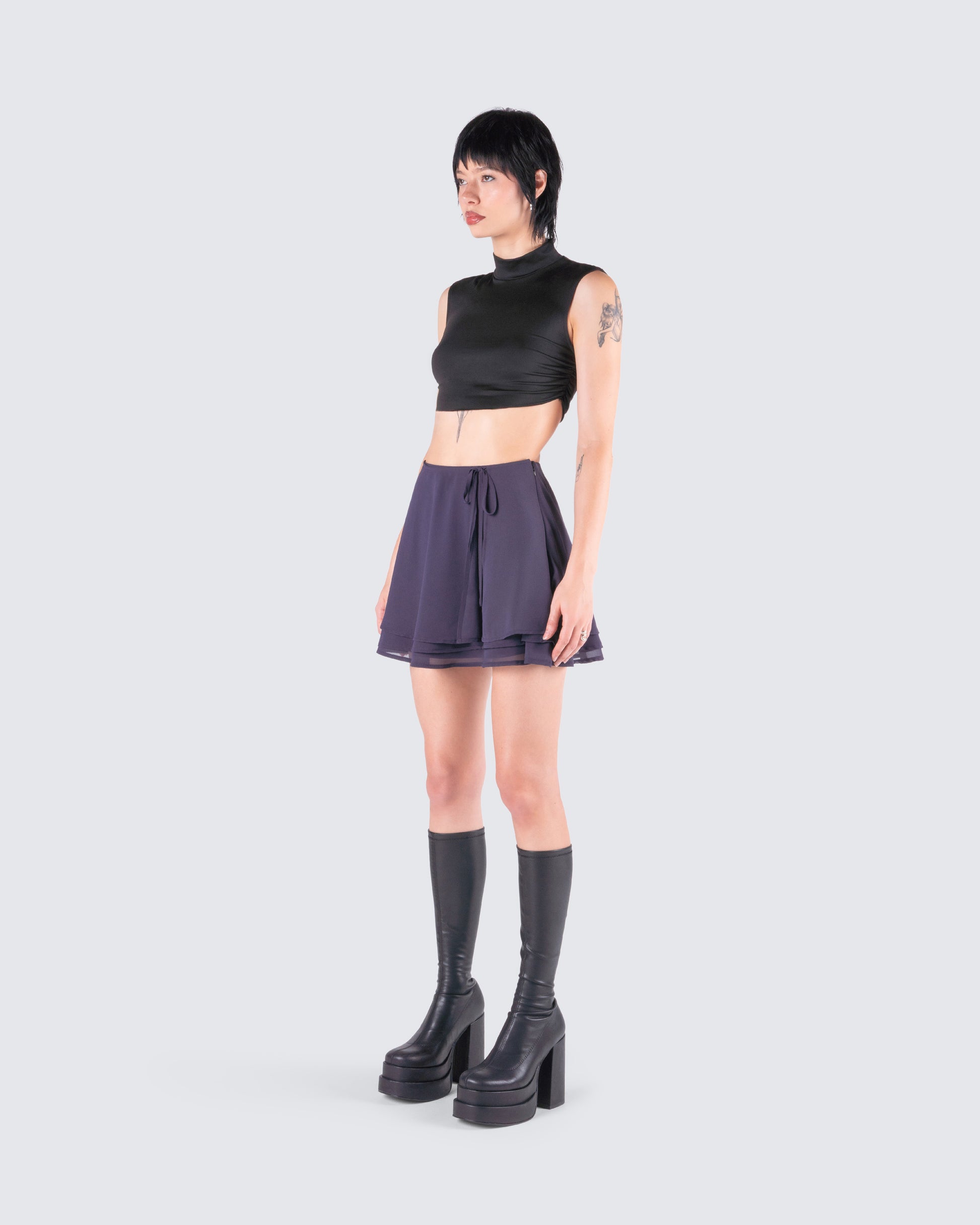 <p>Freya Black Turtleneck Crop Top: 95% Polyester 5% Spandex</p><p>Arpana Charcoal Layered Mini Skirt: 100% Polyester</p>