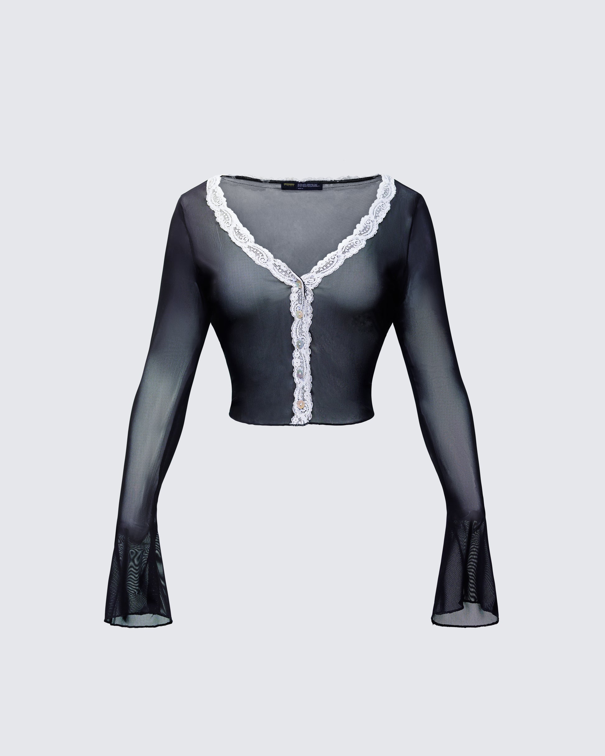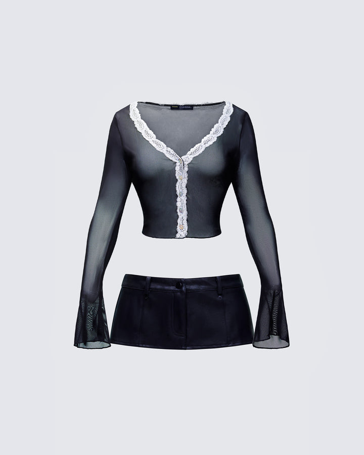 Sheer, sultry, and trimmed in lace for maximum tease 🖤 With a deep-cut neckline and flair sleeves, this top blurs the line between lingerie and nightlife…because why keep the good stuff hidden? 😜