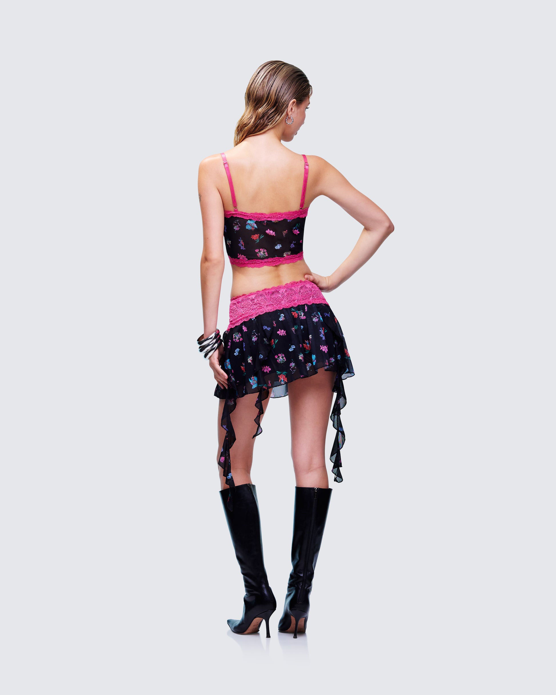 A set straight out of a dark fairytale π Perfect for keeping them hooked on you, this fit combines a black printed mesh cami with a matching mini skirt π€