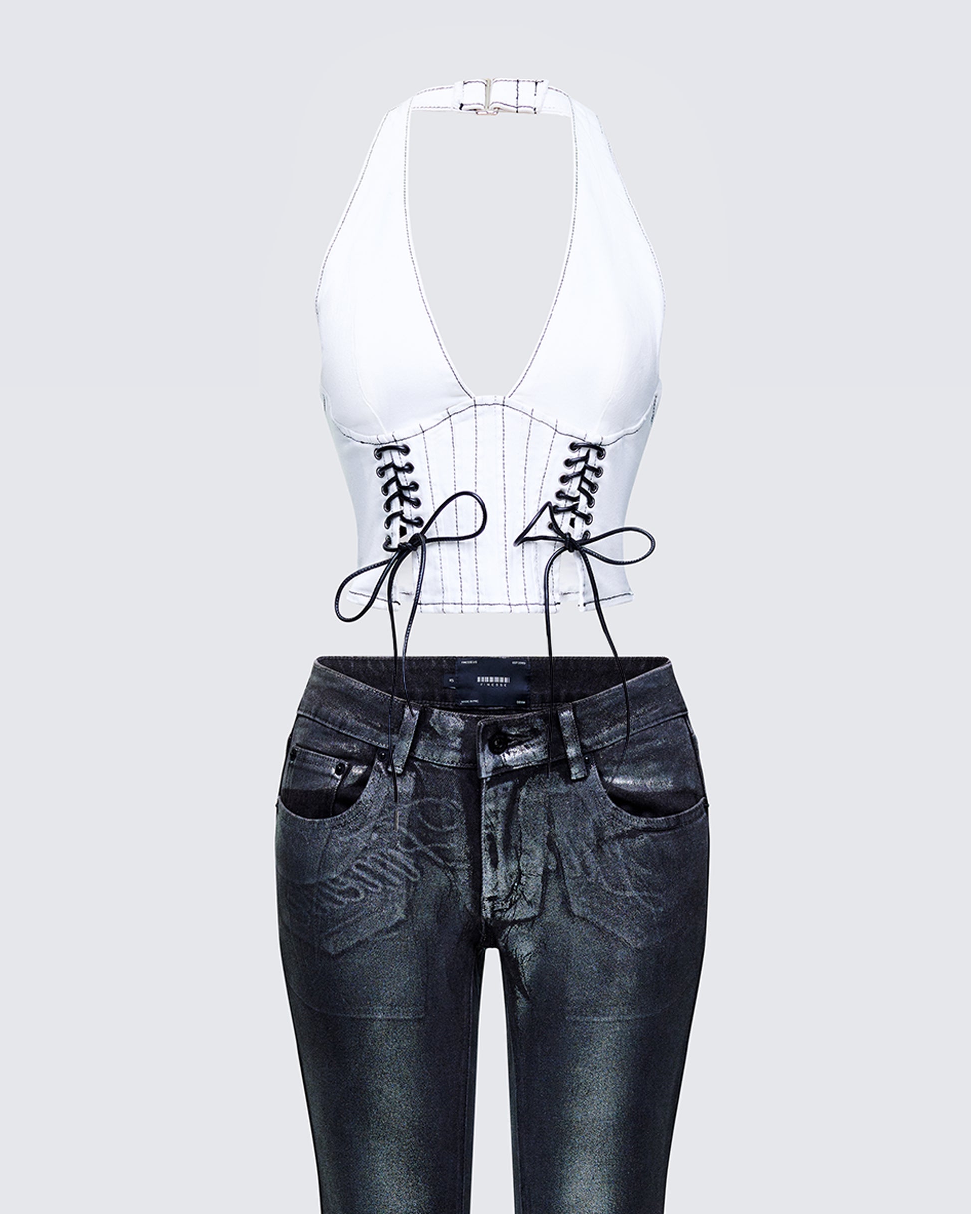 <p>Elettra White Denim Halter Top: 98% Cotton, 2% Elastane</p><p>Averi Black Denim Foil Graphic Jeans: 98% Cotton, 2% Spandex</p>