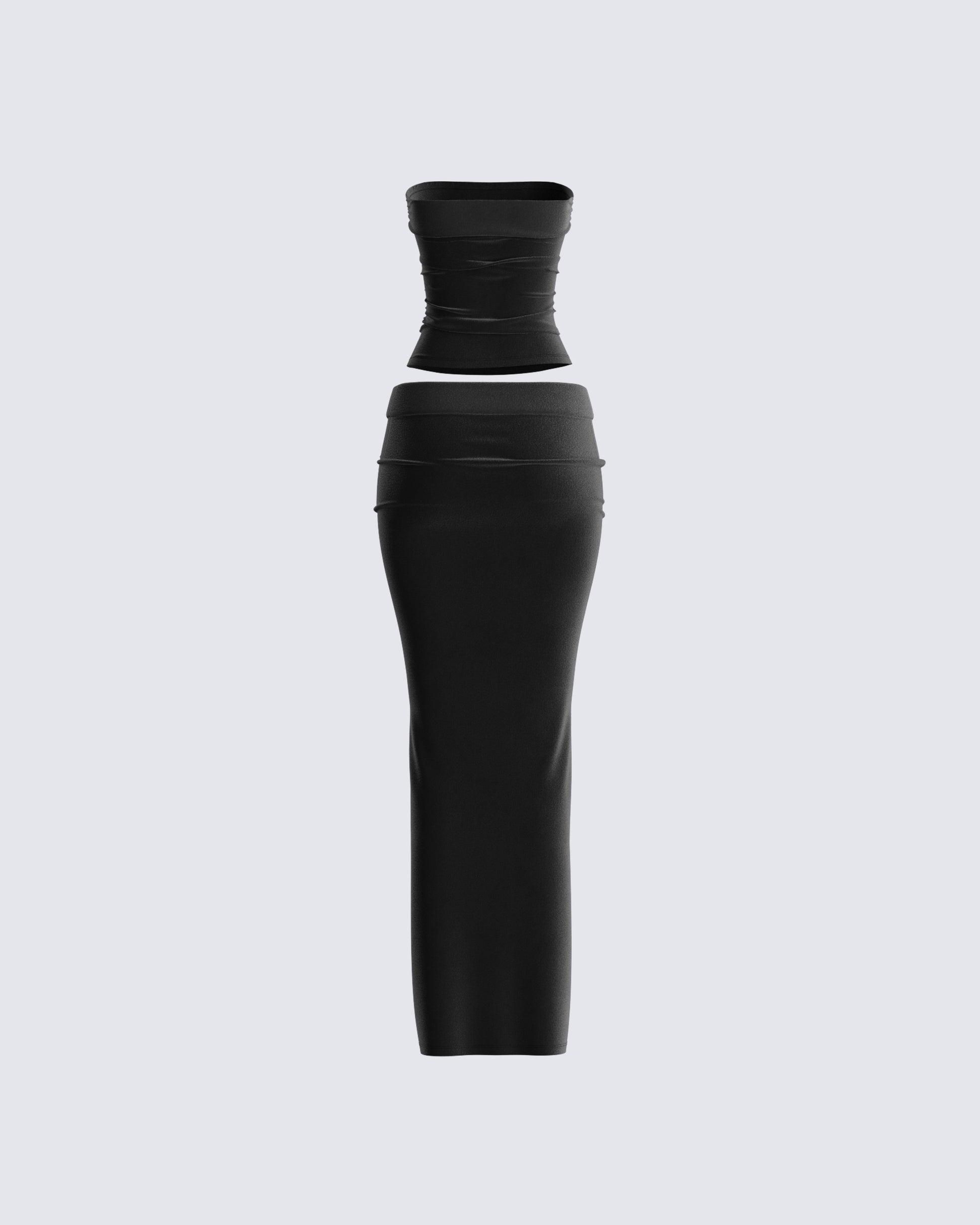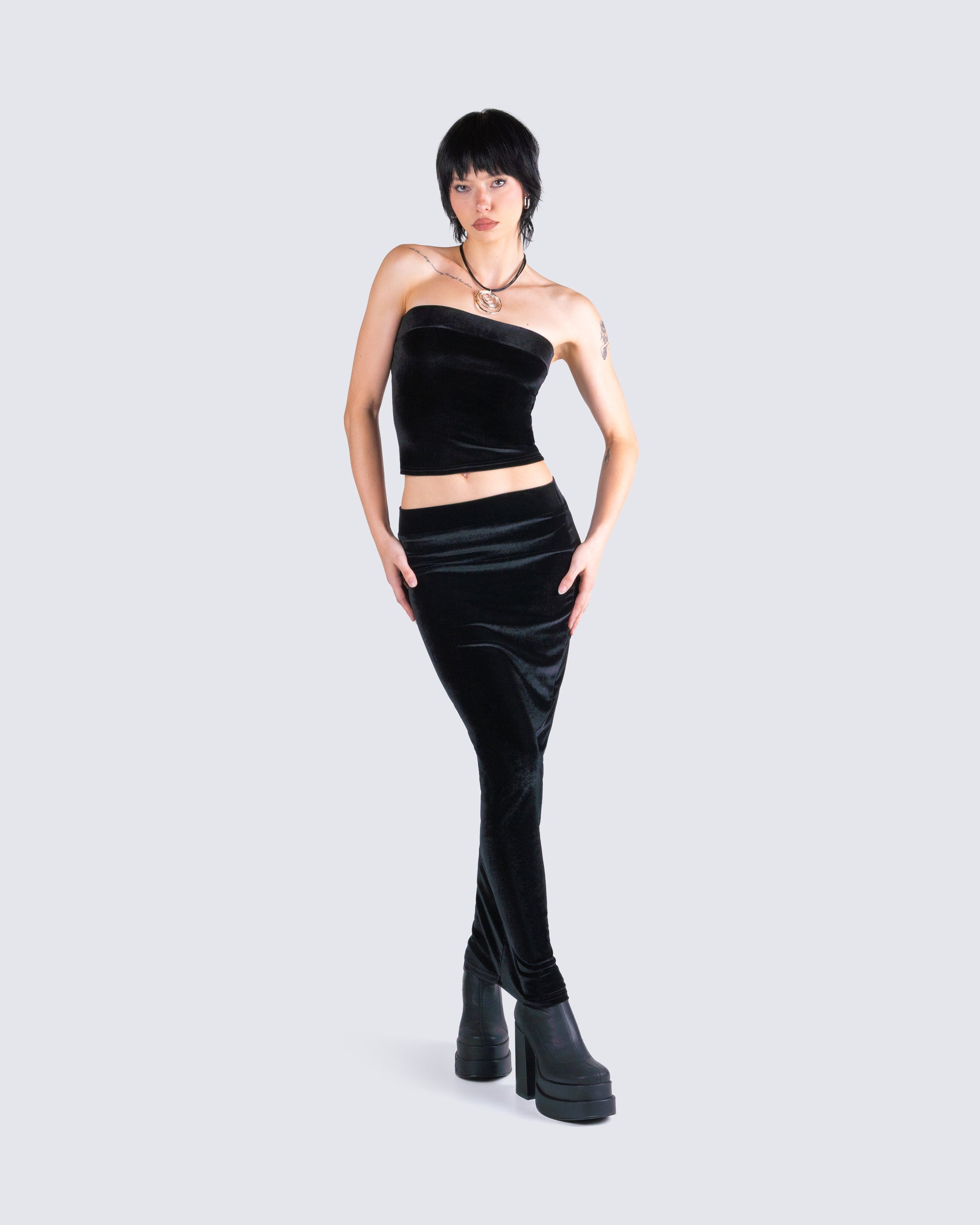 <p>Ayla Black Velvet Tube Top: 92% Polyesterļ¼8% Spandex</p><p>Ayla Black Velvet Maxi Skirt: 92% Polyesterļ¼8% Spandex</p>