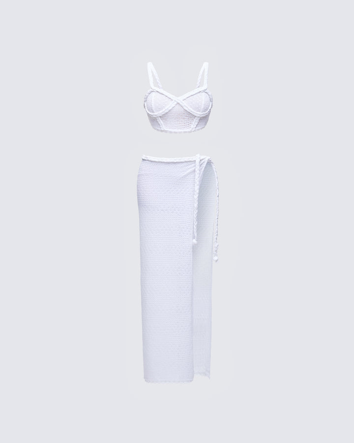 Somewhere between dressed and undressed, this hand-braided ivory top is that effortless in-between 😚 With a see-through texture, bustier shaping, and braided outline, this top is your go-to for looking hot while staying cool 🤍