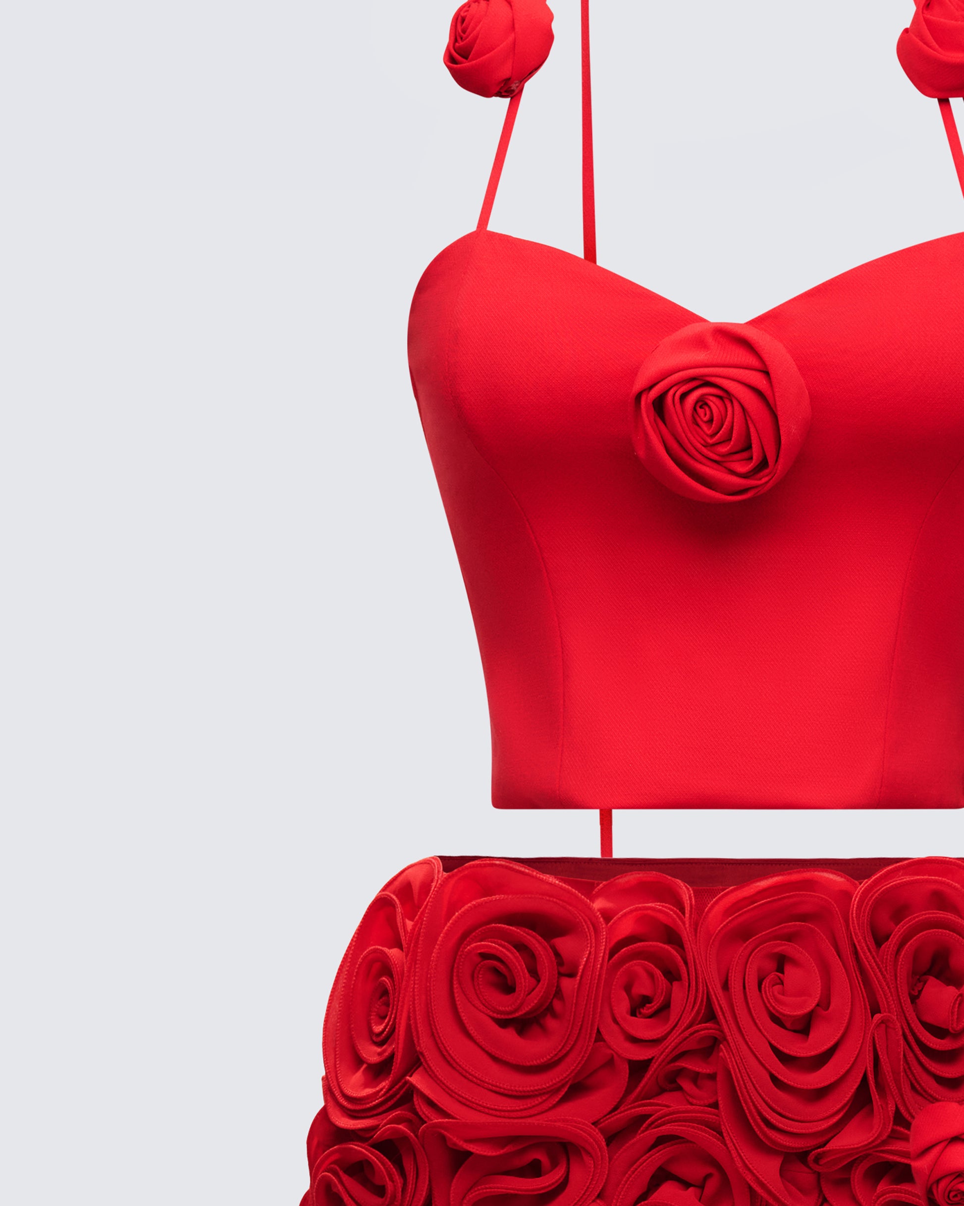 <p>Bellerose Red Rose Detail Halter Corset Top: 58% Polyamide, 36% Viscose, 6% Spandex <br>Lining: 97% Polyester, 3% Spandex<br>Tayah Red Ruffle Applique Mini Skirt: 95% Polyester, 5% Spandex</p>