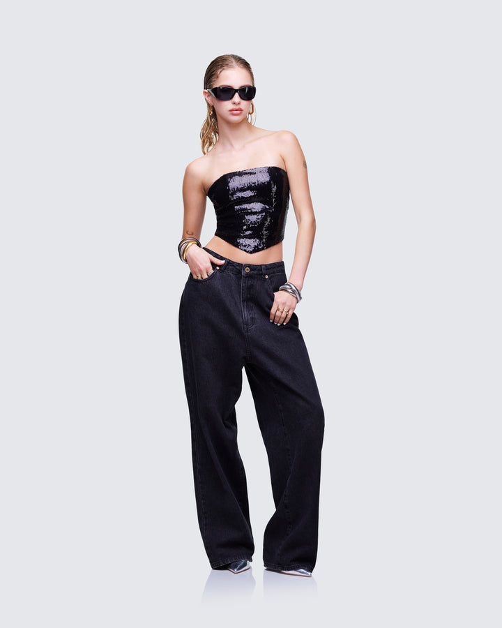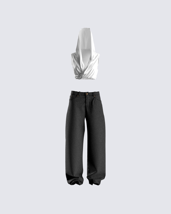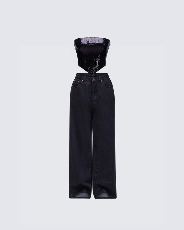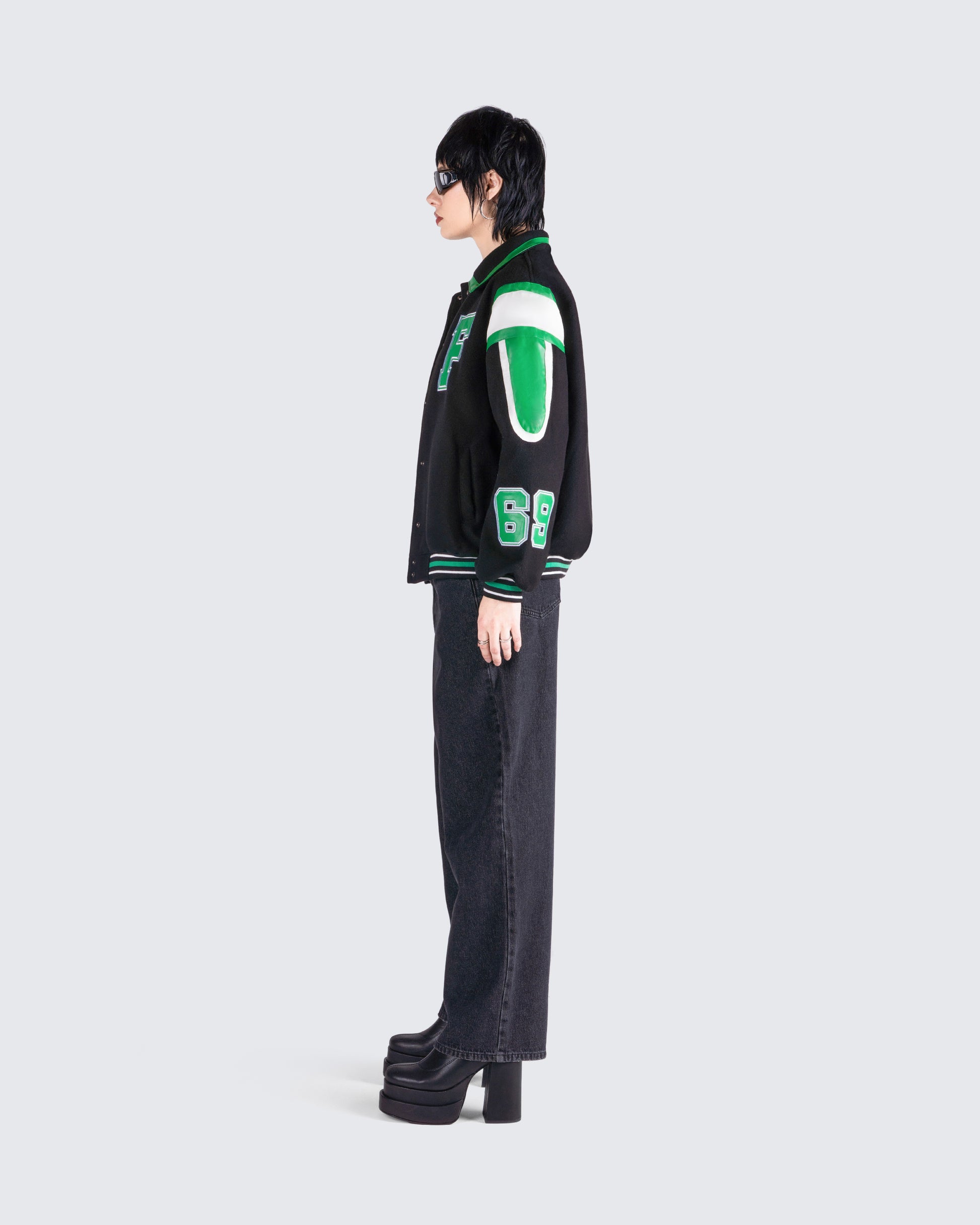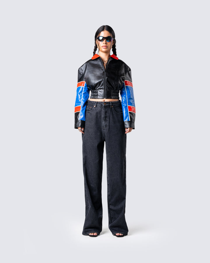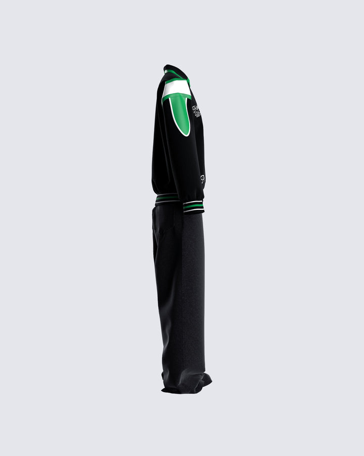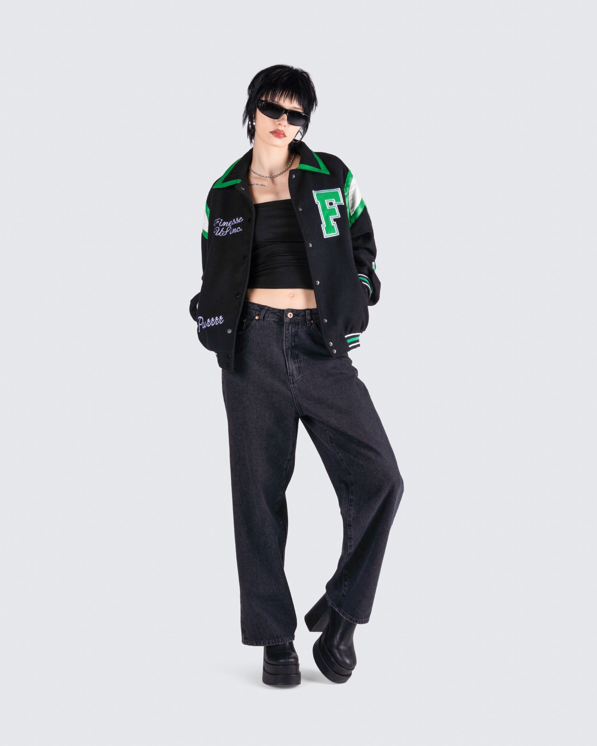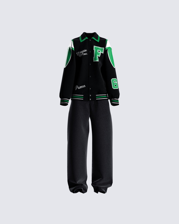 The vibes are... stylish, and bada*s 🙌 This two-piece set featuring a black jersey tube top, a black varsity jacket, and black-washed balloon pants will have everyone trying to get on your level 🖤
