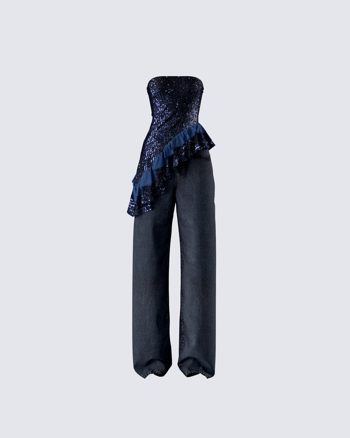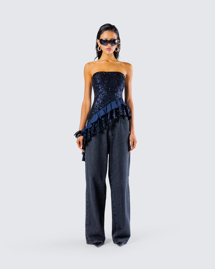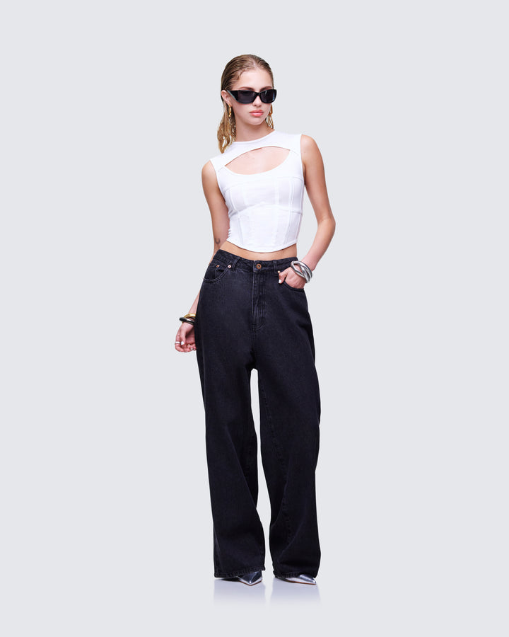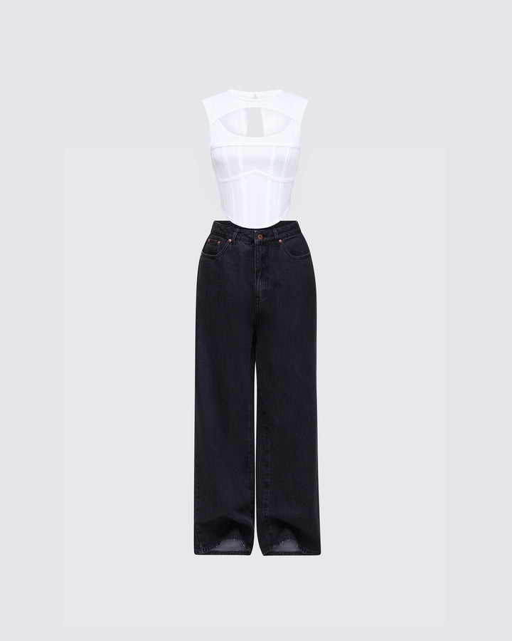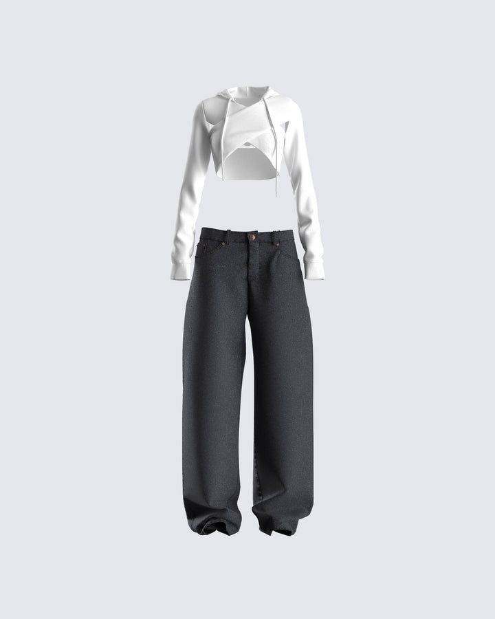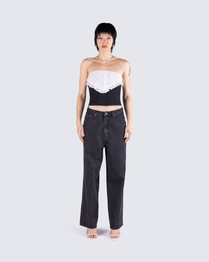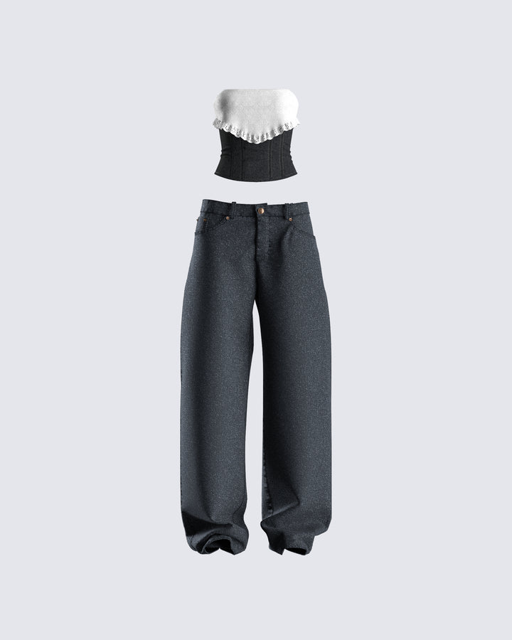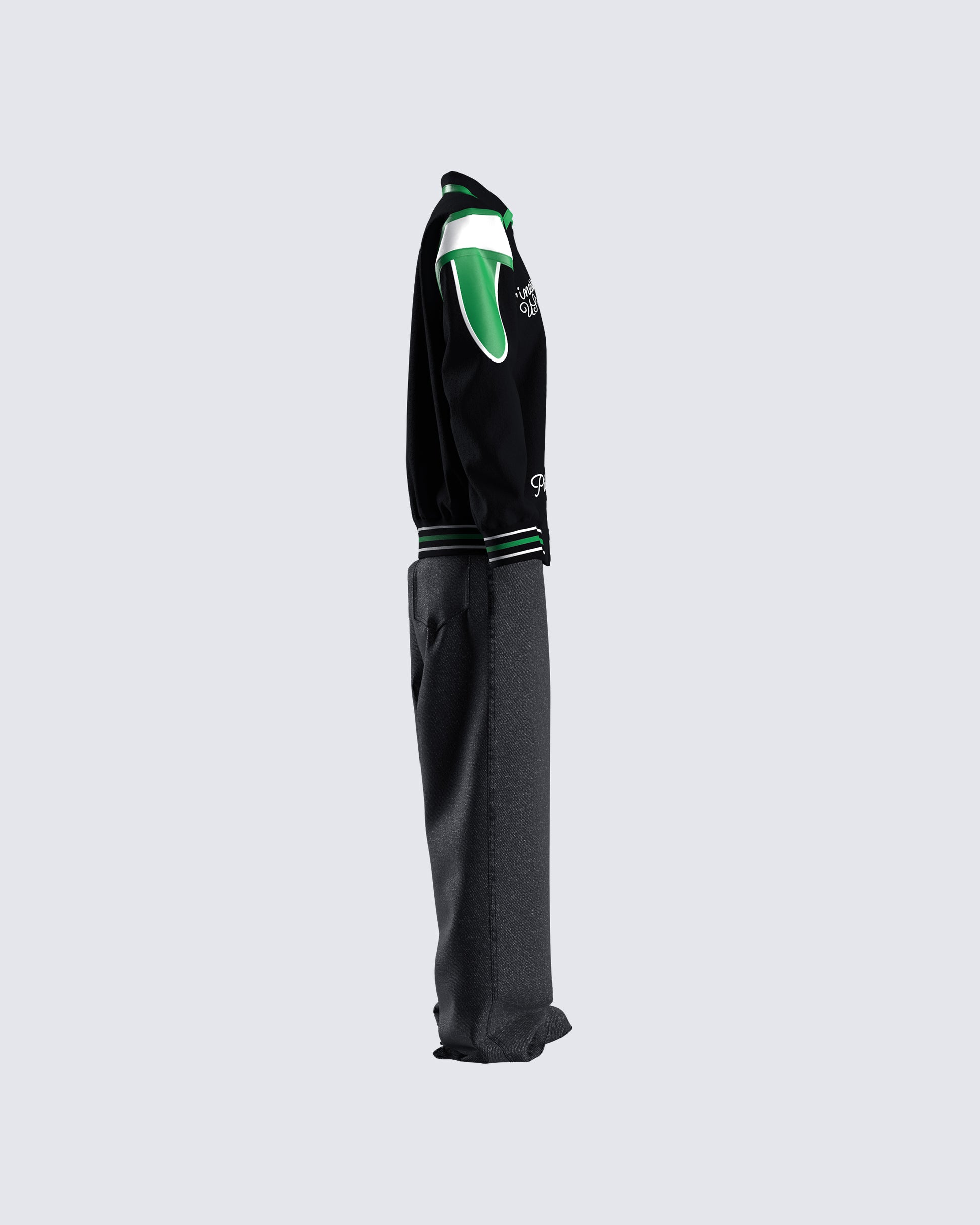 The vibes are... stylish, and bada*s 🙌 This two-piece set featuring a black jersey tube top, a black varsity jacket, and black-washed balloon pants will have everyone trying to get on your level 🖤