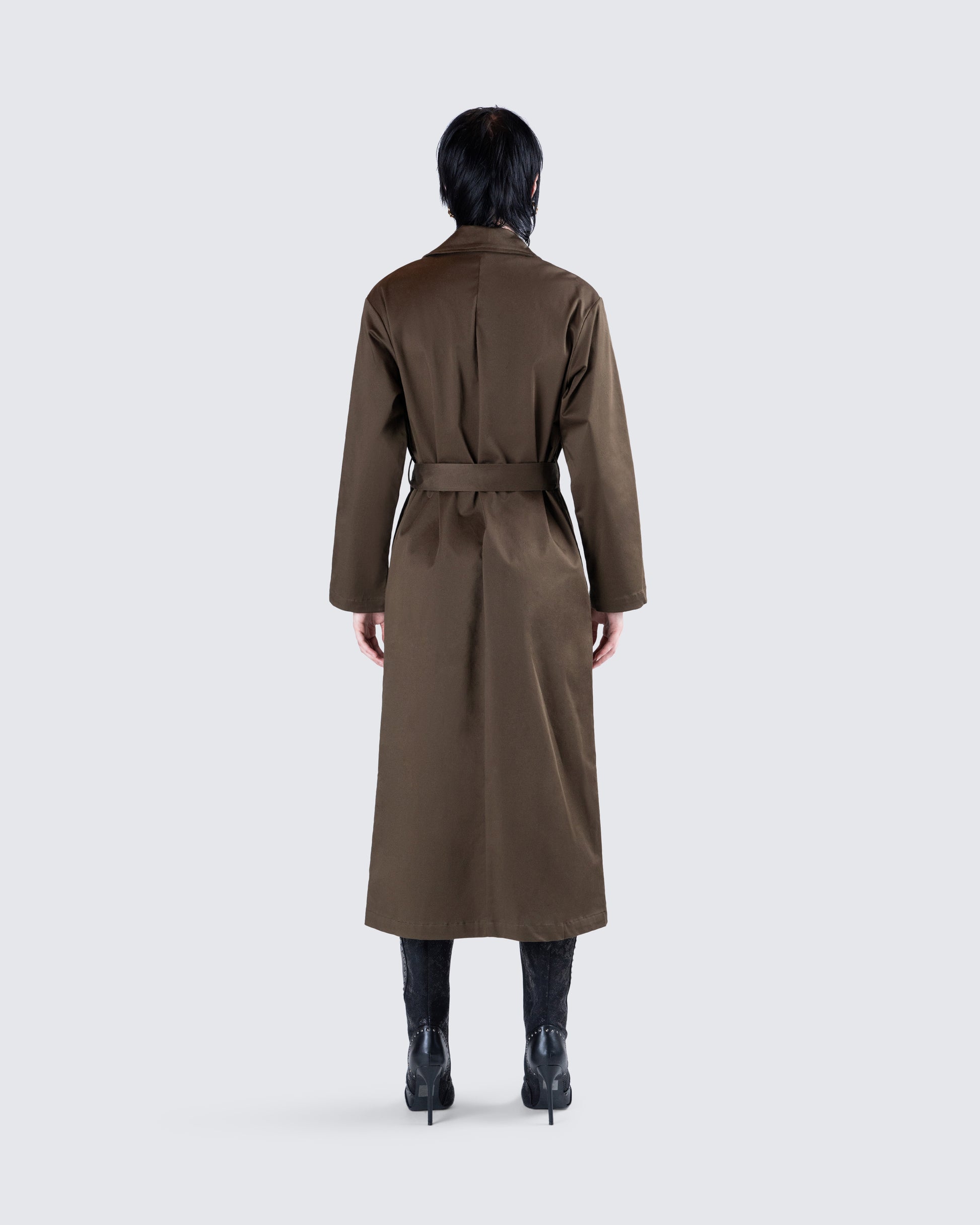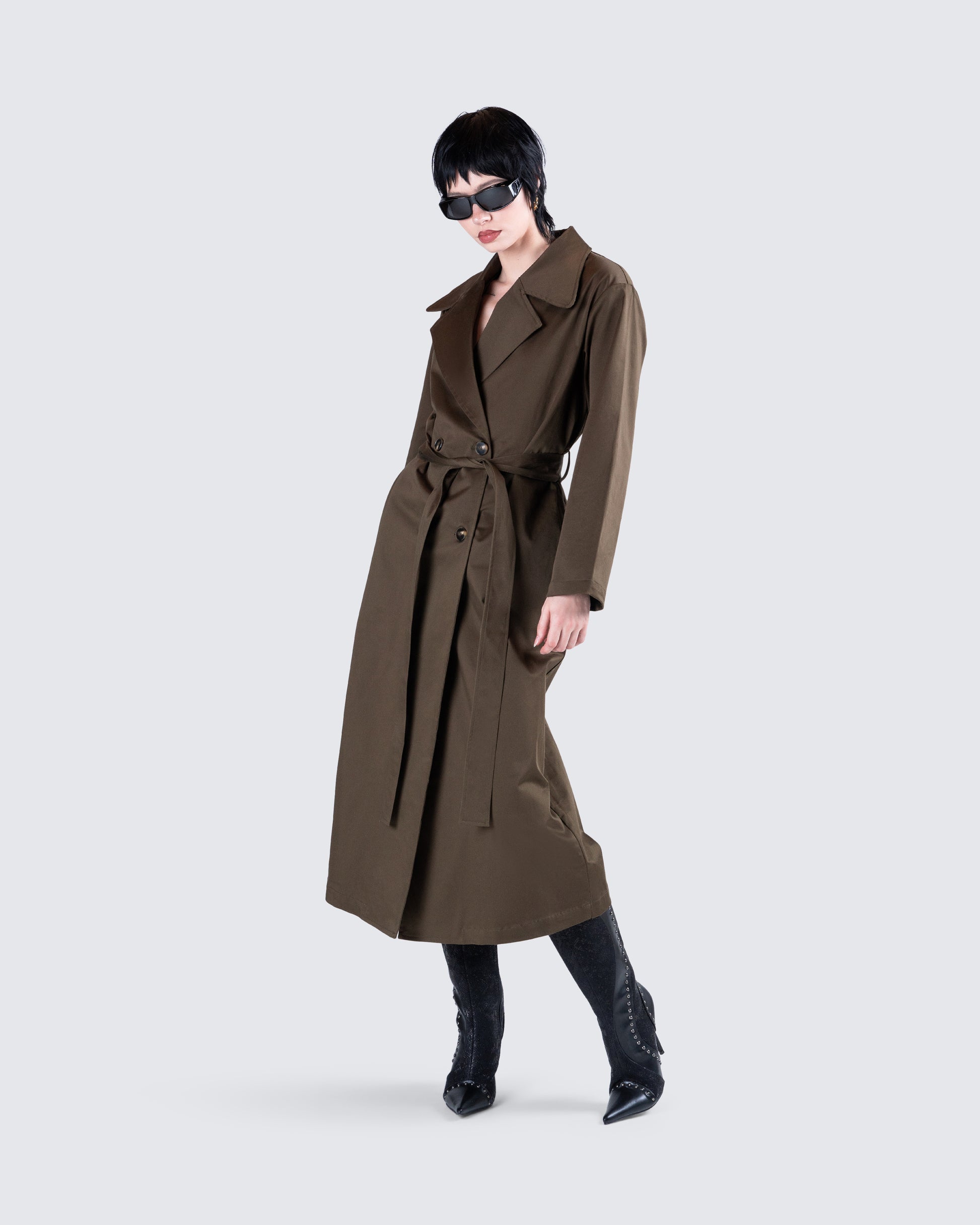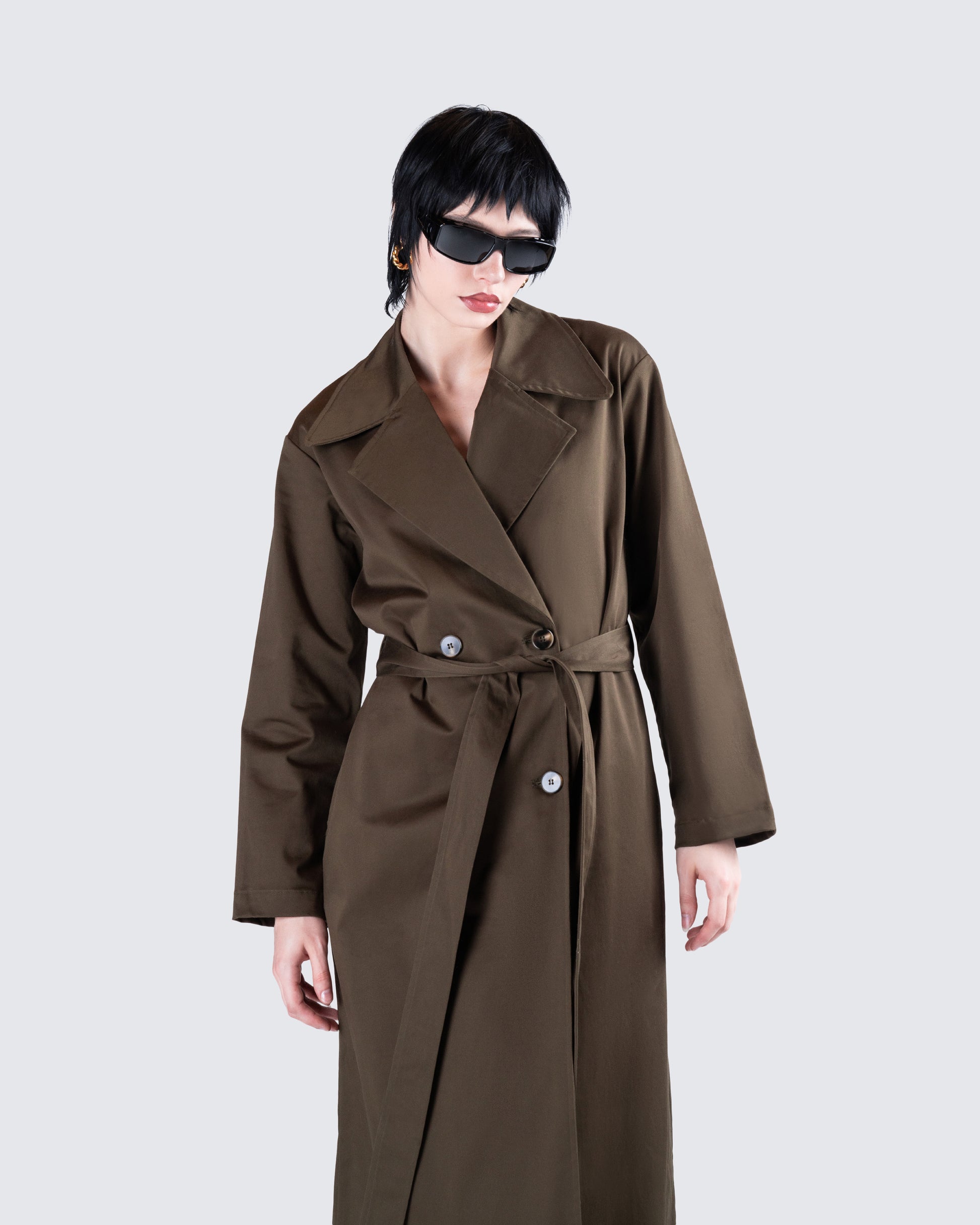 Attitude, sophistication, and boldness all in one 😌 Own the day in this dark olive belted trench coat. Made from cotton twill and complete with an adjustable belt for a structured and flattering look 🖤