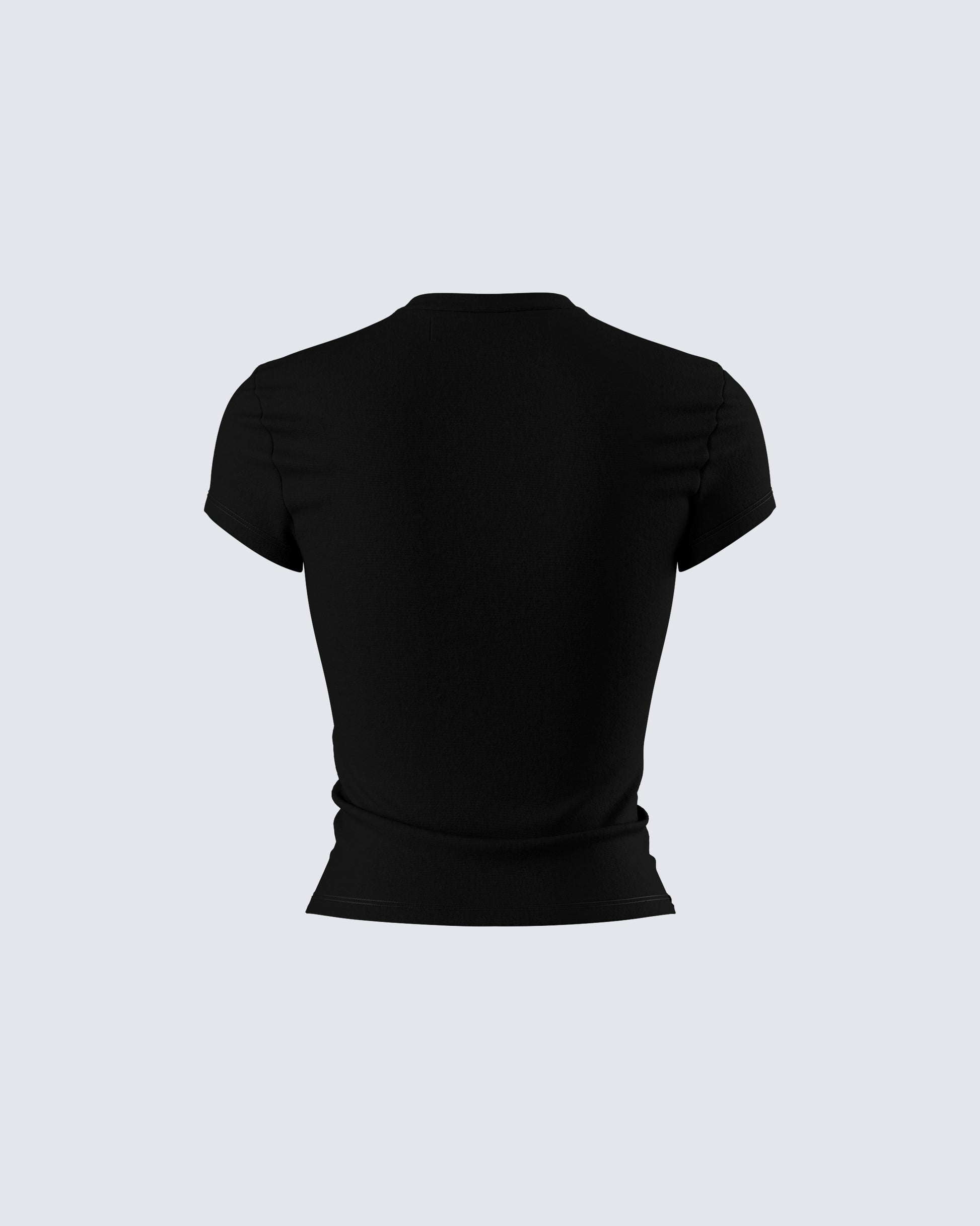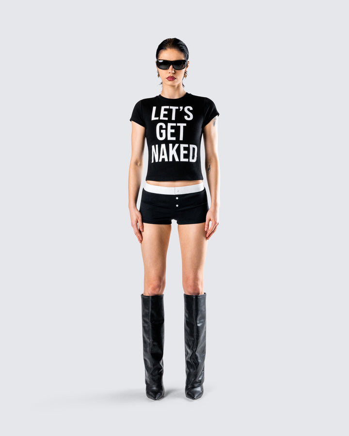 Let’s get naked 🖤 Let them know the vibes in this black graphic top. Made from stretch cotton jersey fabric, this piece won't be staying on for too long 😜