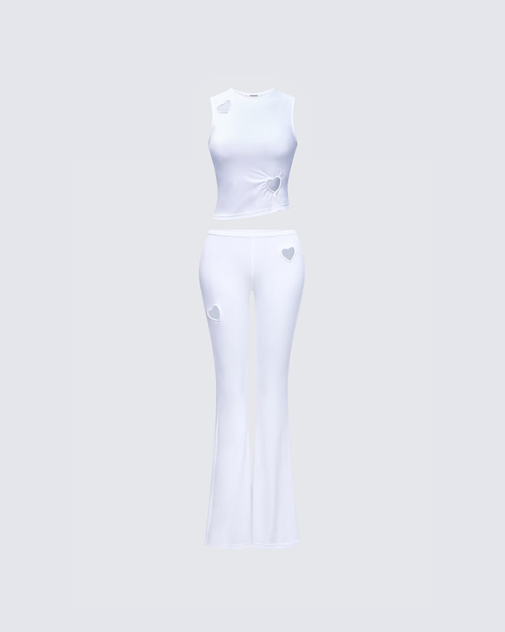 <p>Cora White Jersey Heart Detail Top: 75% Polyester, 25% Spandex</p><p>Ayra Pink Acid Wash Denim Flared Pants: 98% Cotton, 2% Spandex</p>