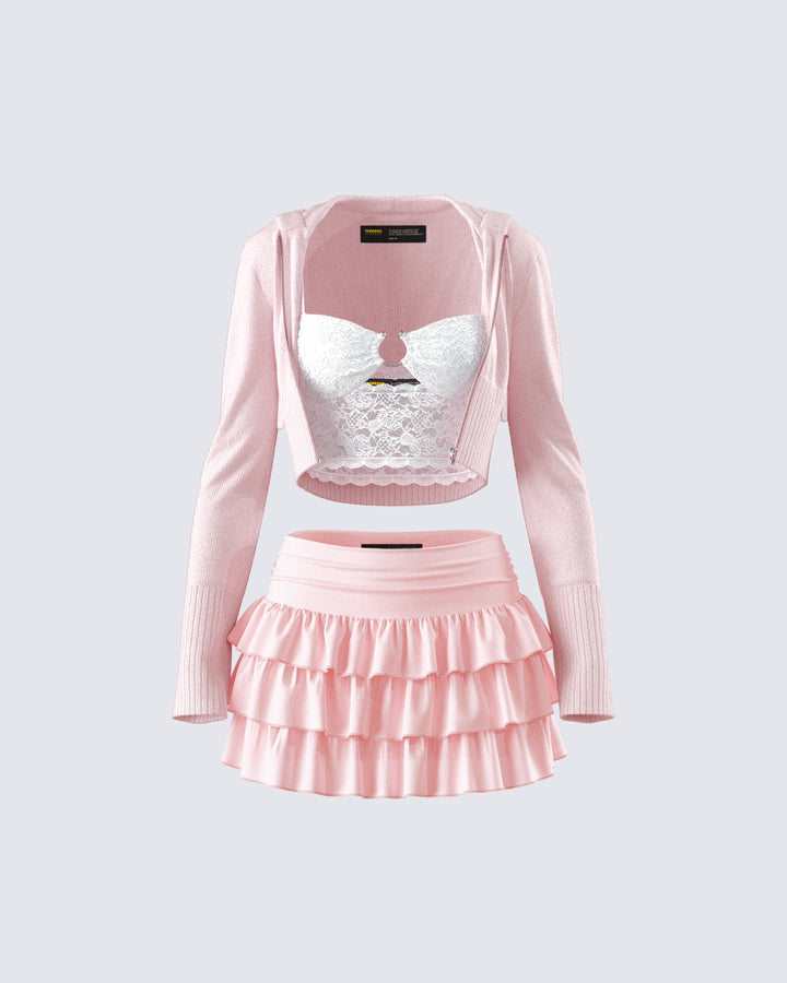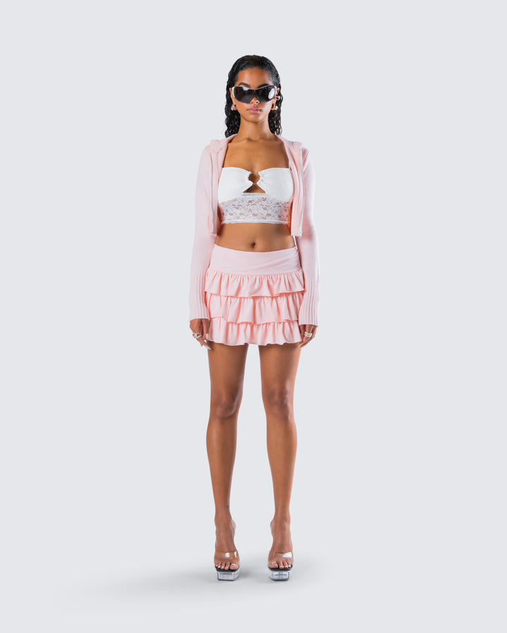 Pink + ruffled + mini = the perfect skirt, period 💗 Featuring a low rise fit, three tiered ruffles, and ruched detailing at the waistband - this skirt, made from jersey fabric, is the perfect sweet girl staple 😊