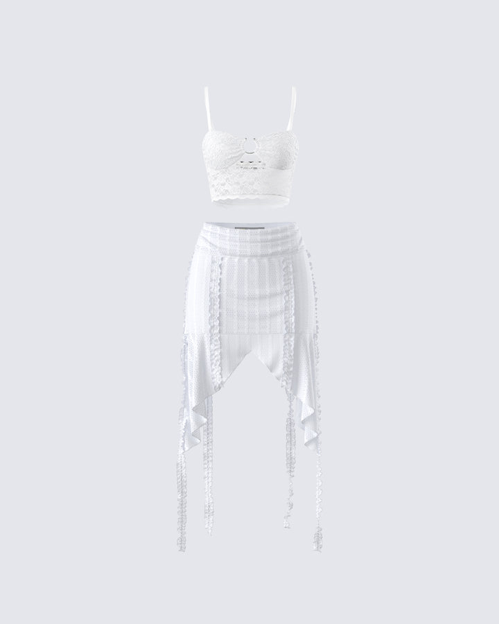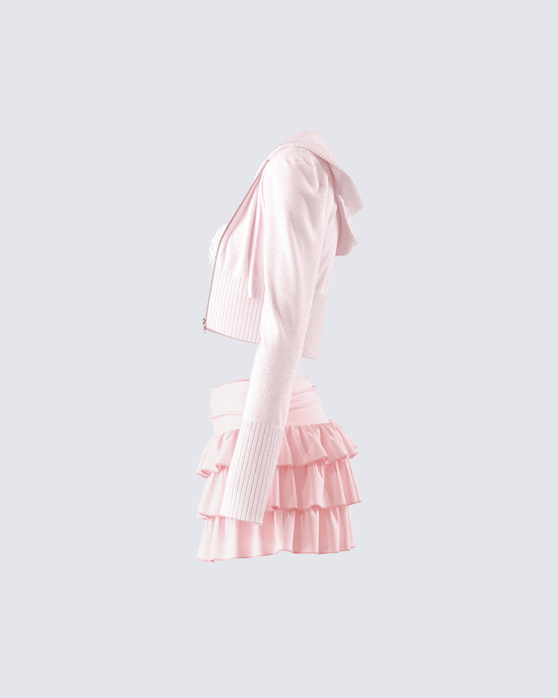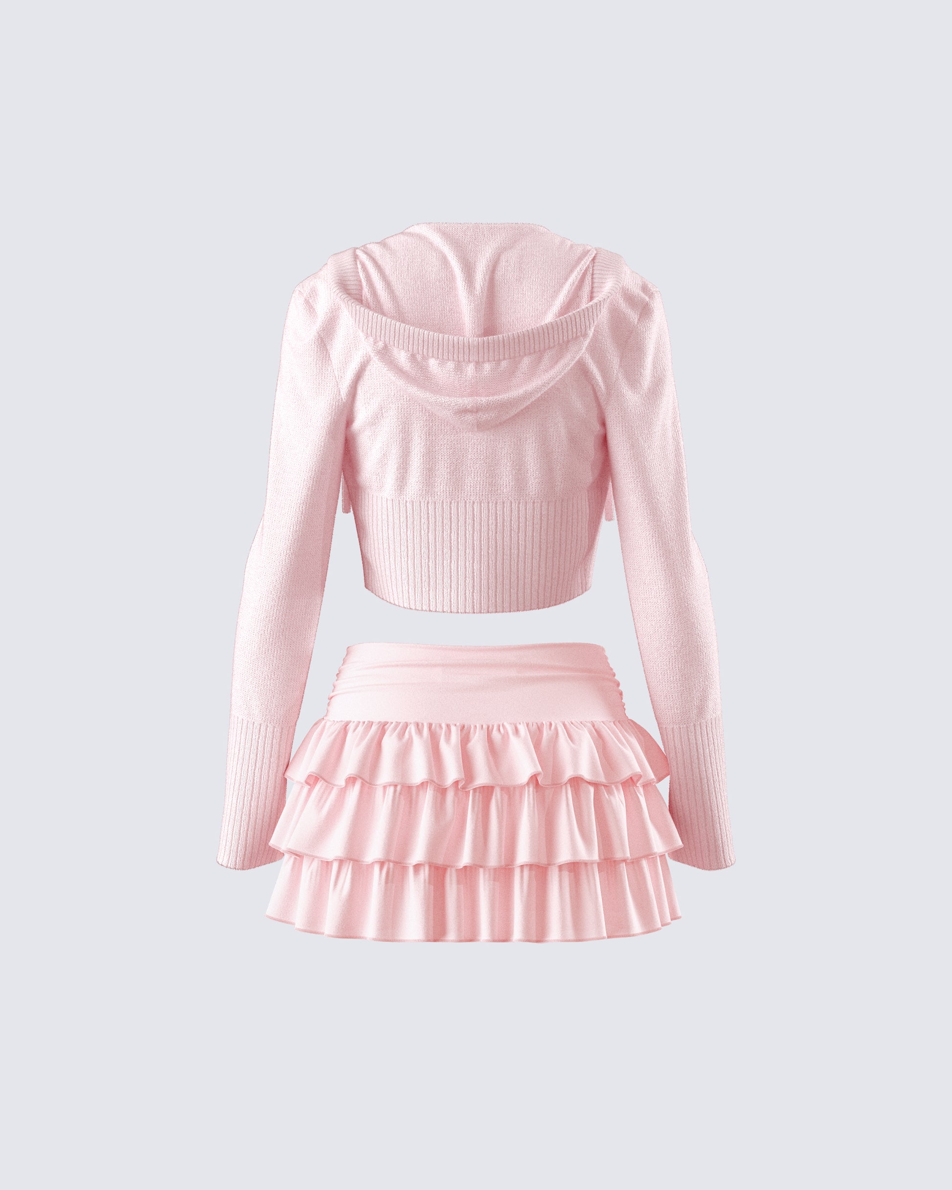 This one’s for all of our sweet girlies with an attitude problem 😜 Pairing a pink knit cropped jacket with a white lace cami top and a pink ruffle mini skirt - this three-piece set is serving a chic and sassy Y2k vibe 💅