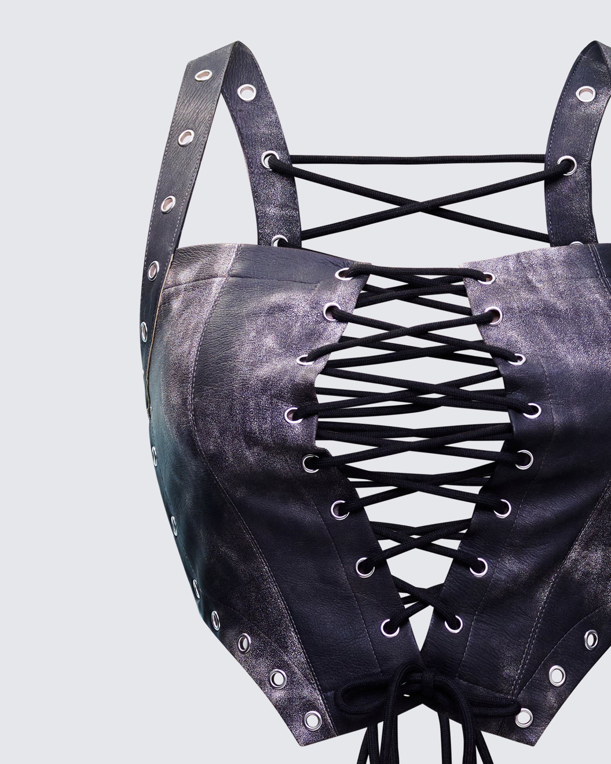 Lace me like you mean it 🖤 A sculpting faux-leather corset with a tie-front, eyelet trim, and a backless, criss-cross finish — this is a top tailored to tease 😉