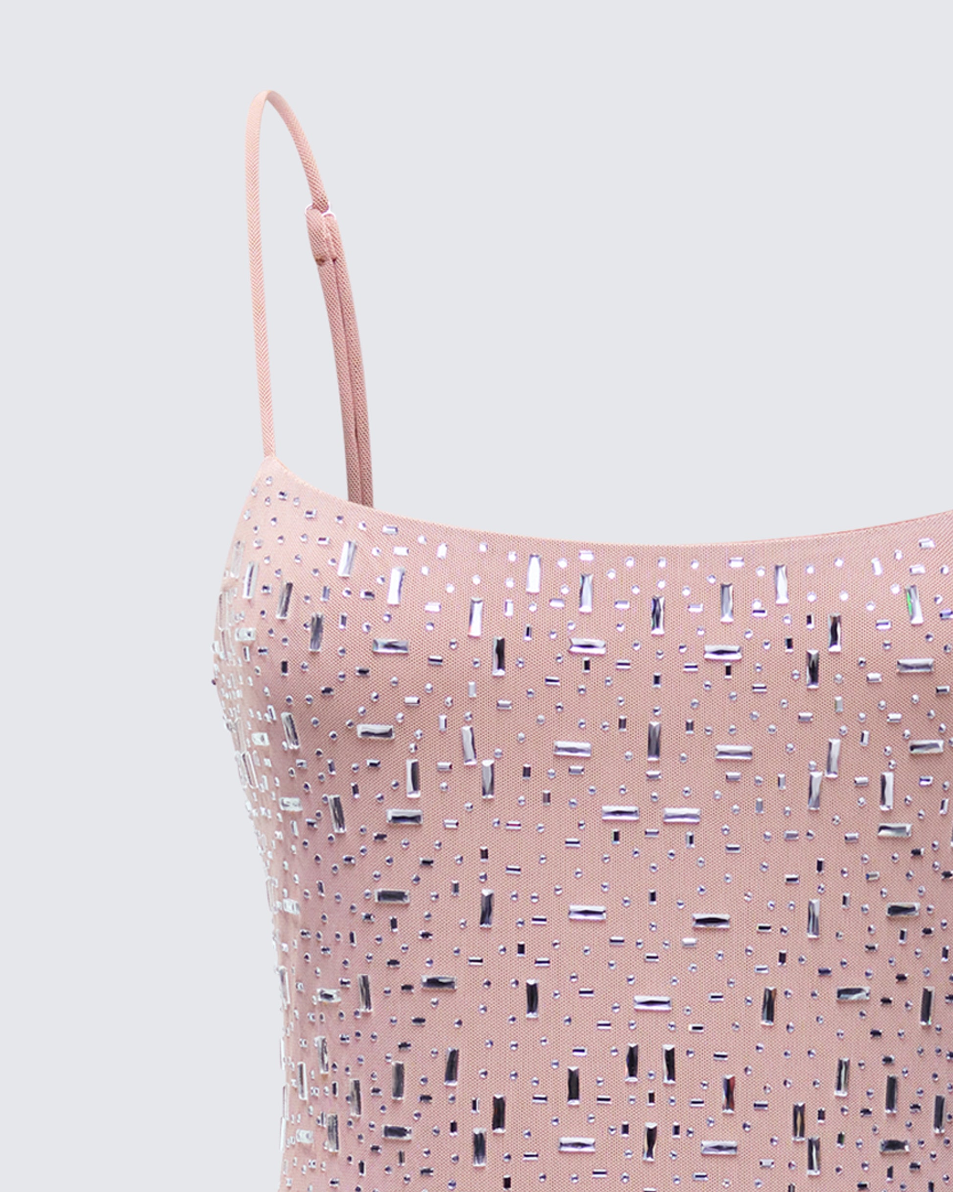Shine brighter than they ever could in this gorgeous nude rhinestone mini dress Constructed from glass rhinestones on power mesh fabric, and complete with adjustable spaghetti straps and a handkerchief hem, this piece will turn you into the star of every occasion 🤩