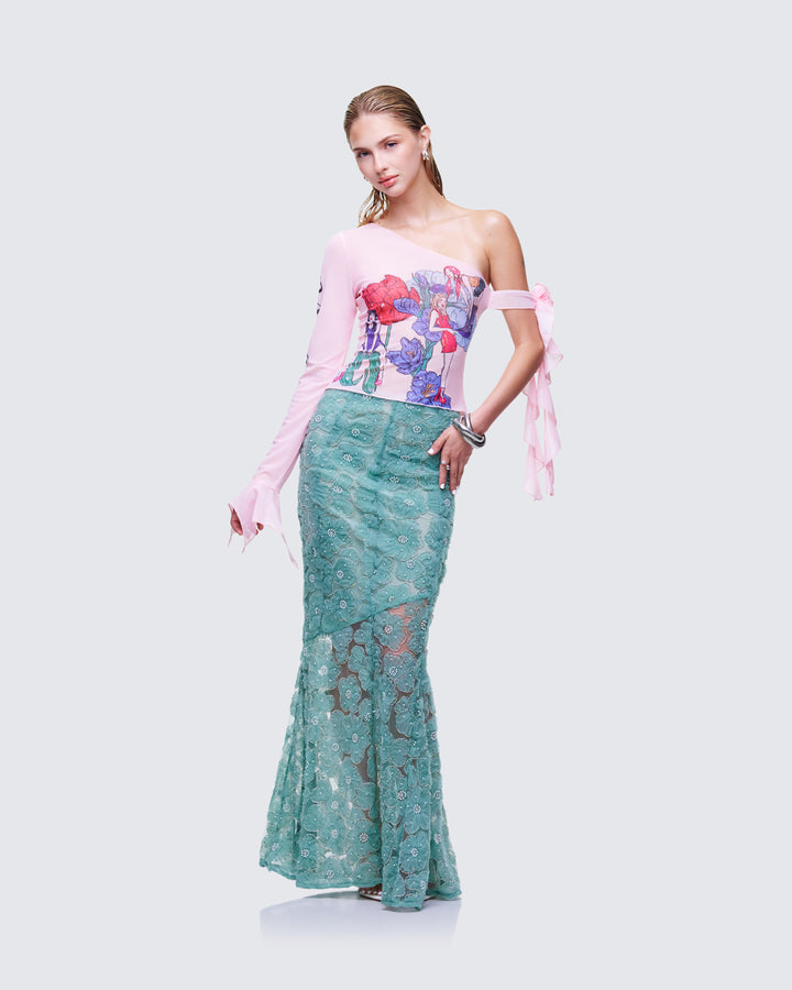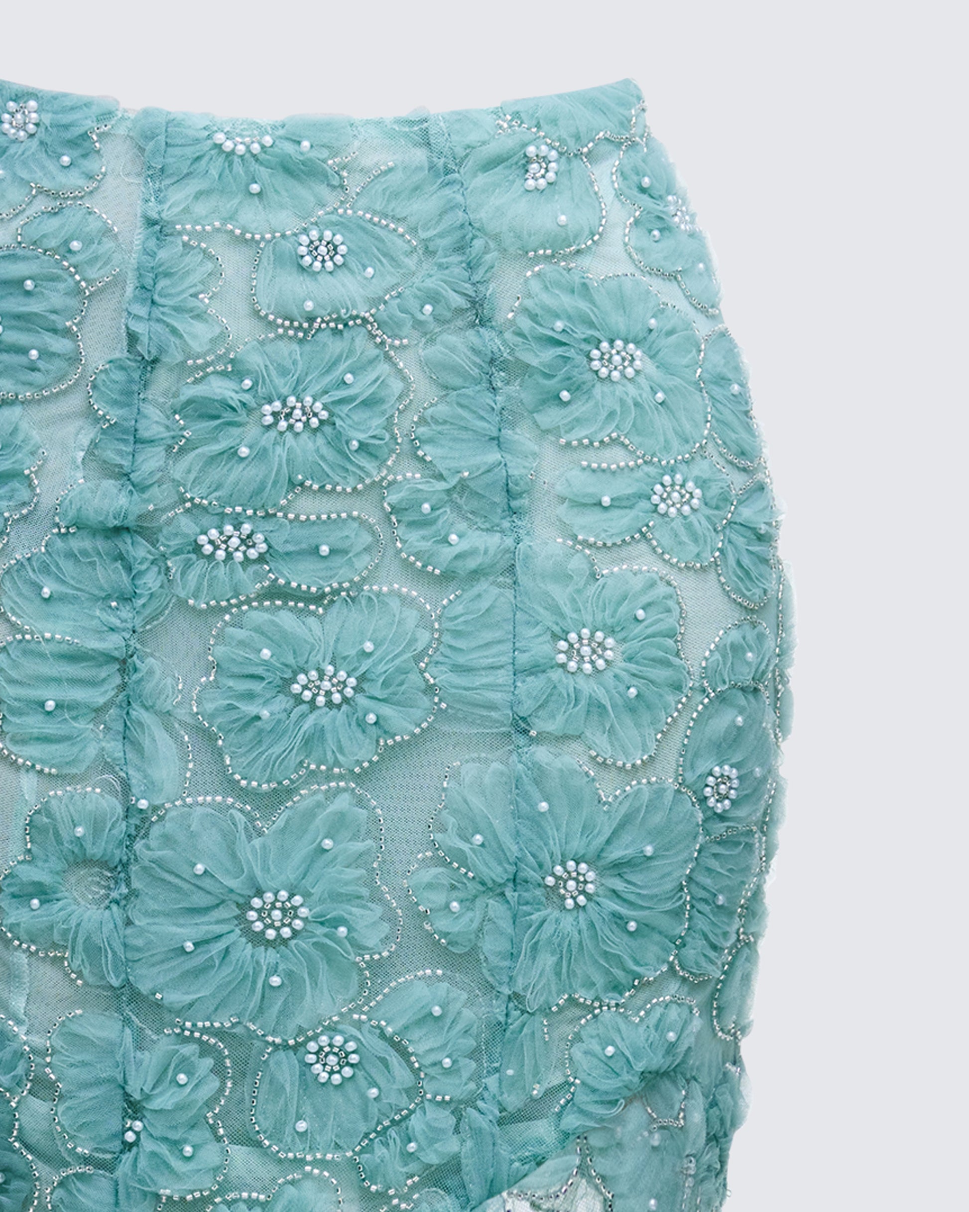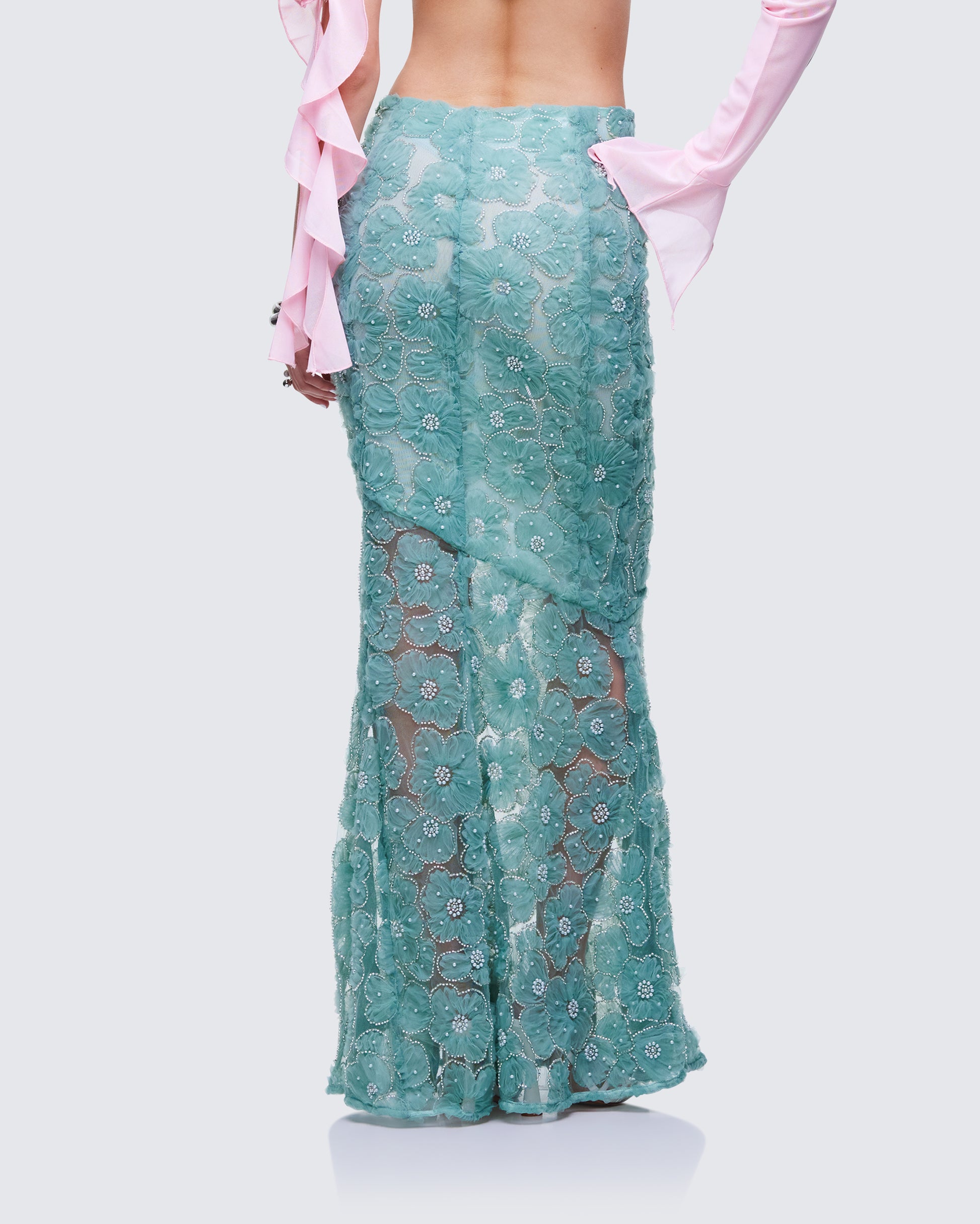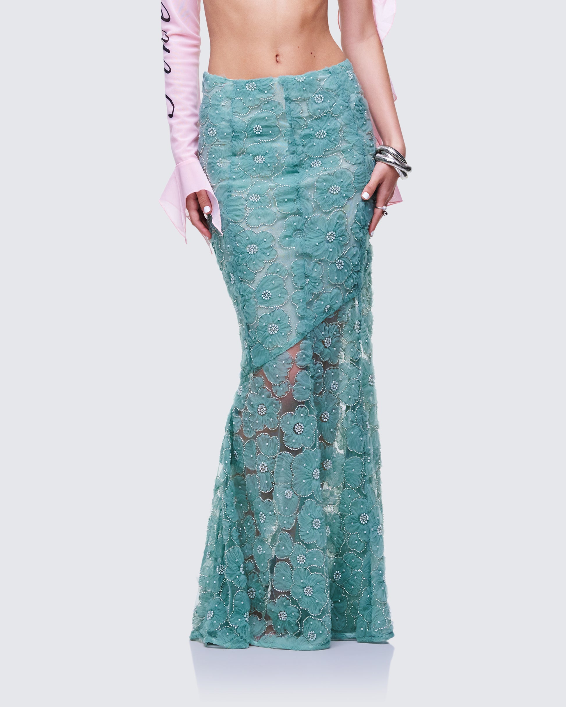 Get ready to serve fairy princess realness in this embroidered midi skirt 💖 Semi-lined to create a sheer peekaboo effect and crafted from premium floral lace with 3D appliqué and crystal diamanté accents - This is what fairy dreams are made of 🧚