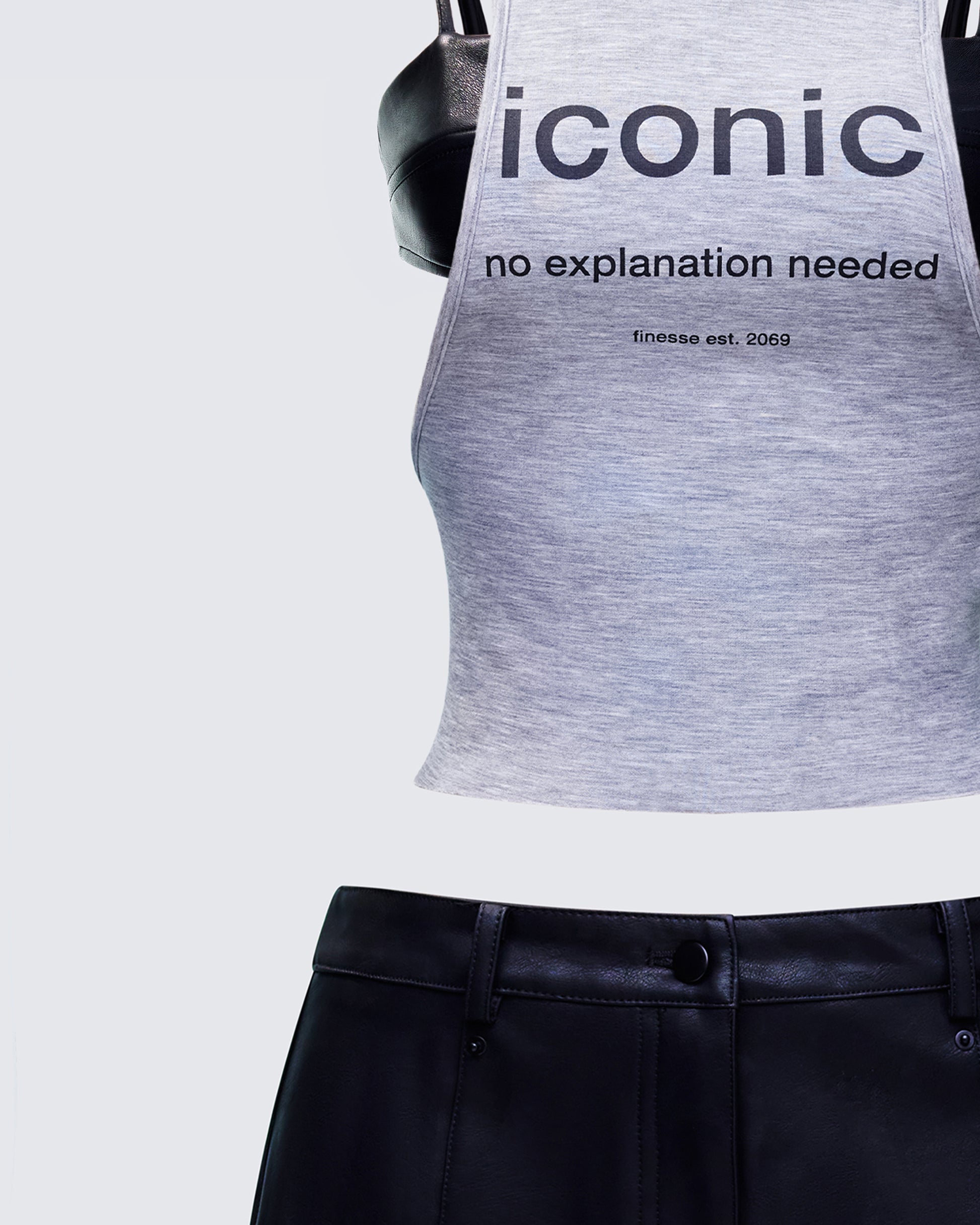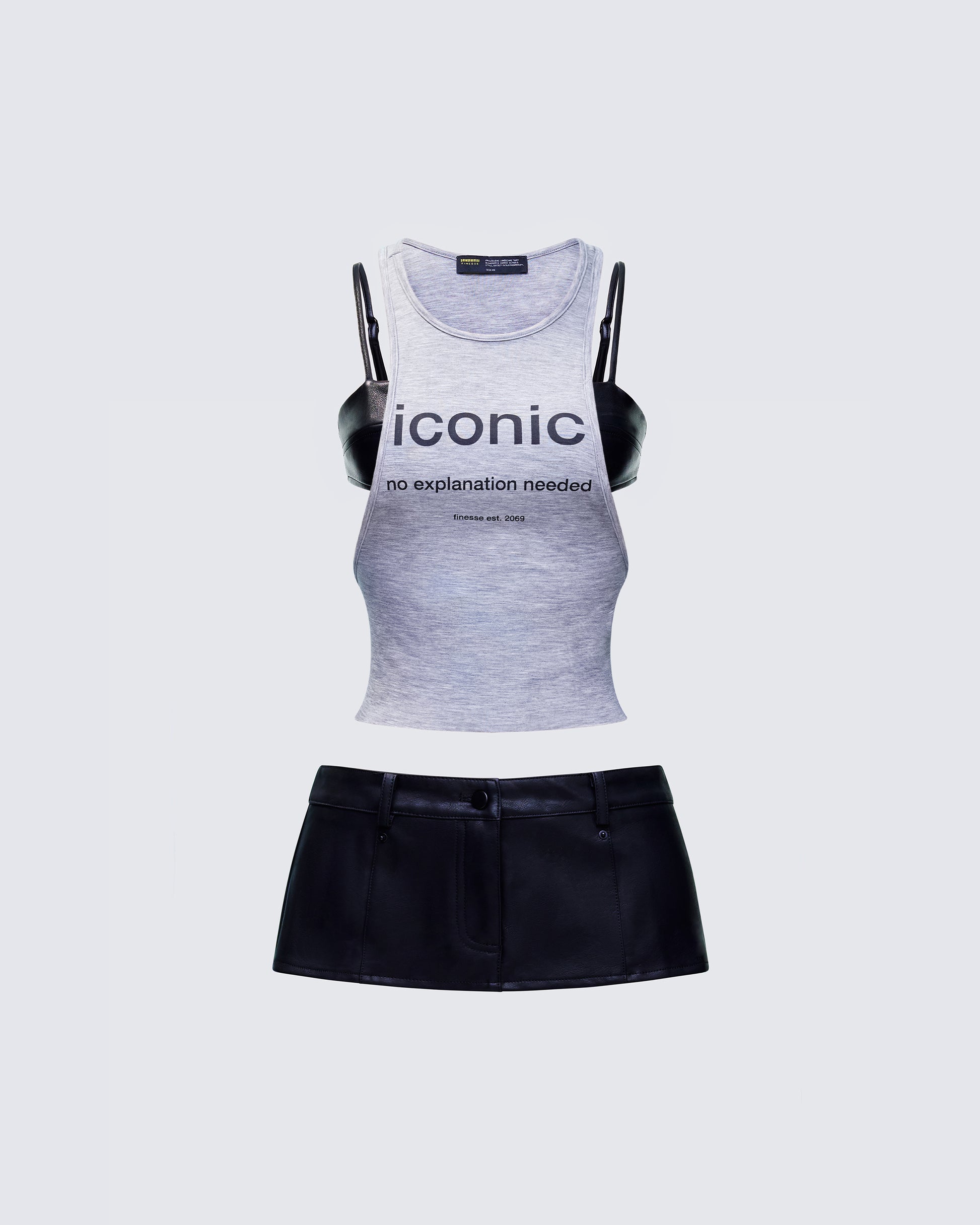 <p>Dido Grey Marl Cutaway Graphic Tank: 48% Lyocell, 34% Viscose, 10% Polyester, 8% Spandex</p><p>Brava Vegan Leather Bra Top: 50% Polyurethane, 50% Polyester</p><p>Novia Black Vegan Leather Mini Skirt: 50% Polyurethane, 50% Polyester</p>