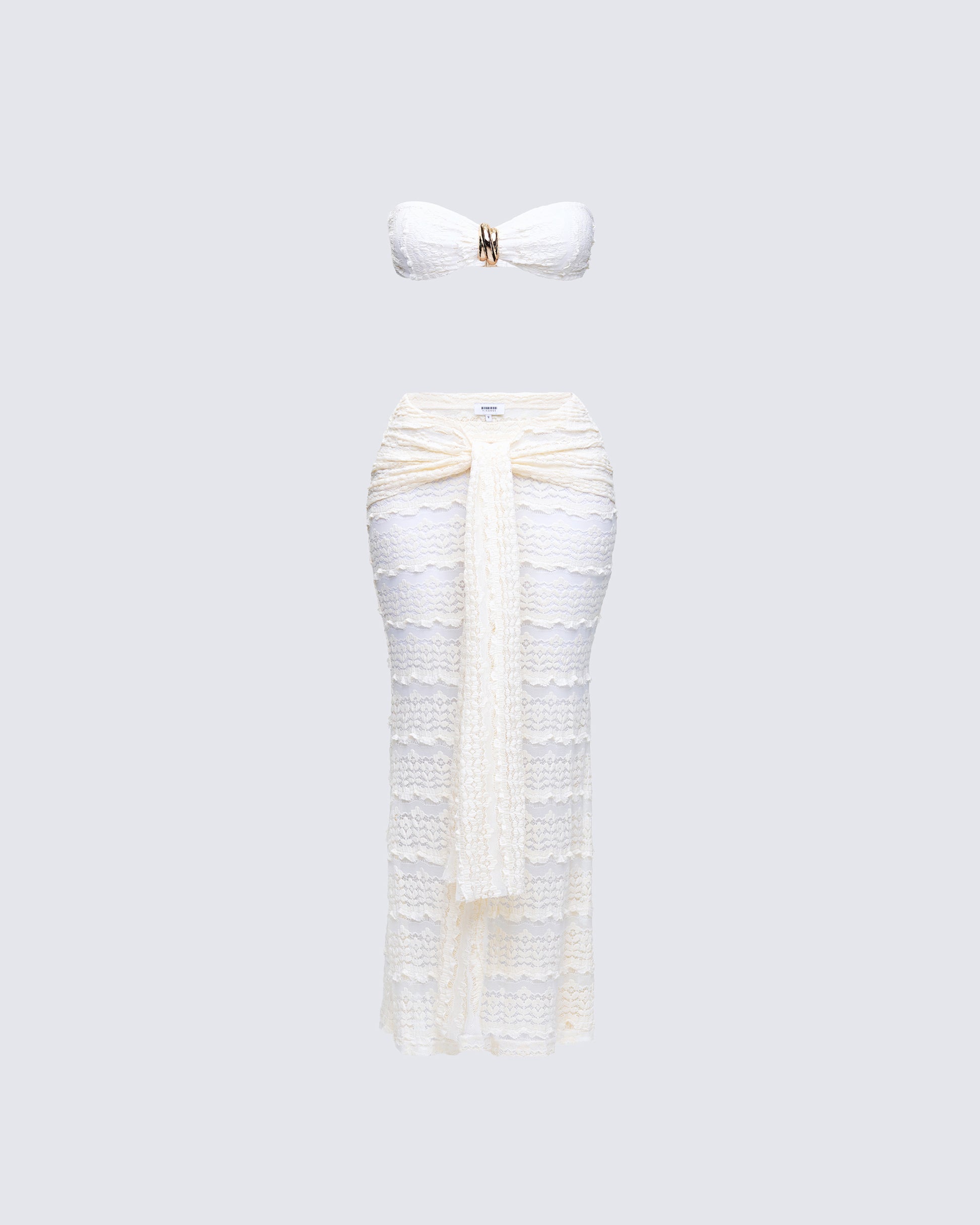 She’s sultry, she’s sexy, she’s effortlessly bold 🤍 This bikini and maxi skirt set was born to steal the spotlight featuring a hint of sheer and a whole lot of attitude 😏