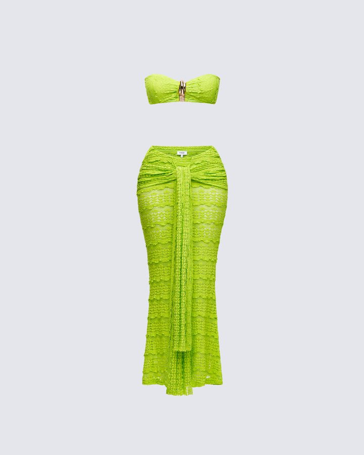 Skin-tight, lime-bright ☘️ This barely-there strapless bikini top, featuring a pop of gold detailing, knows how to turn up the heat without even trying ⭐️