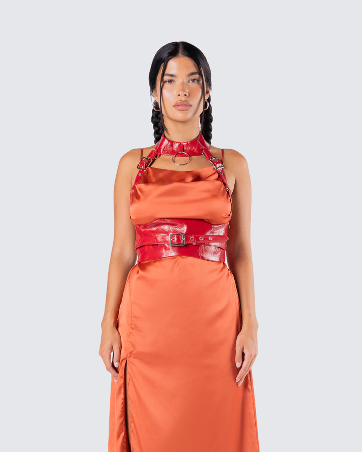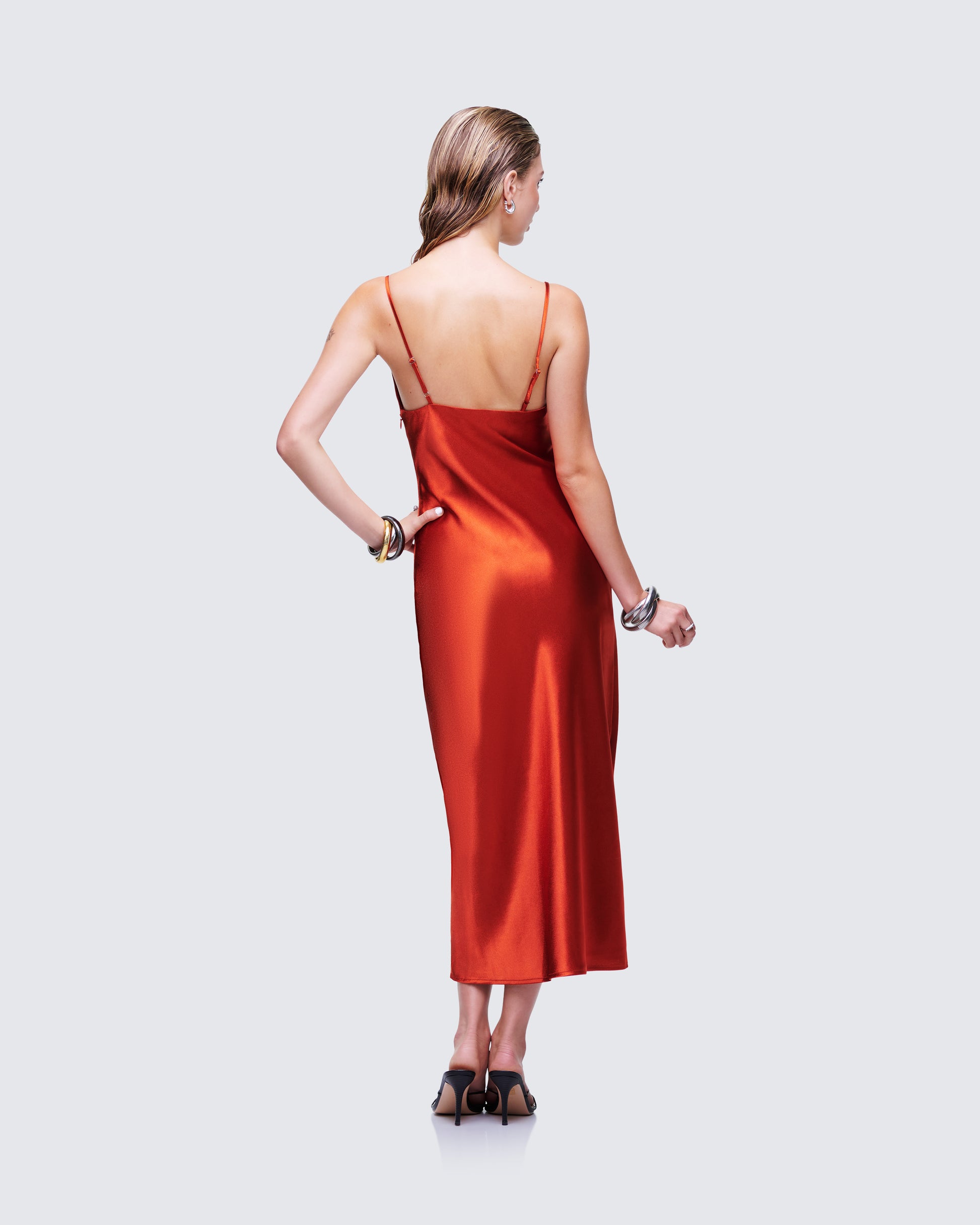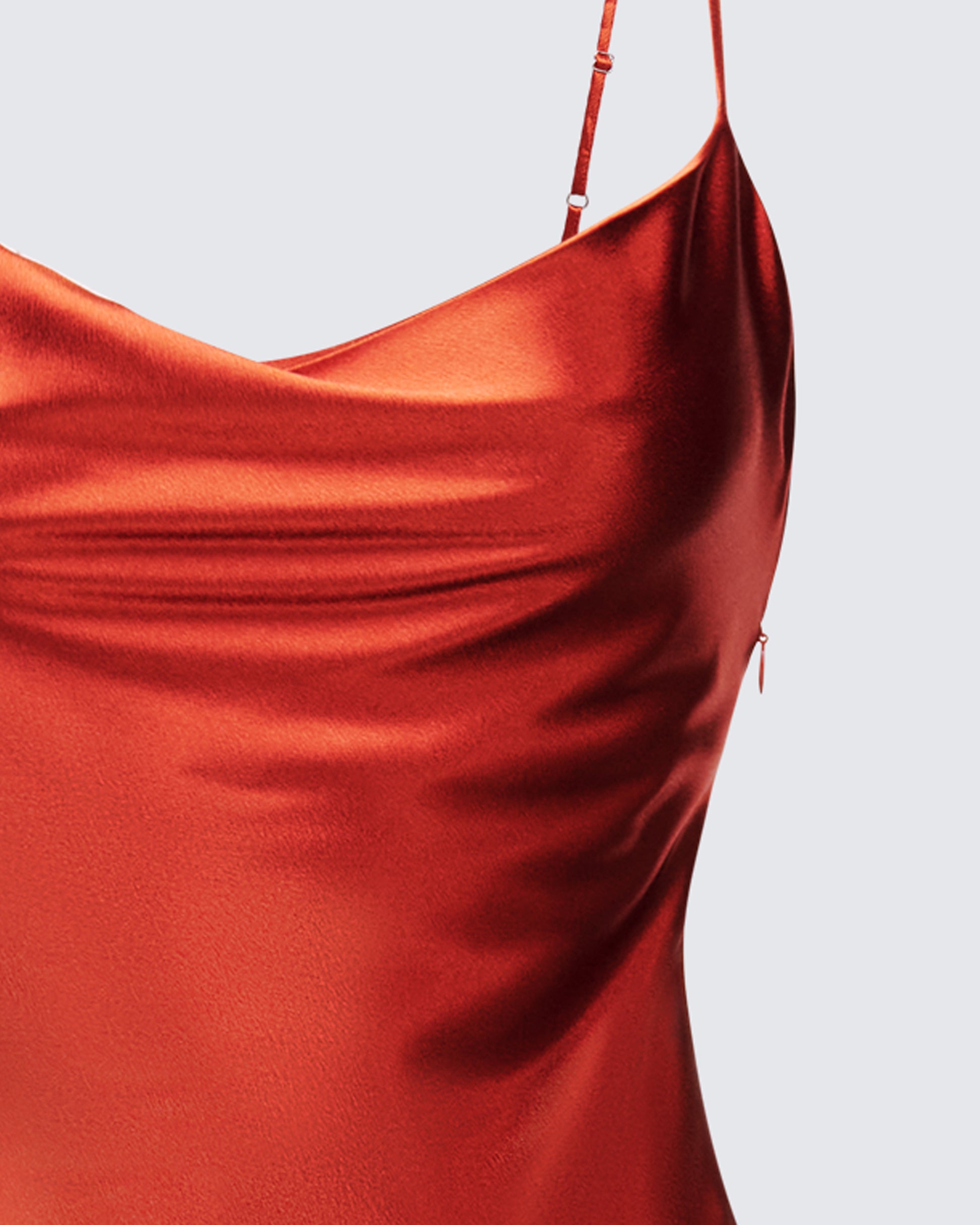 If the sunset was a dress this would be it ๐ŸŒ… Crafted with flowy satin fabric, this stunner features a strappy cowl neck and a daring front side slit. Get ready to paint the town in warm, vibrant hues ๐Ÿงก