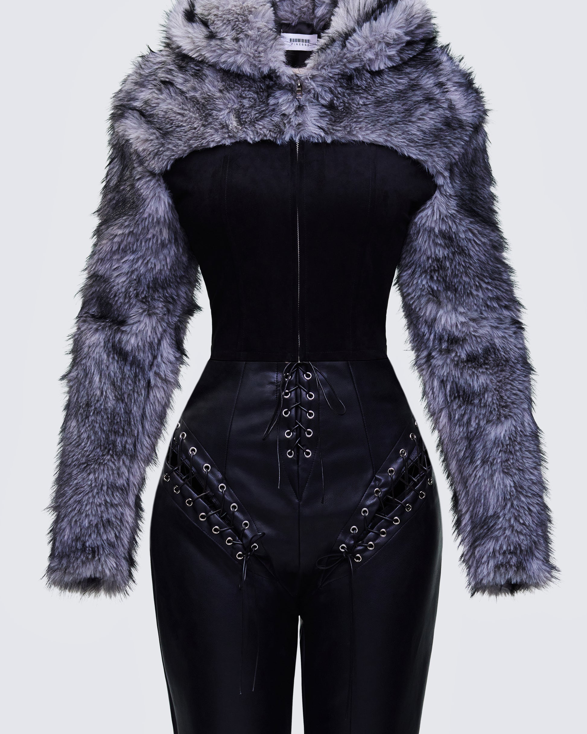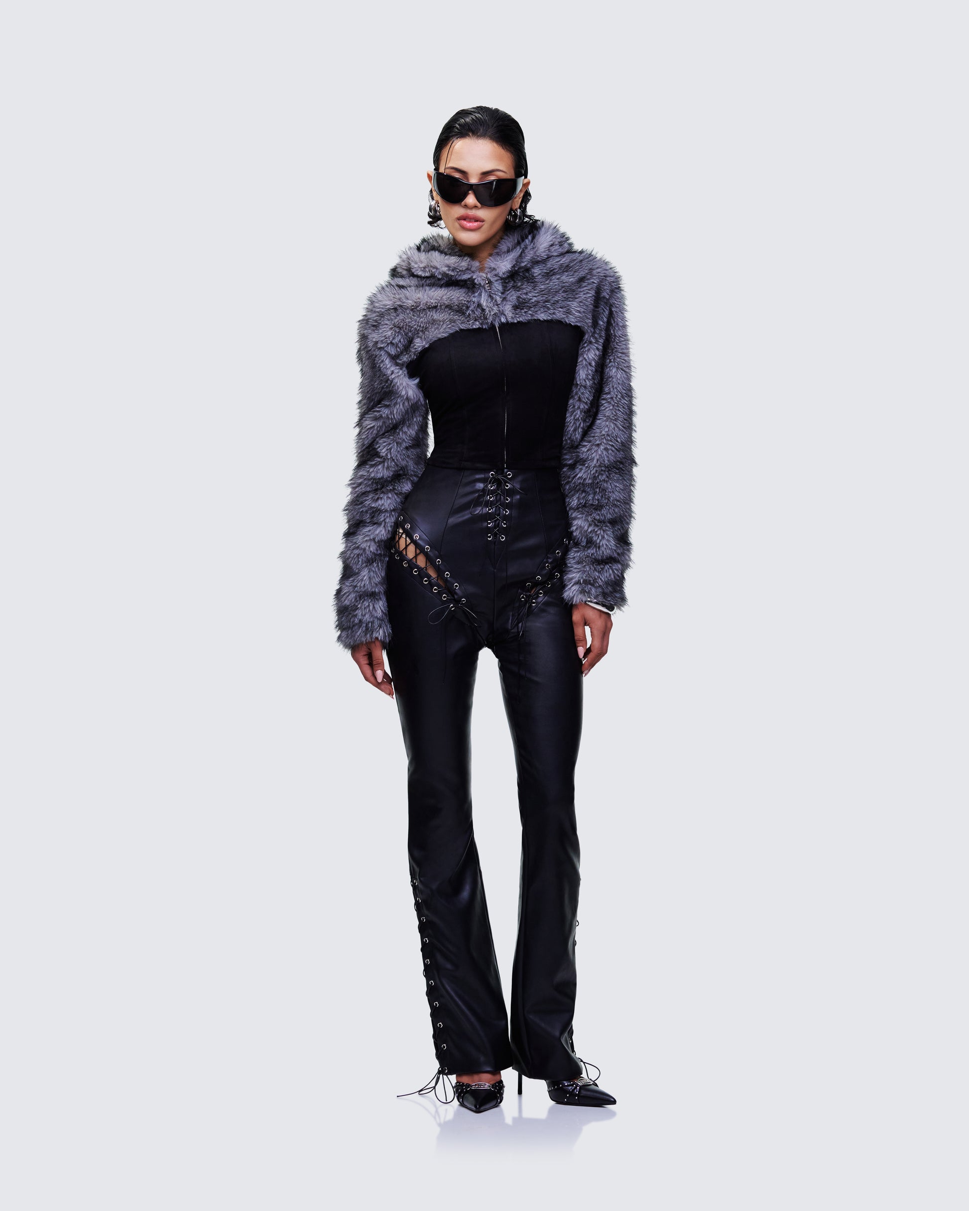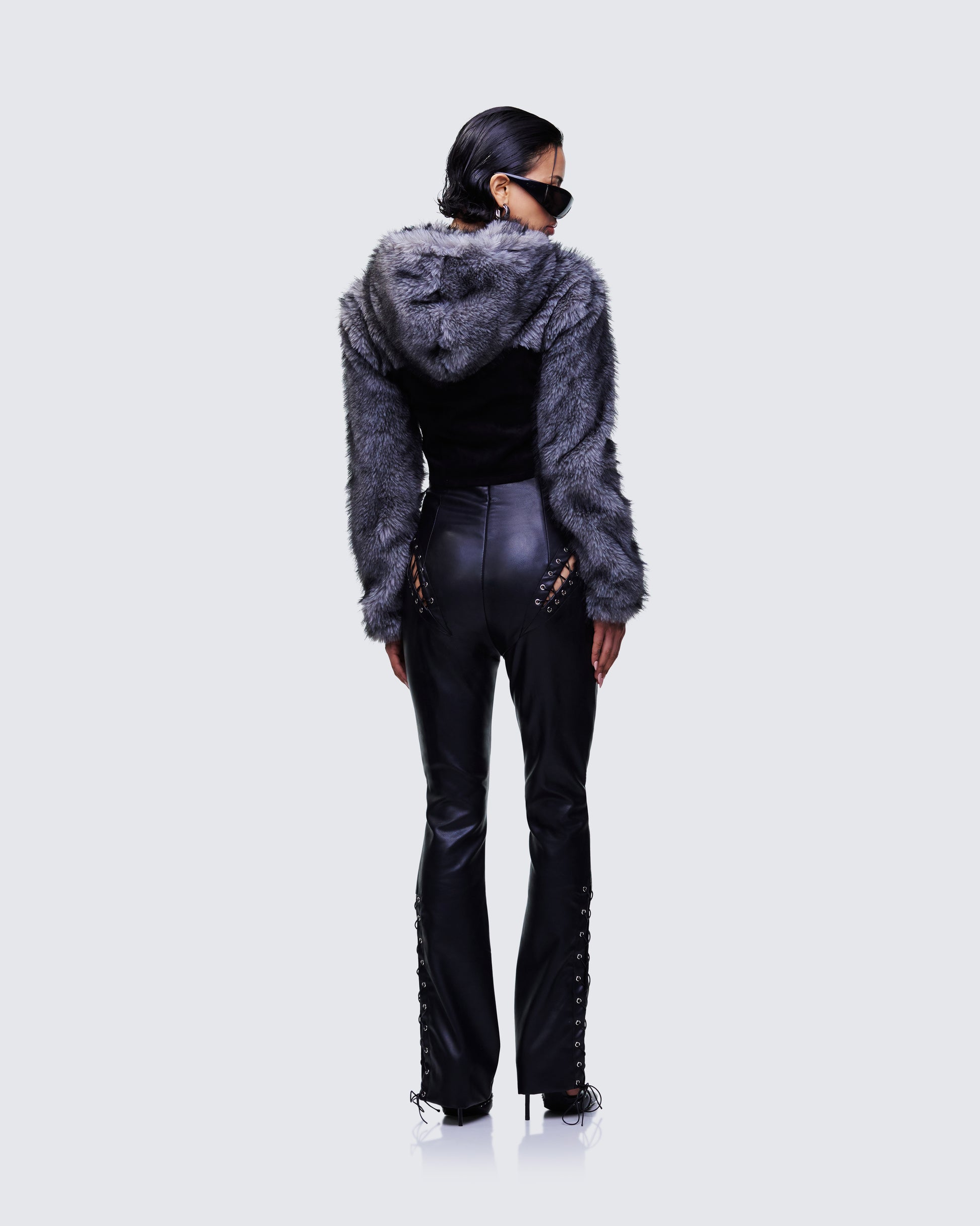 Laced to the gods ๐ค Featuring high-rise black pants with a crisscross lace up design and a hooded faux fur denim jacket - this fit will have heads turning and convos starting ๐ฅย