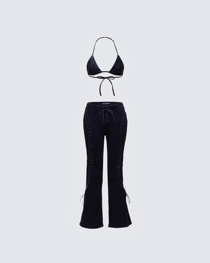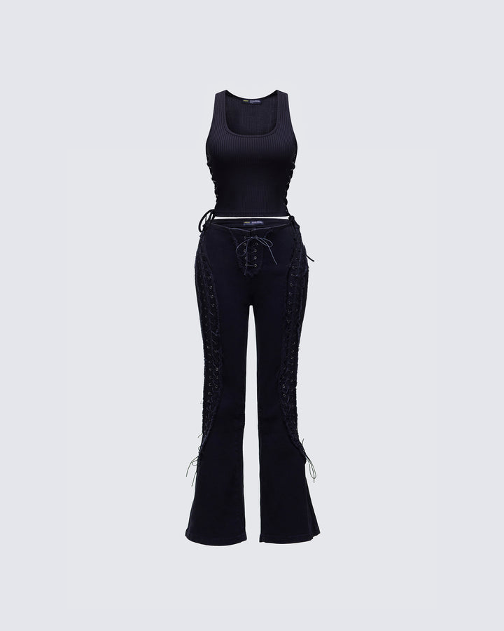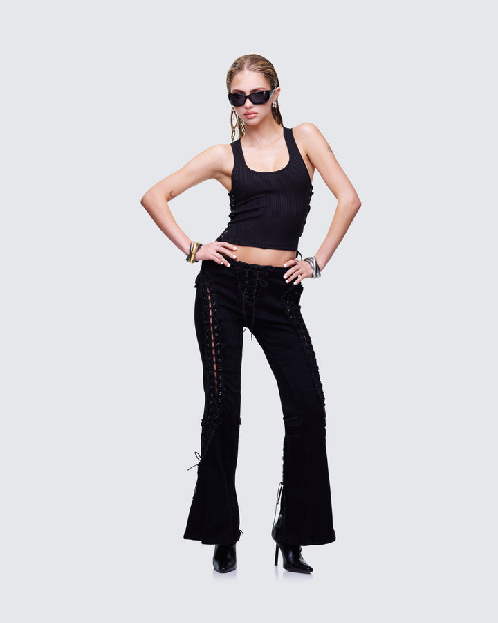 Laced up and ready to steal the show 🖤 These black flared pants, featuring adjustable lace-up sides that snatch and show some skin while still keeping it classy, have main character energy built in 😌
