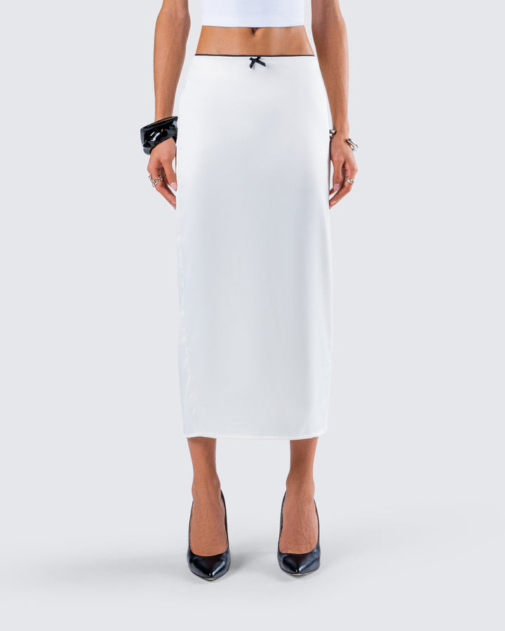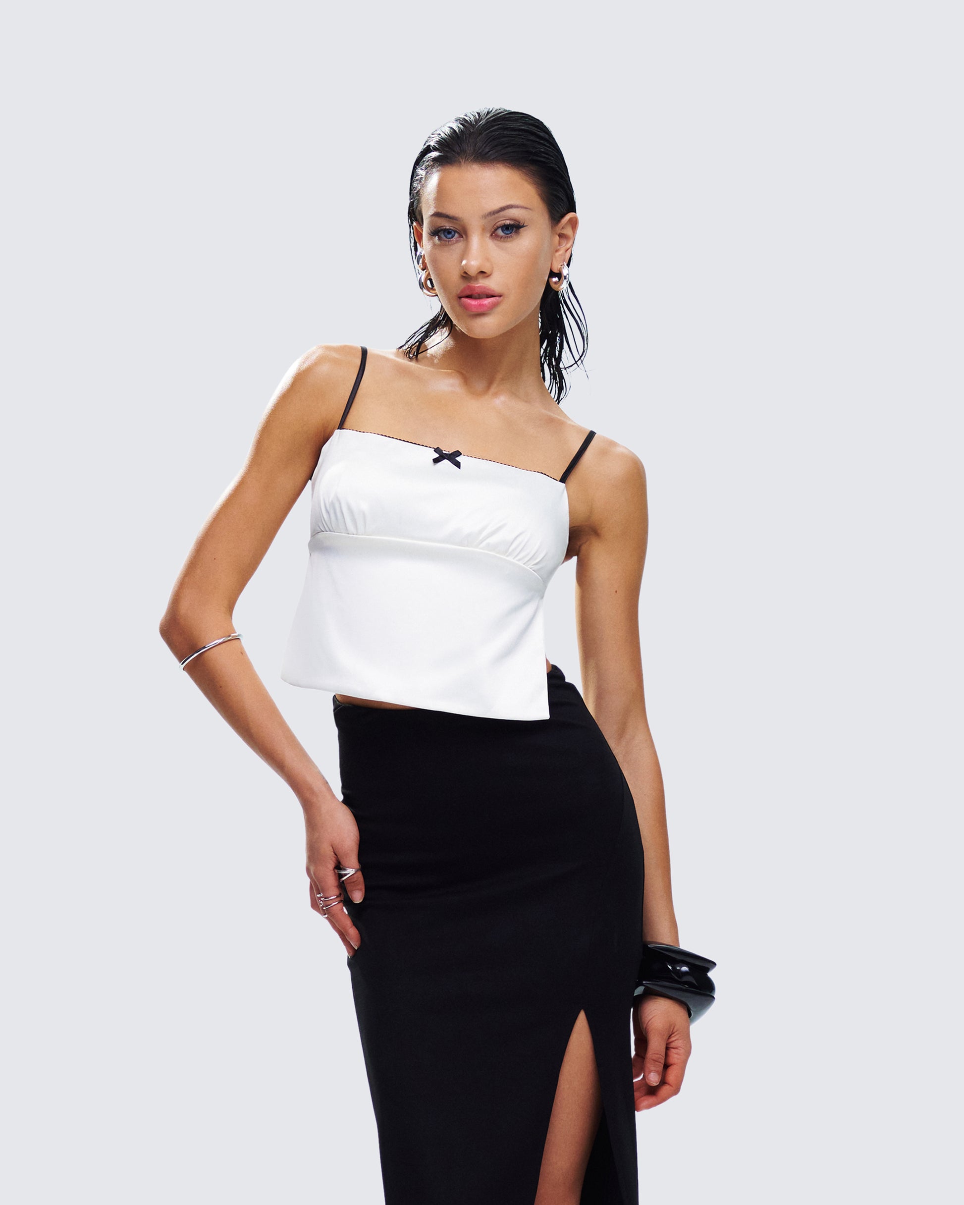 Cute in the front, sexy in the back 😏 Show them both sides of you in this ivory backless top - made from satin fabric, and complete with a black mini bow detailing and a tie back 💫