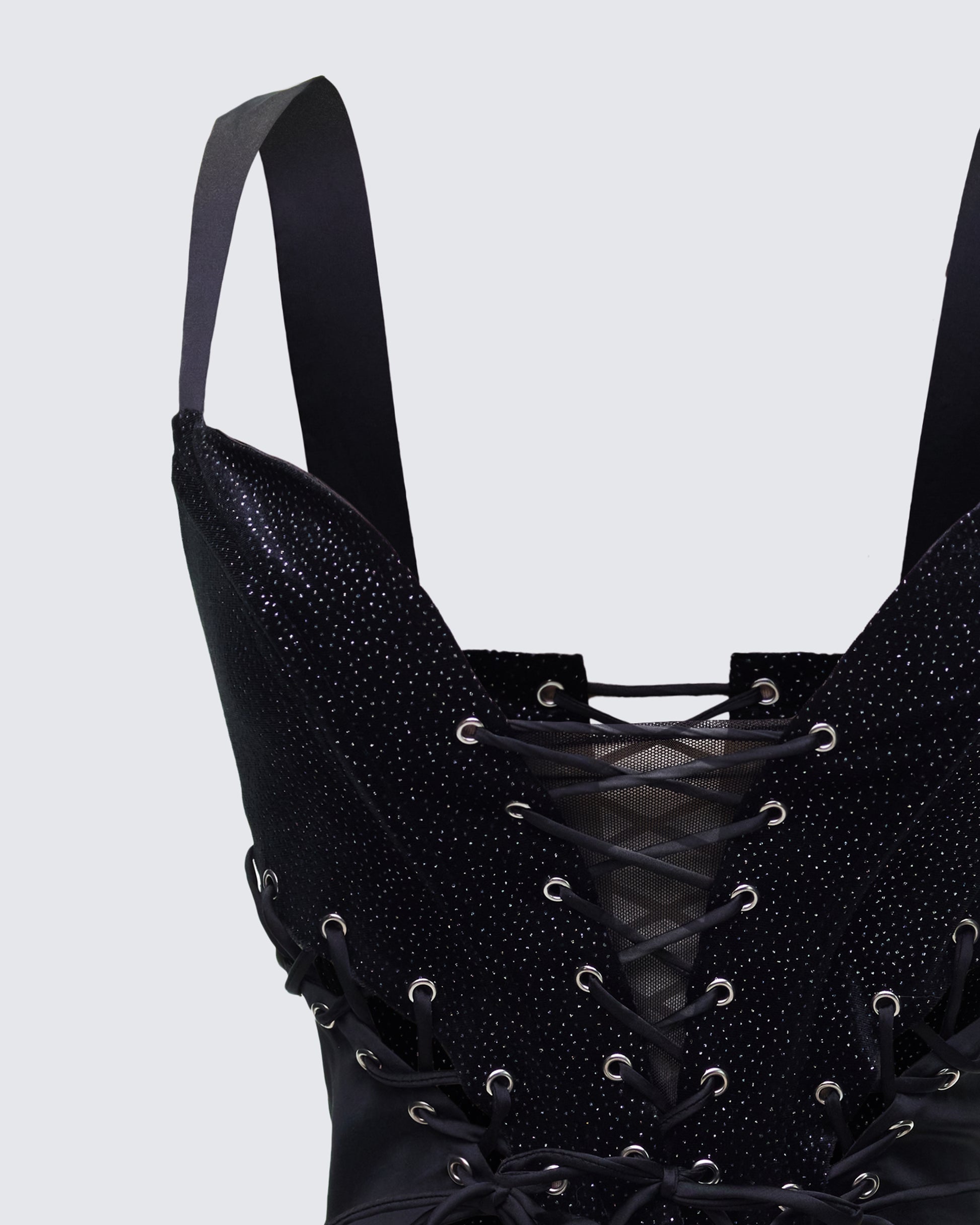 Soft velvet, sharp attitude 🖤 This top sculpts the waist with dramatic lace-up detailing and a plunging neckline that does not believe in subtlety. Finished in glitter-speckled velvet that catches the light with every move, it’s the kind of top that instantly becomes the center of attention ✨