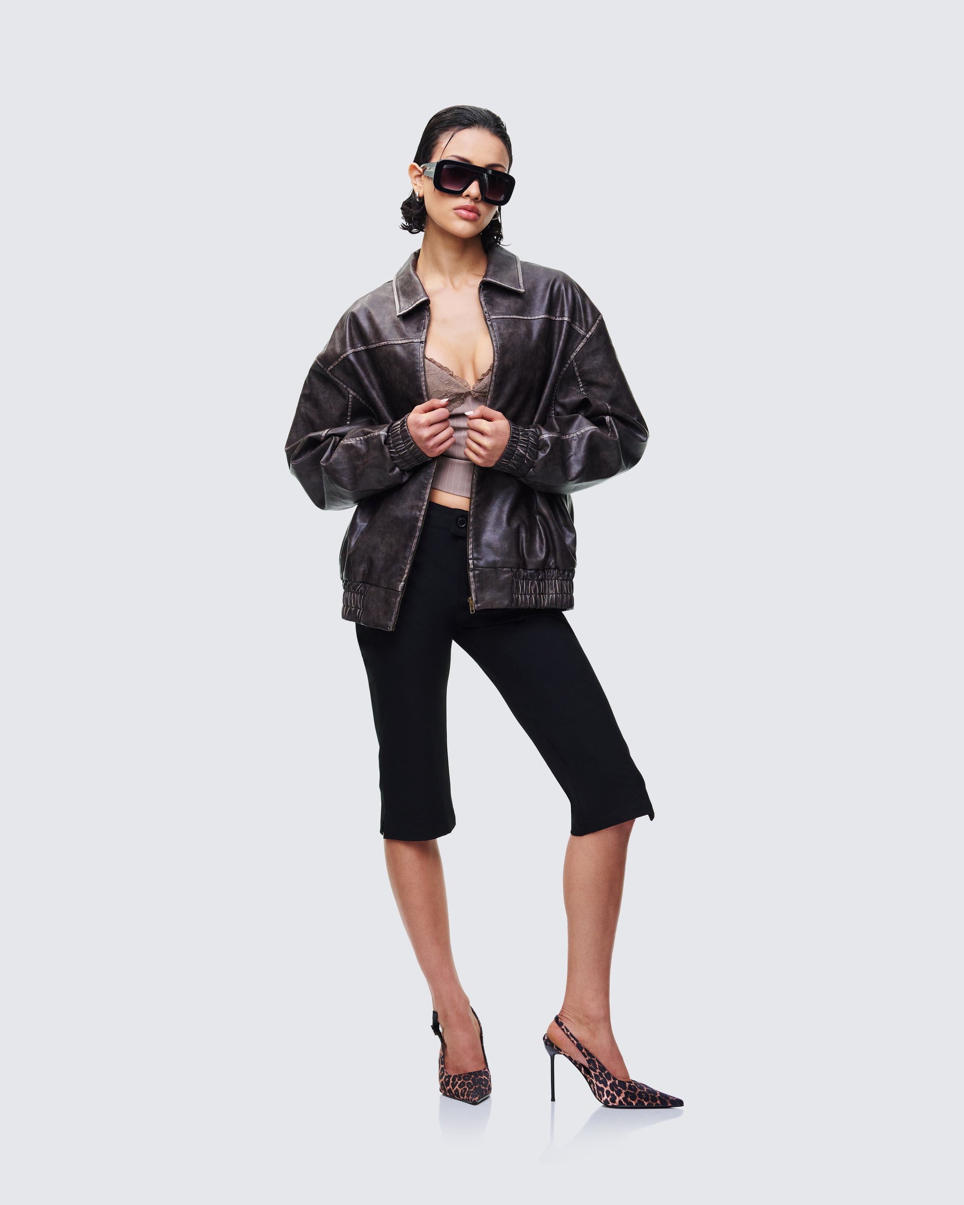 Effortless? Yes. Innocent? Absolutely not π The distressed jacket brings the attitude, the strappy top brings the tease, and the capris + leopard heels do the rest of the work for you π
