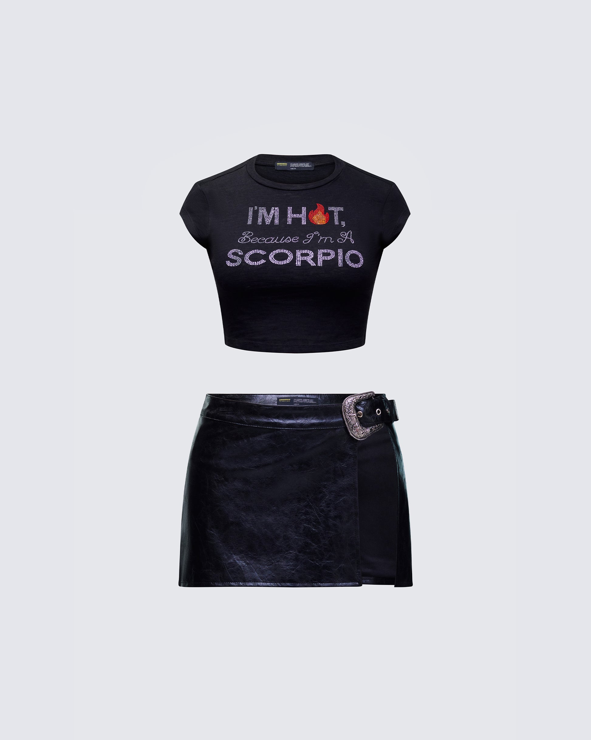 I’m hot because I’m a Scorpio ♏ Let your magnetic side shine through in this two-piece set featuring a black Scorpio graphic top paired with a black vegan leather mini skirt 🖤
