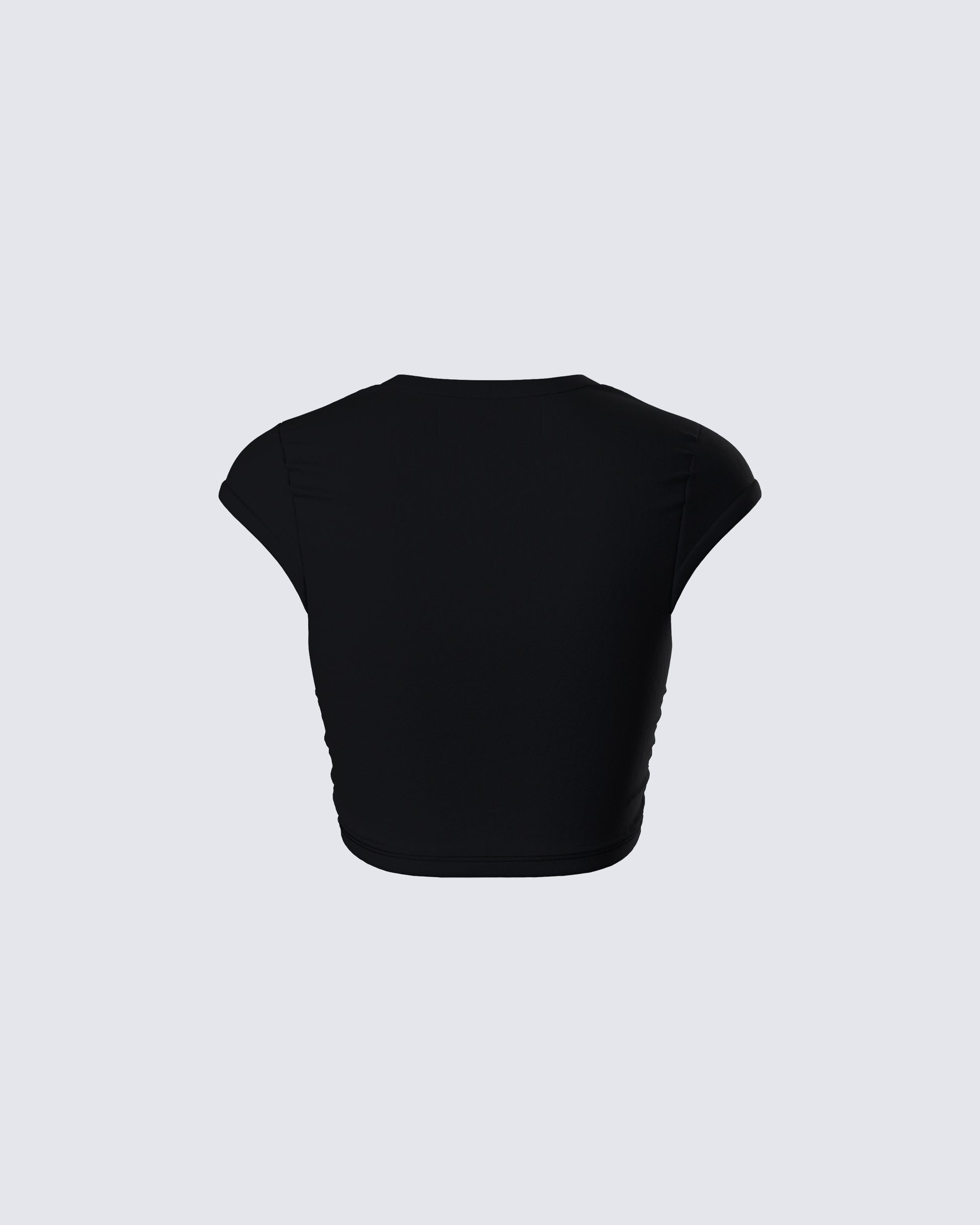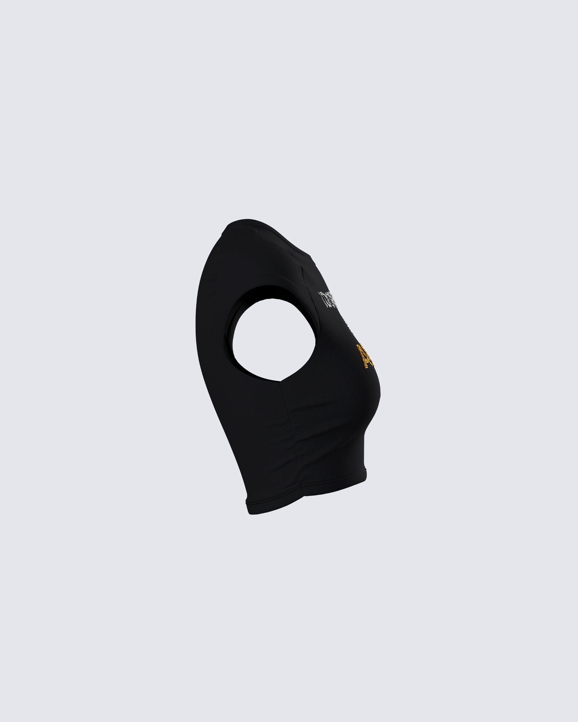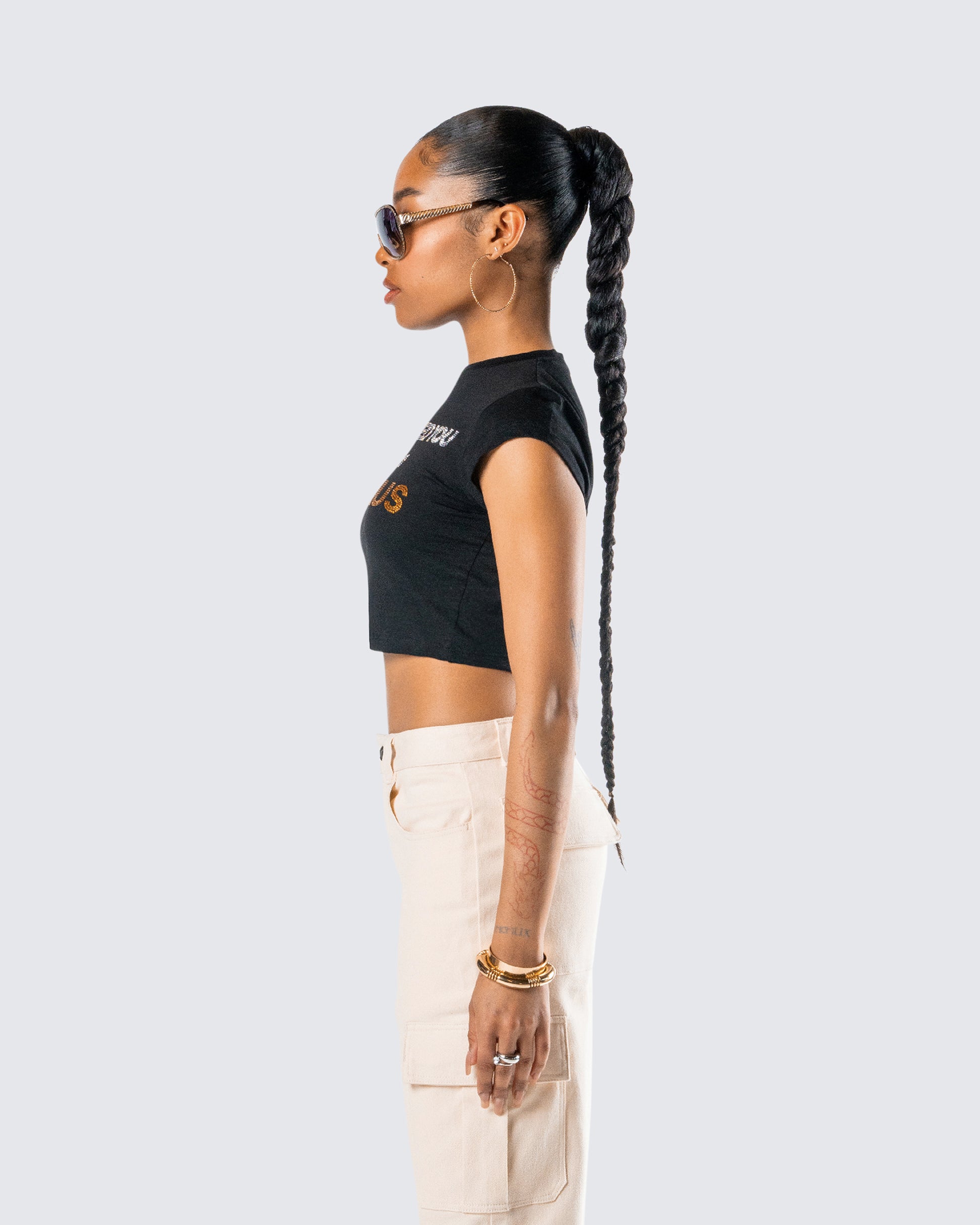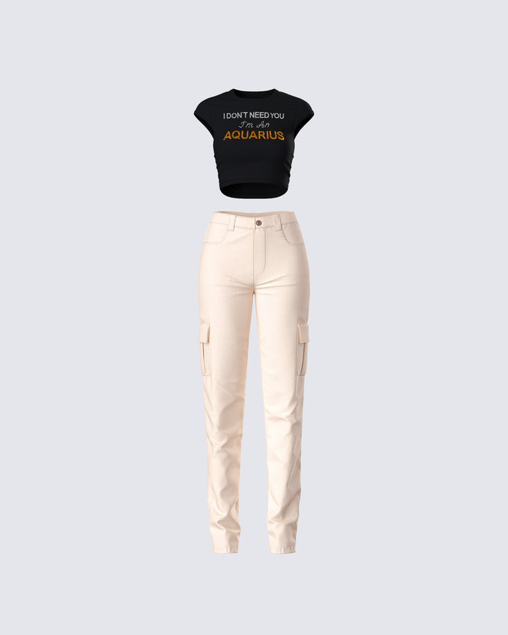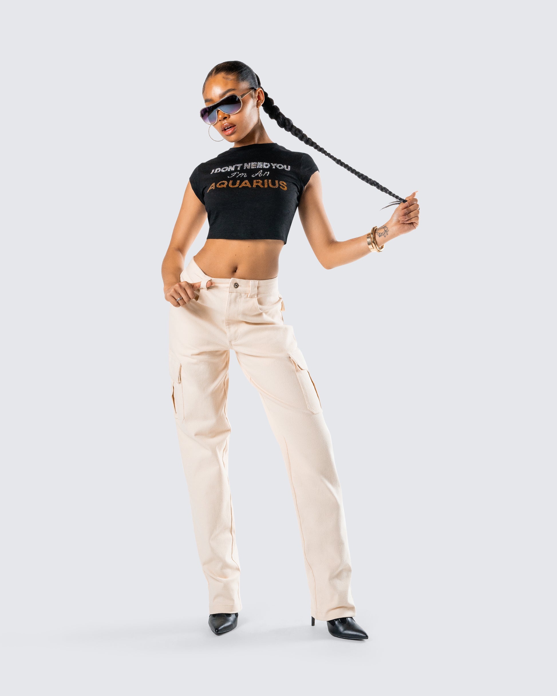 We love an independent baddie 💅 Let them know the vibes in this black top made from stretch jersey fabric and complete with a rhinestone “I Don't Need You I’m An Aquarius” graphic ✨🖤