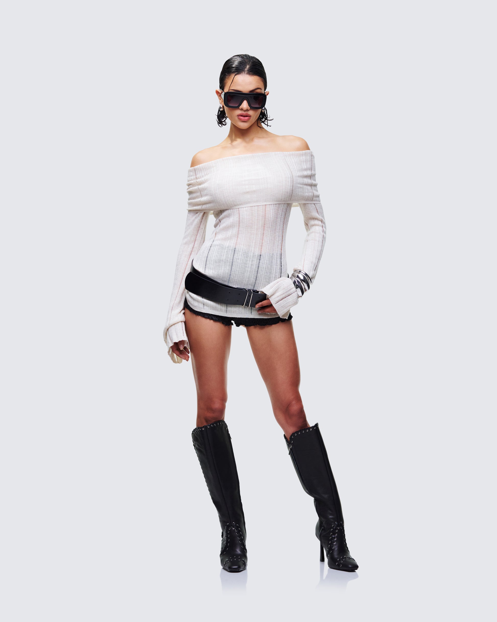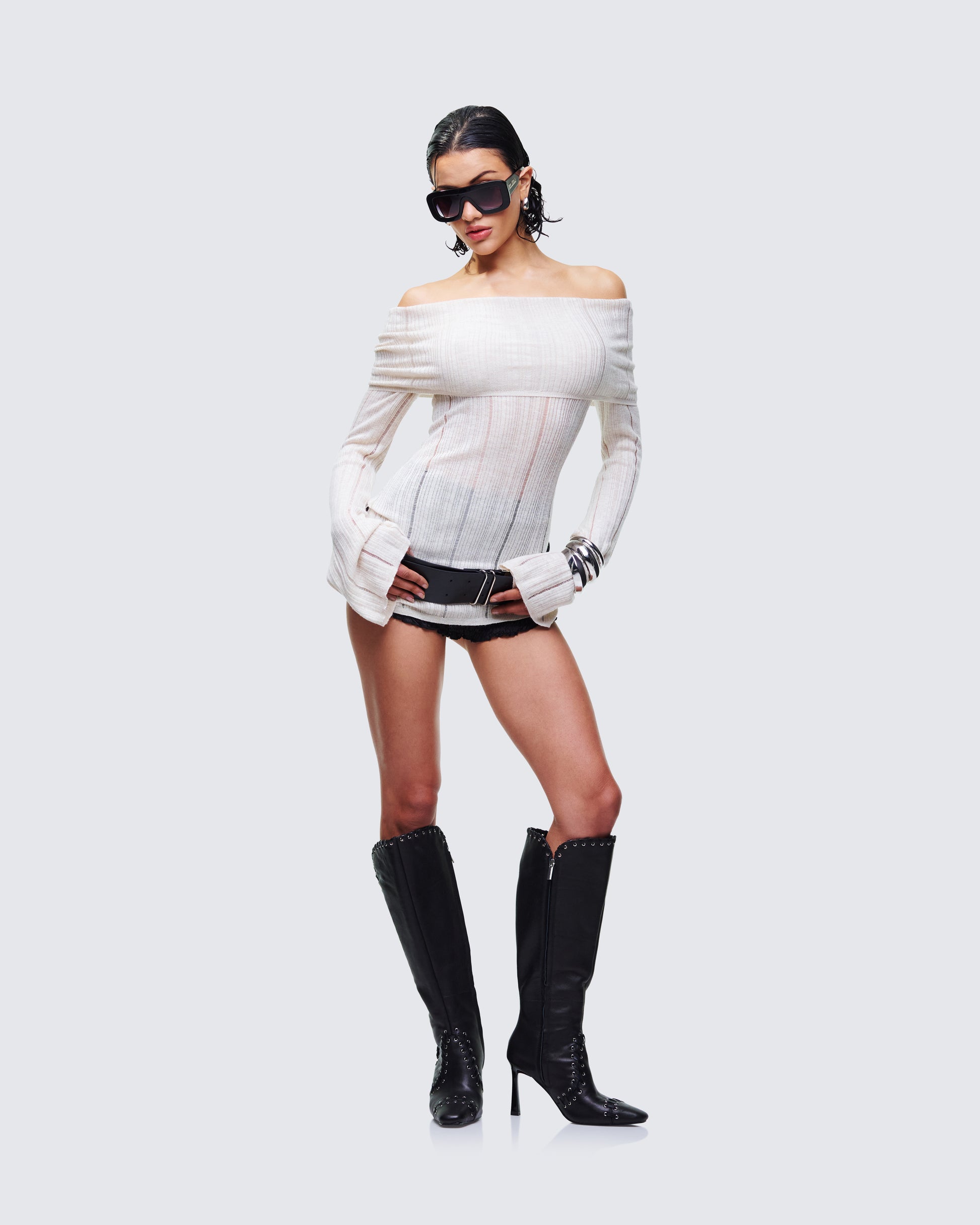 You’ll always show up looking better than everyone else in this fit 💅 Featuring an ivory off-shoulder top, black high waisted shorts, and a black vegan leather belt, this three-piece set is perfect for a chic and classy night out 🤍
