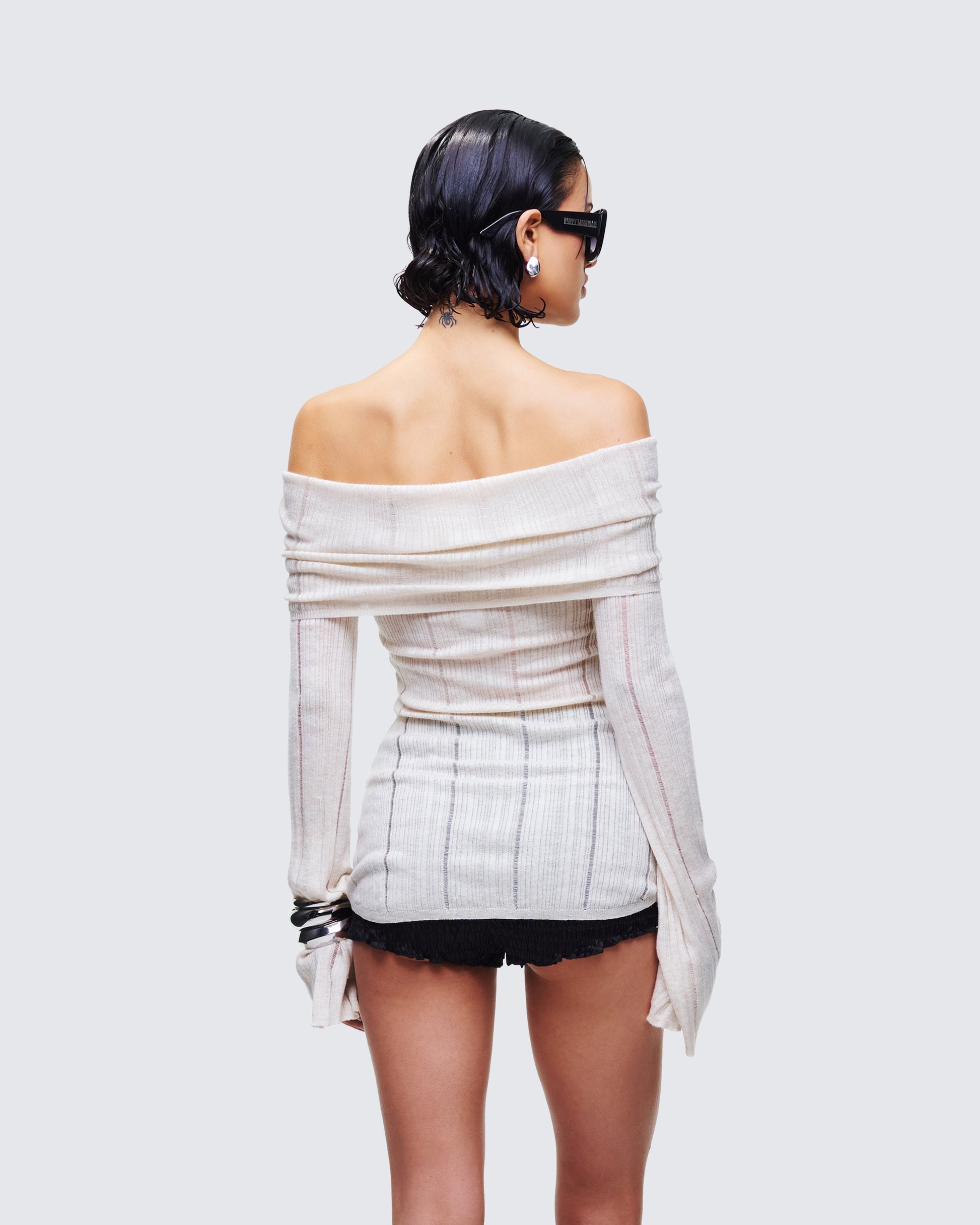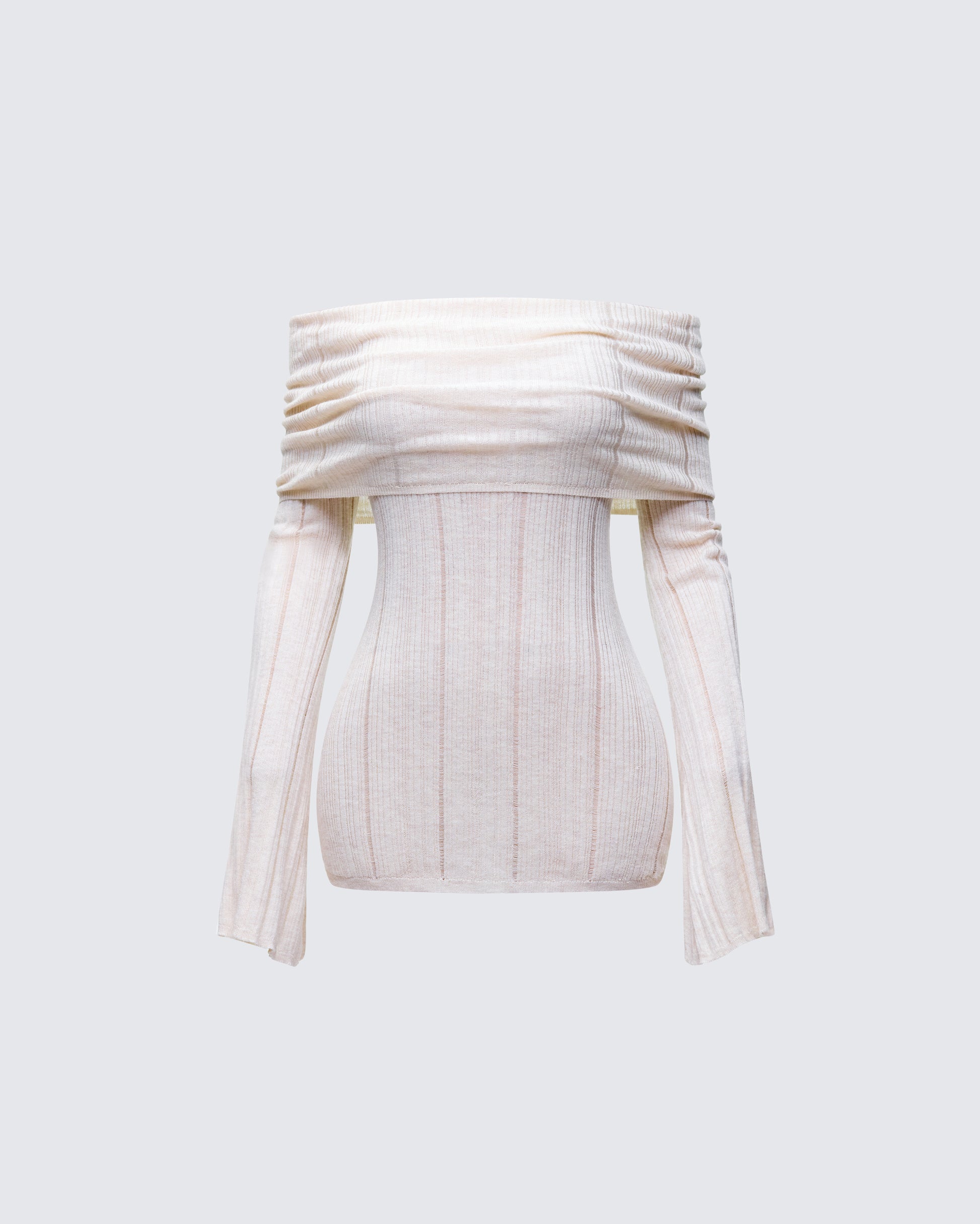 Raise the standards in this chic ivory off-shoulder top 😊 Constructed from fully fashioned knit fabric and complete with a fitted design and flared sleeves for a sleek and sophisticated look 🤍