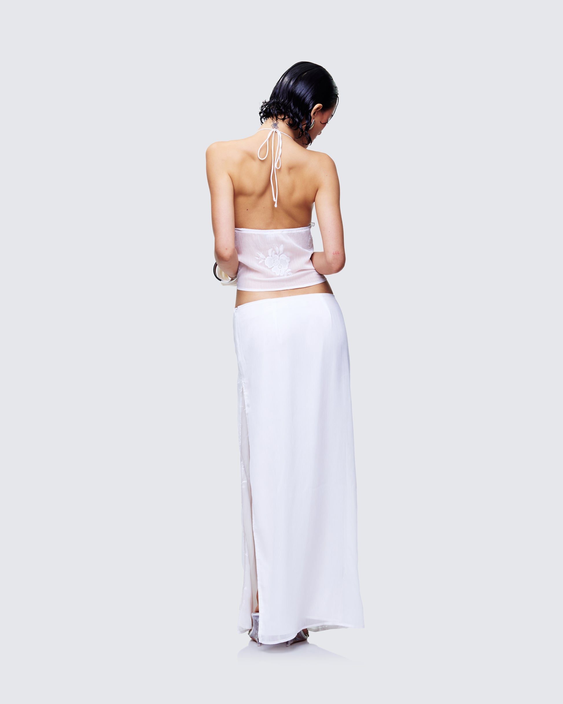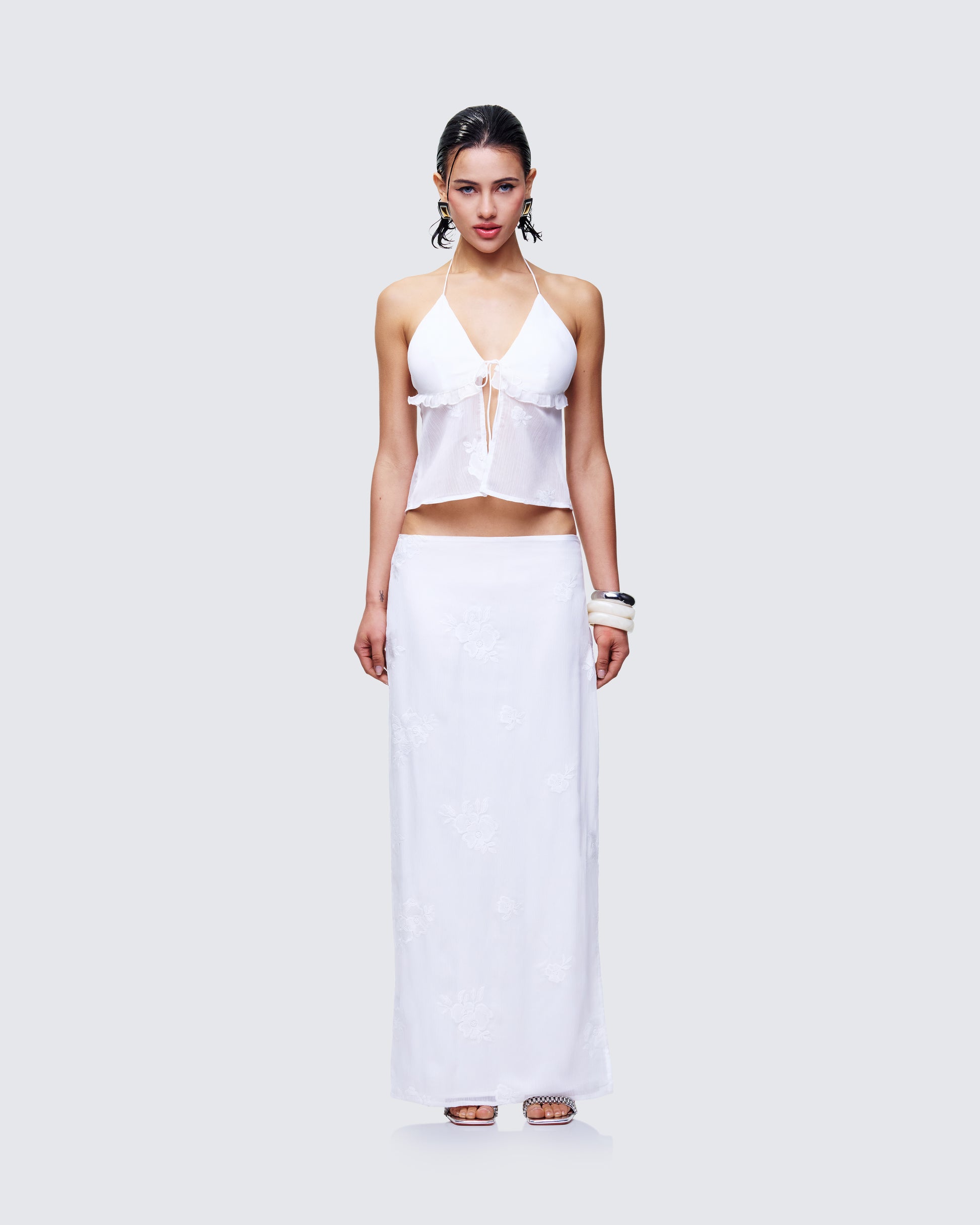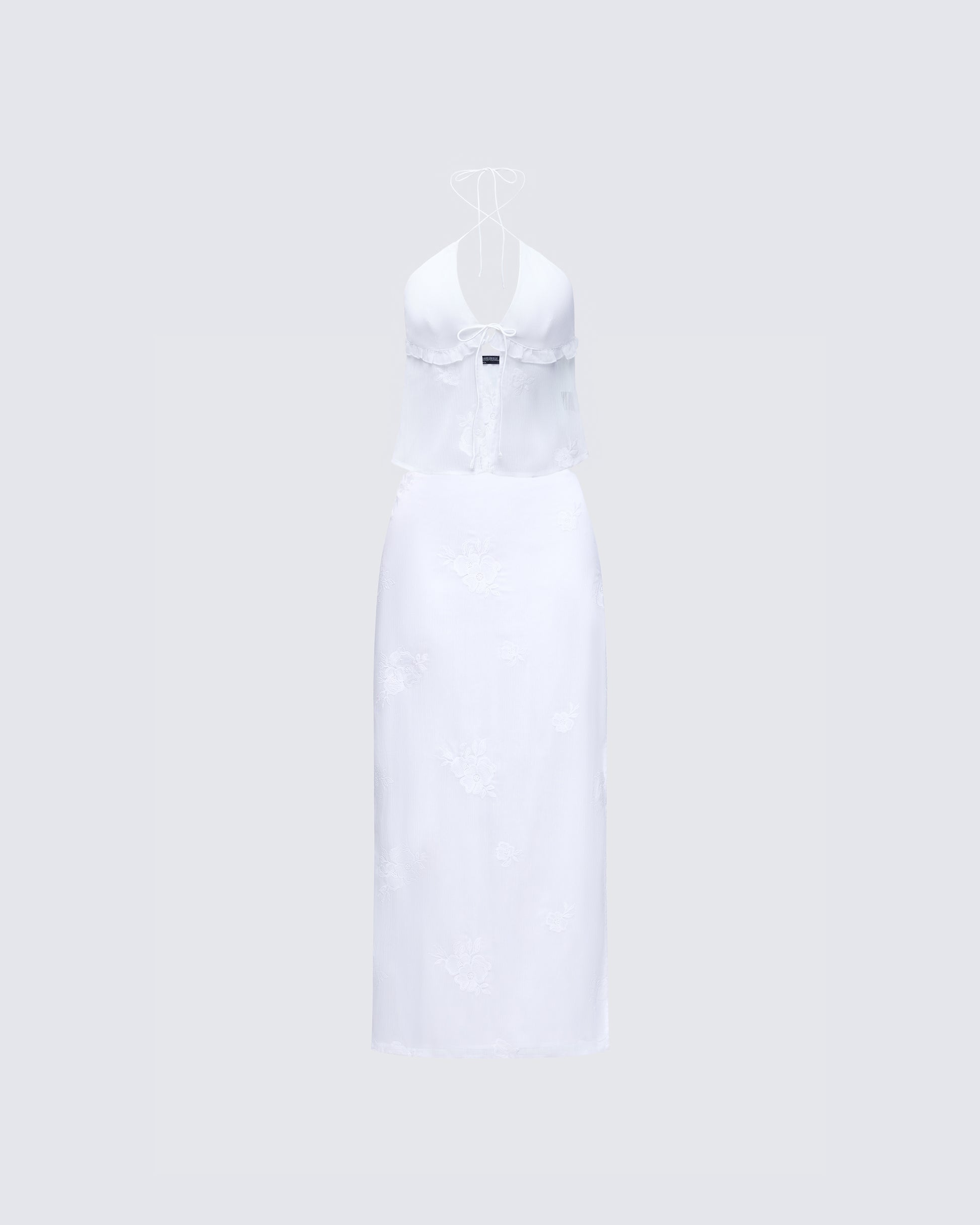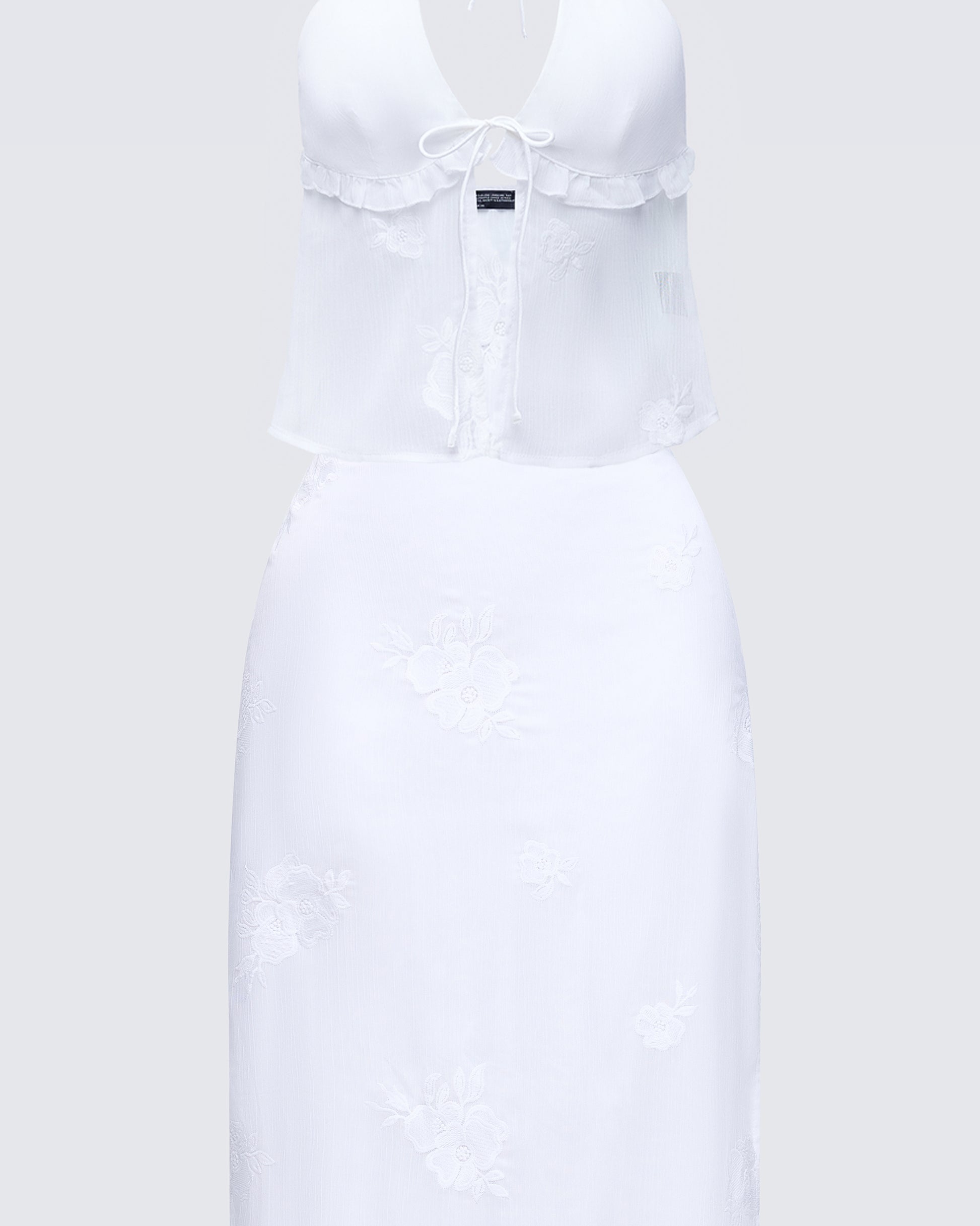 Consider this your angelic alter ego π Glide into every room like you belong in a daydream with this two-piece set featuring an ivory embroidered halter top and matching maxi skirt π€Β