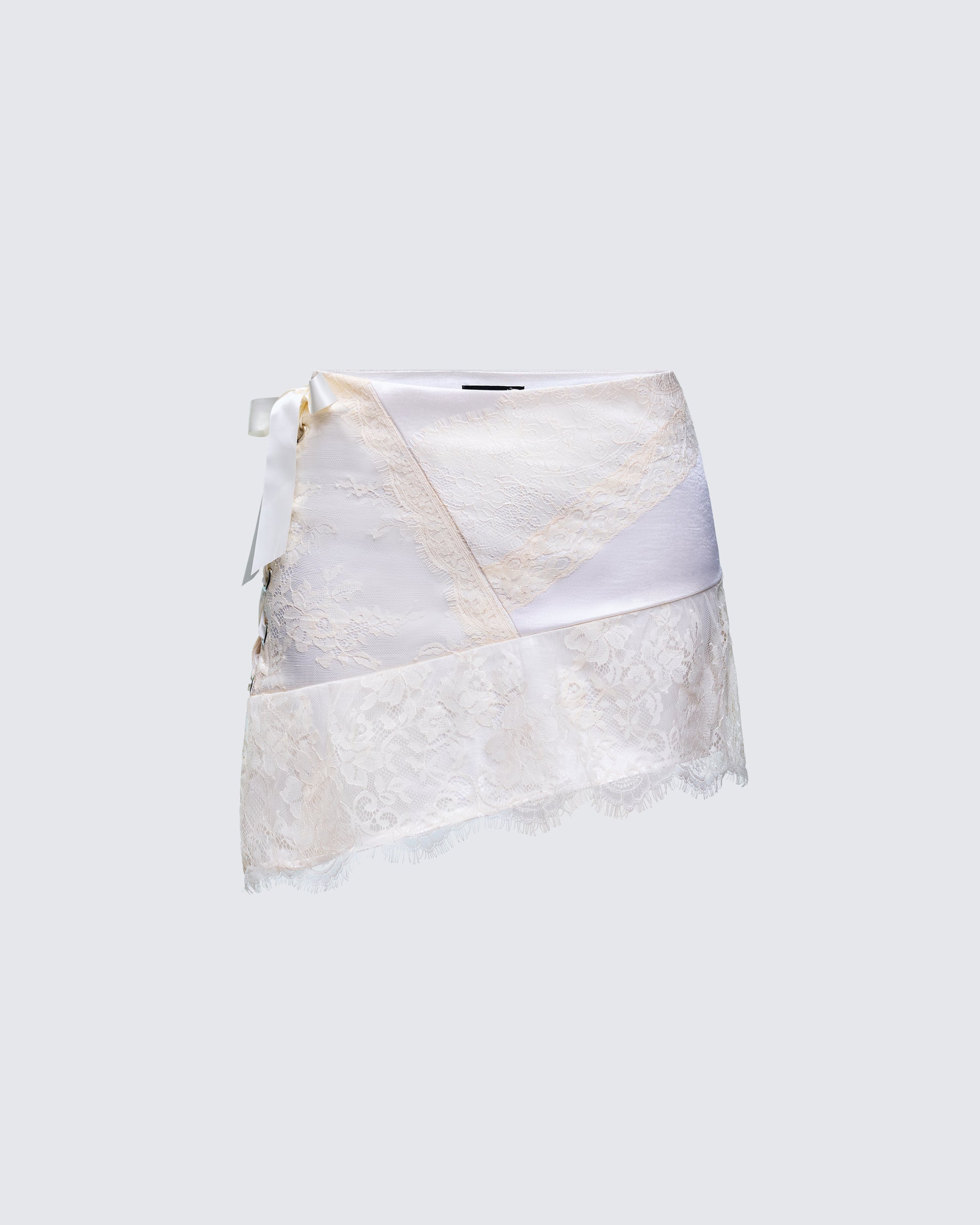 The mini that ties up tighter than your secrets ✨ Featuring an asymmetric hem line and a lace trim, this skirt is serving sweet satin laced with bad intentions 😏