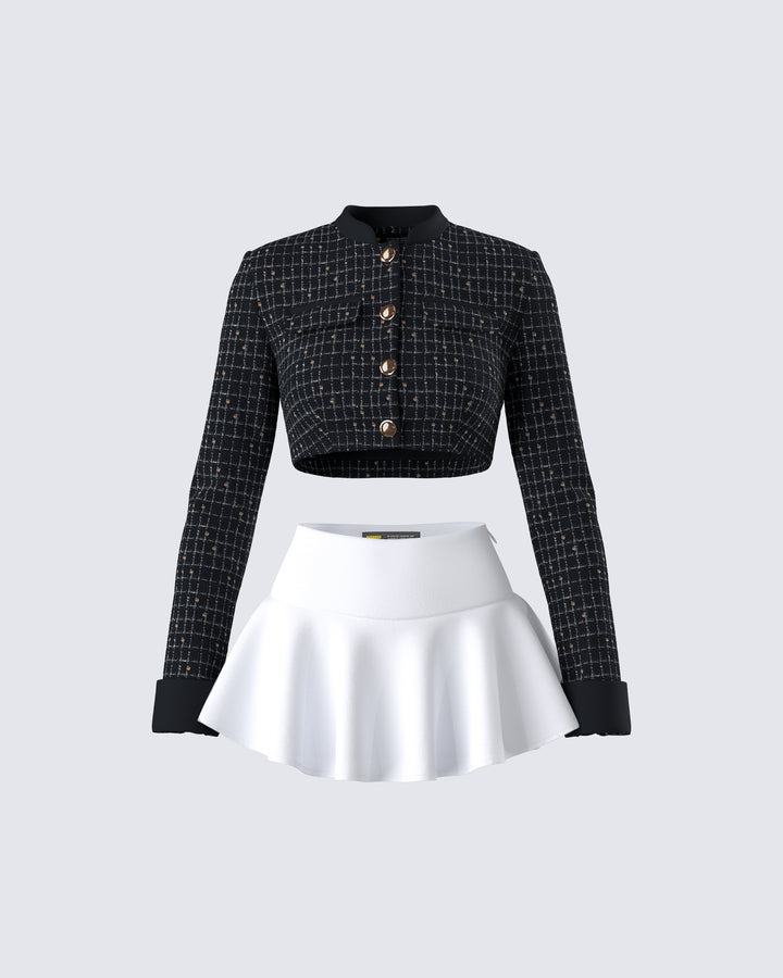 Libra energy at its finest ♎ Be hard to resist in this cheeky two-piece set featuring a black graphic top with a “Everyone Loves Me I'm A Libra” rhinestone graphic paired with a white ruffle tiered skirt 🖤