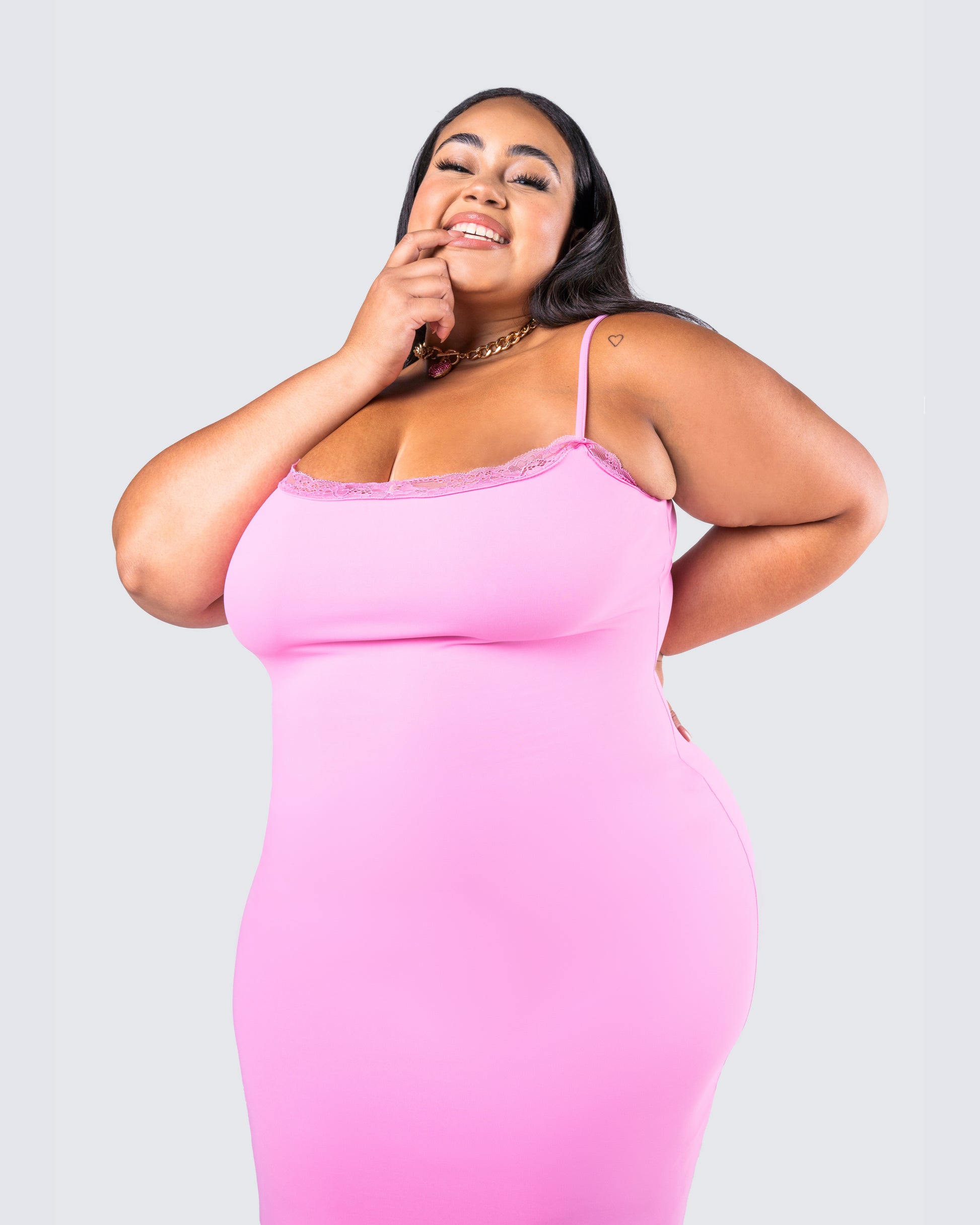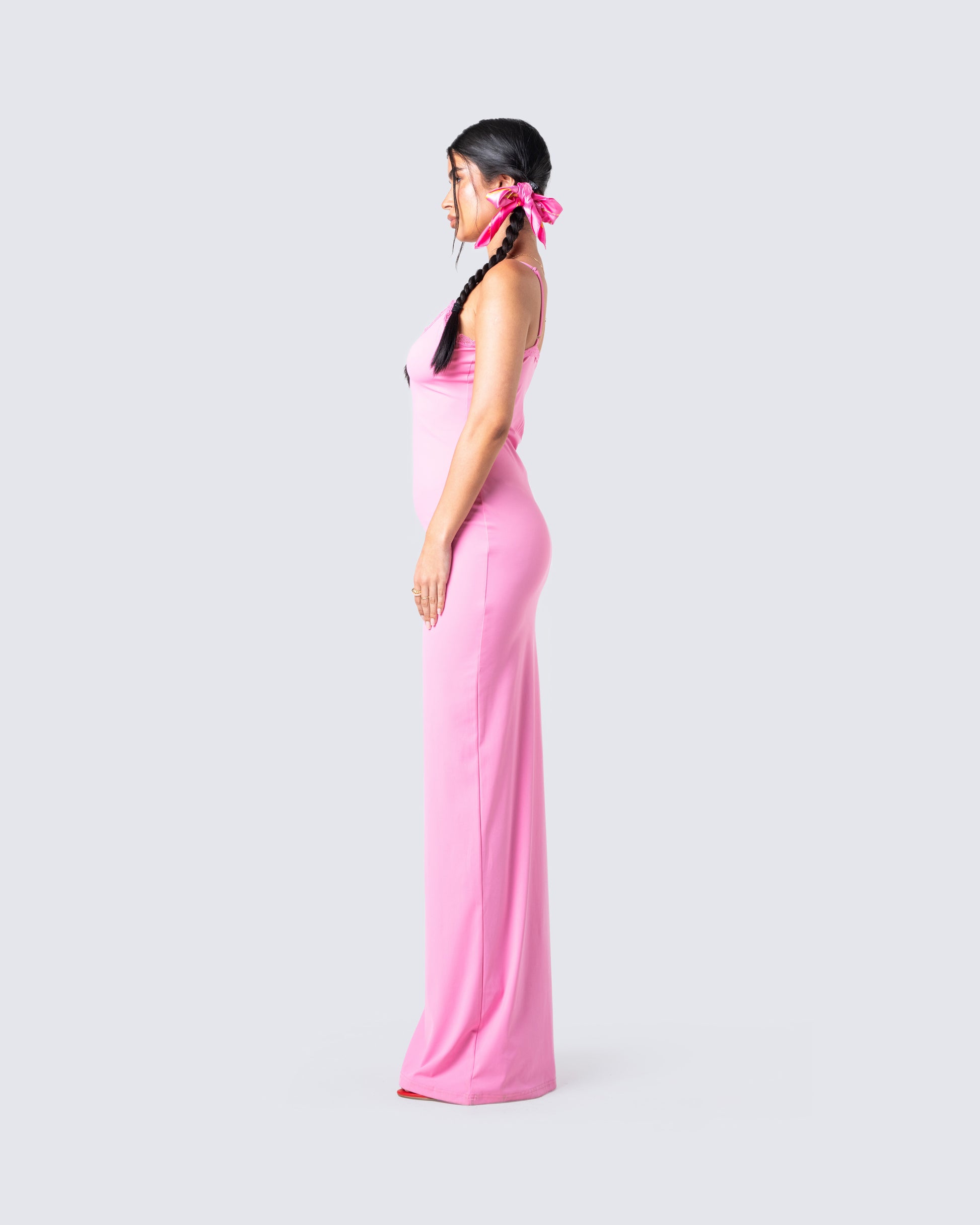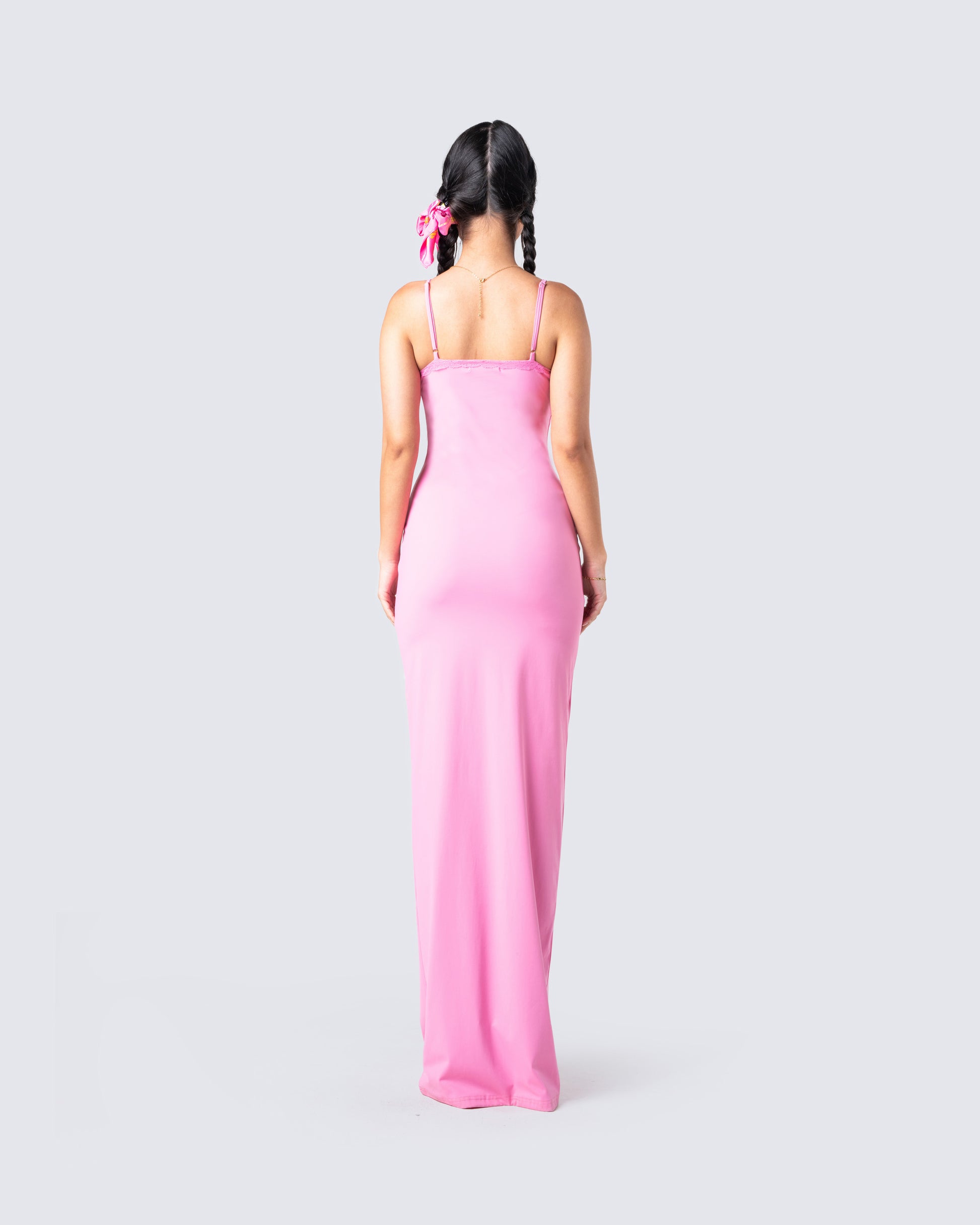 It really doesn't take much effort for a bad b*tch to look good 💅🏼 Be the type they’ll talk about forever in this subtle, but elegant pink strappy fitted maxi dress - made from a compact knit and complete with a lace trim 💗