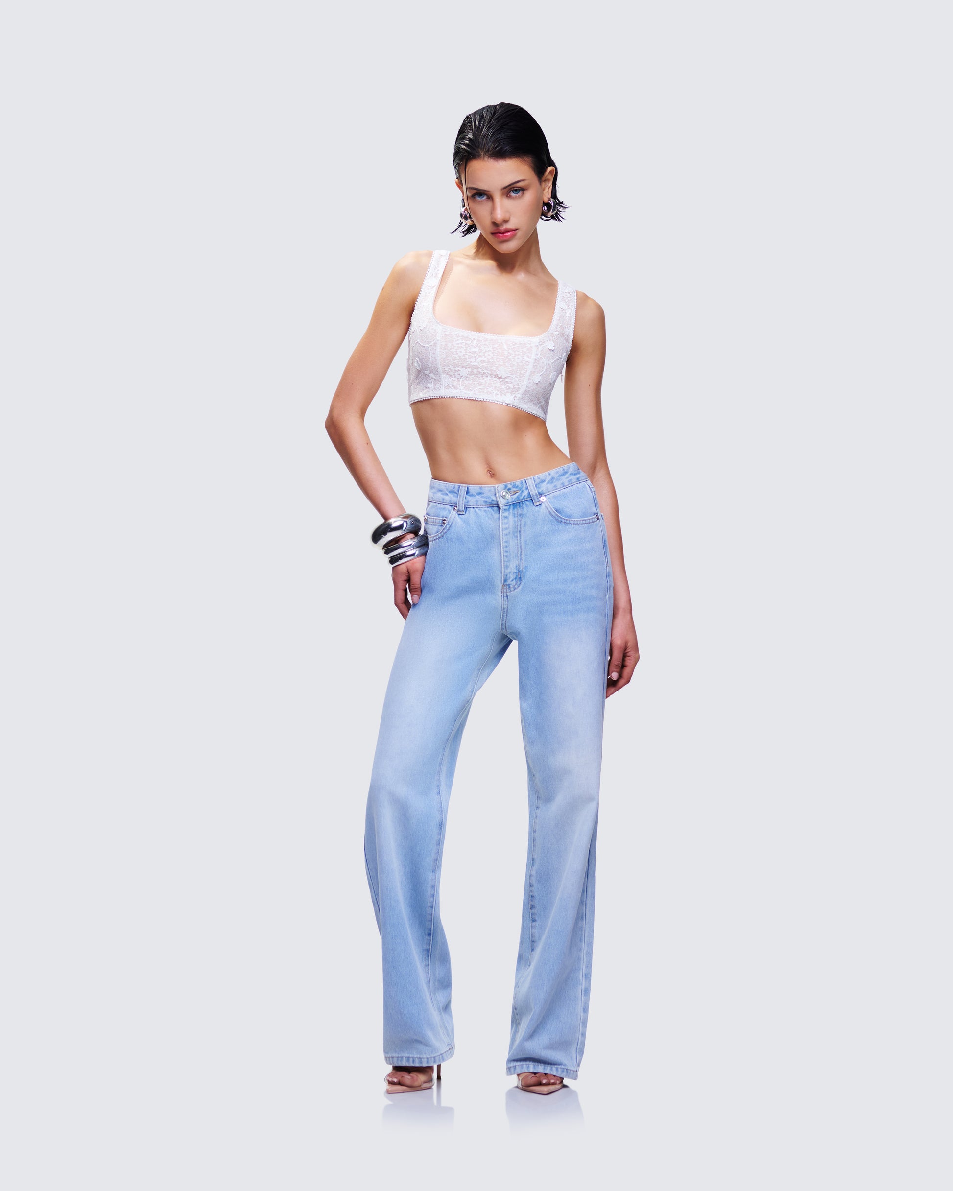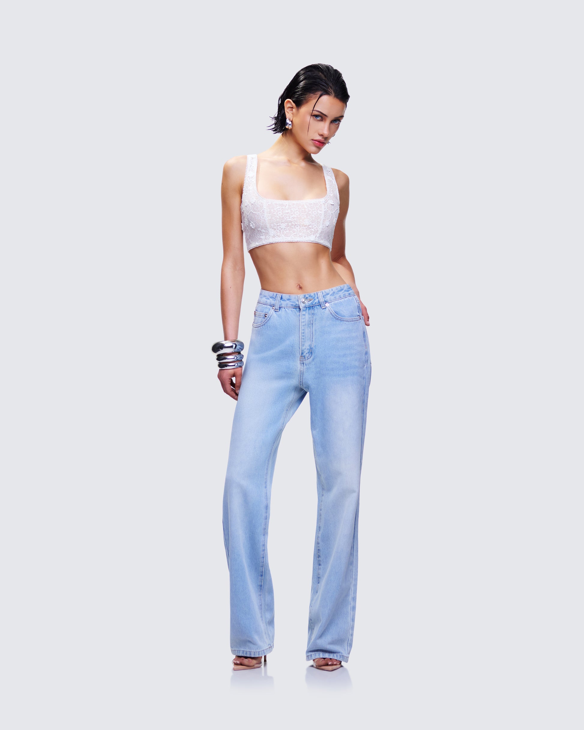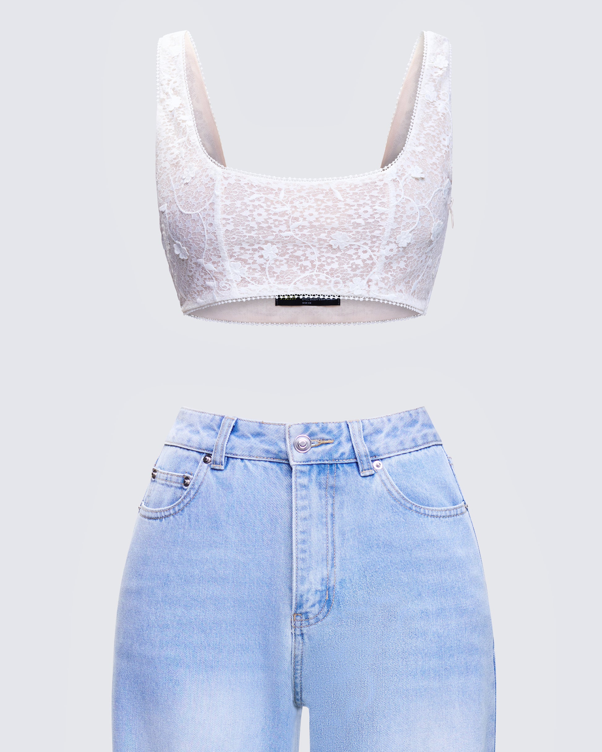 Off-duty, but only if you mean off-limits π€ pairing an embroidered lace bra top with straight-leg jeans, this two-piece set is easygoing, but never boring π€