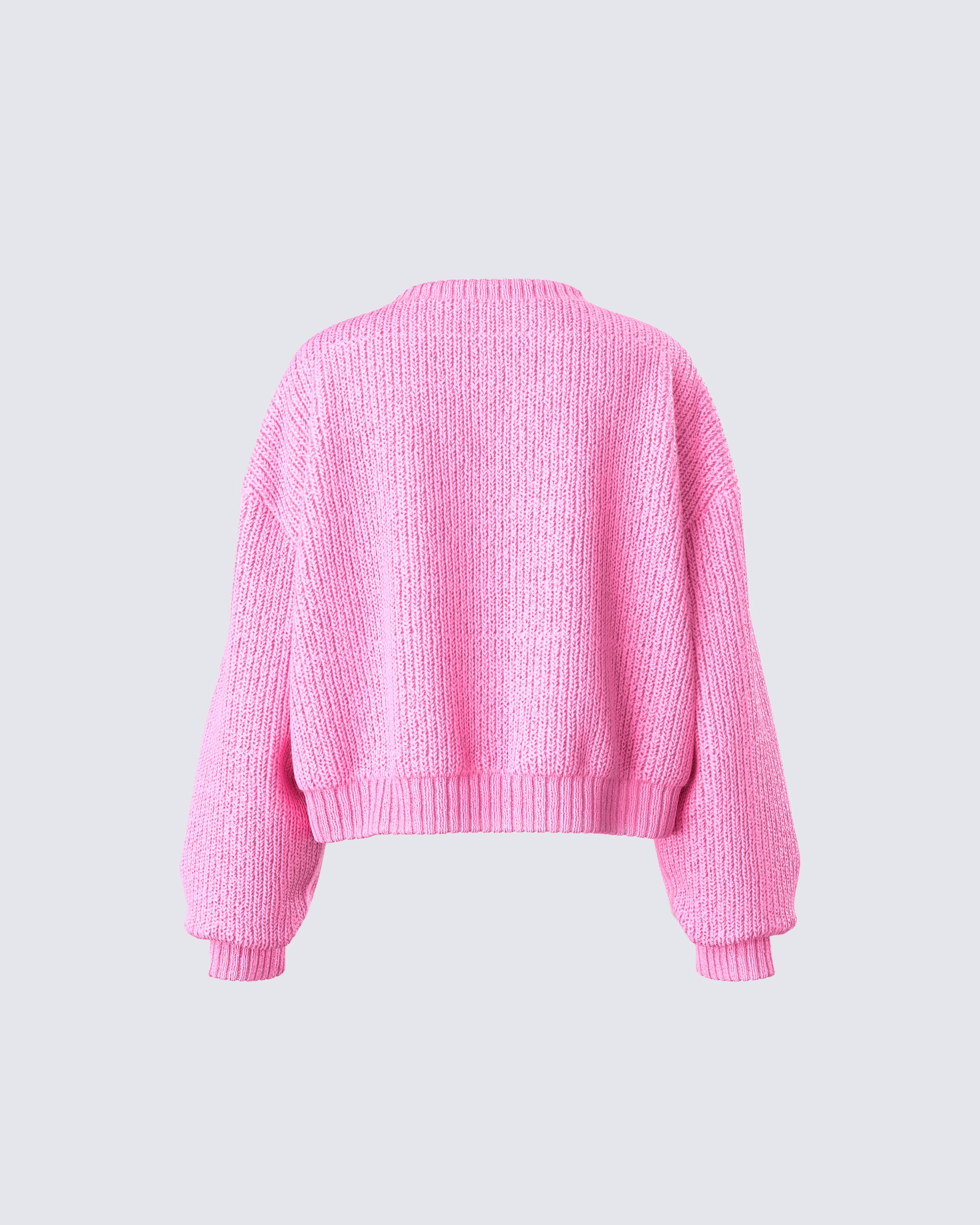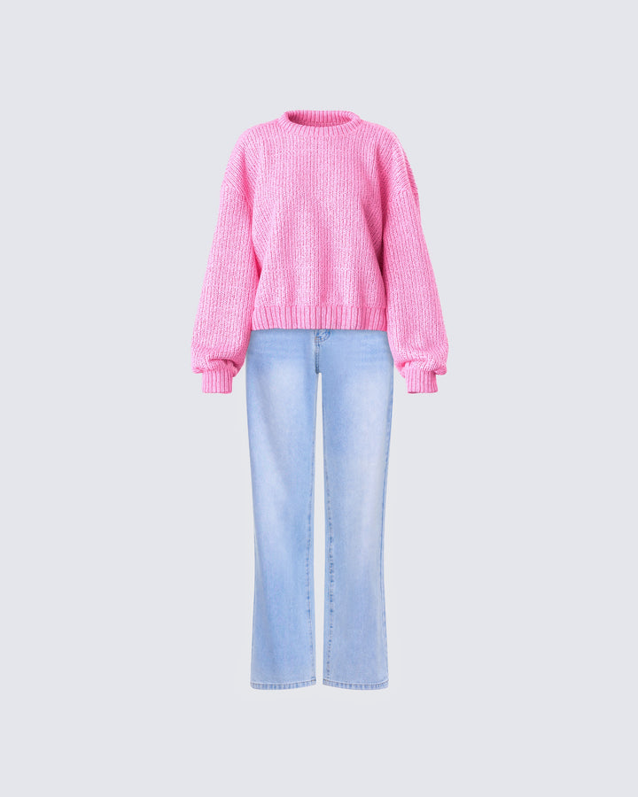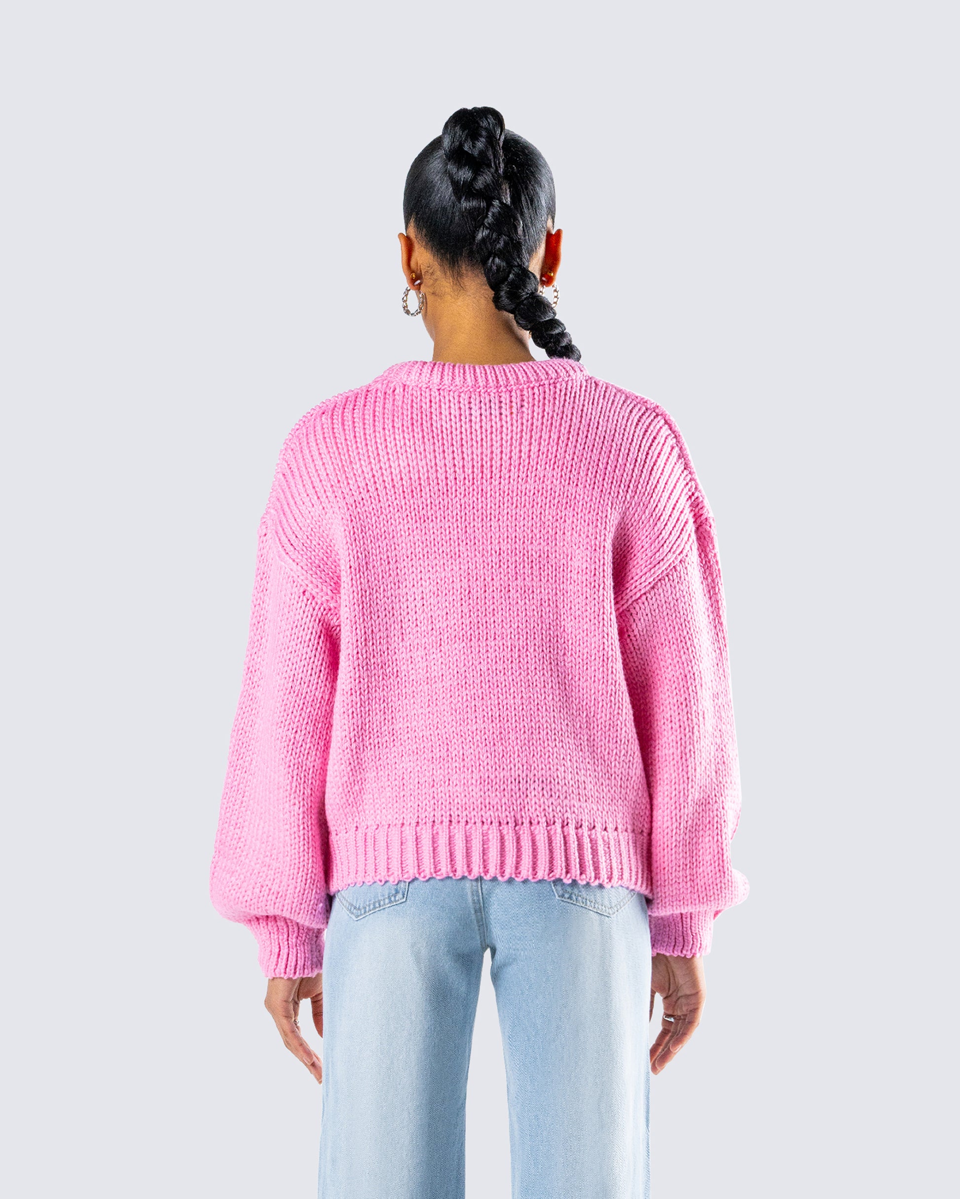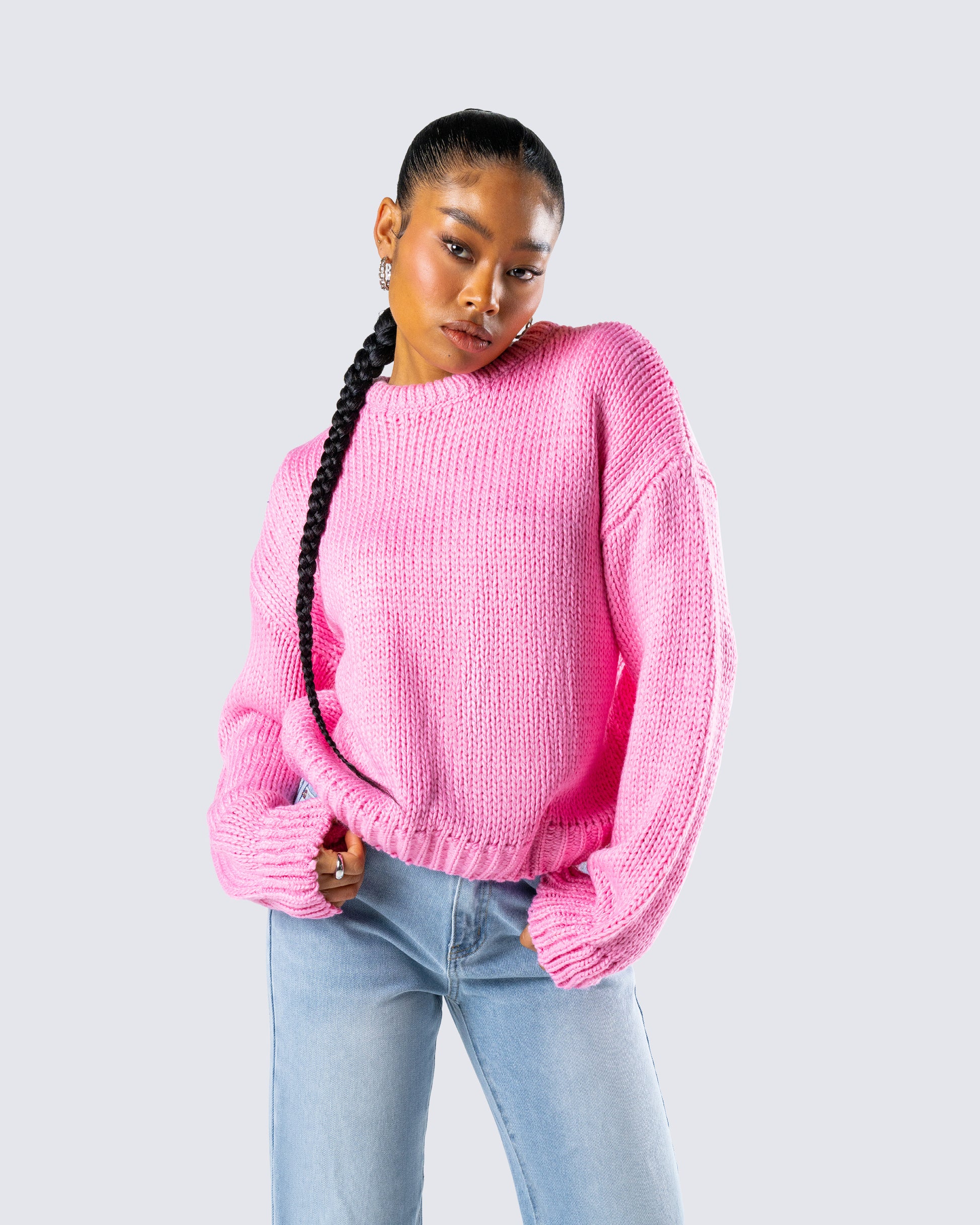 Name something better than a pink sweater top… 💕 Constructed from fully fashioned knit with a chunky knit stitch, and complete with a rib collar, sleeve cuffs, hem band, and a crew neck fit - this top is making “sweater weather” 10x cuter 😚