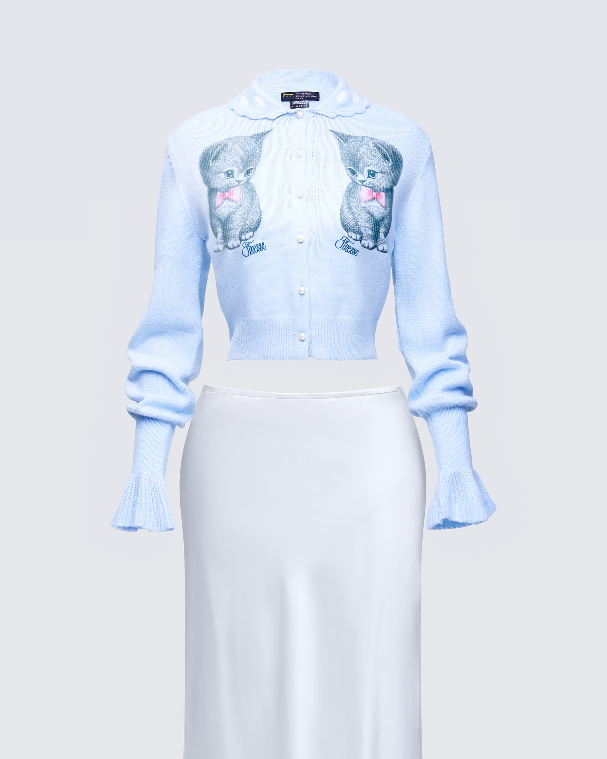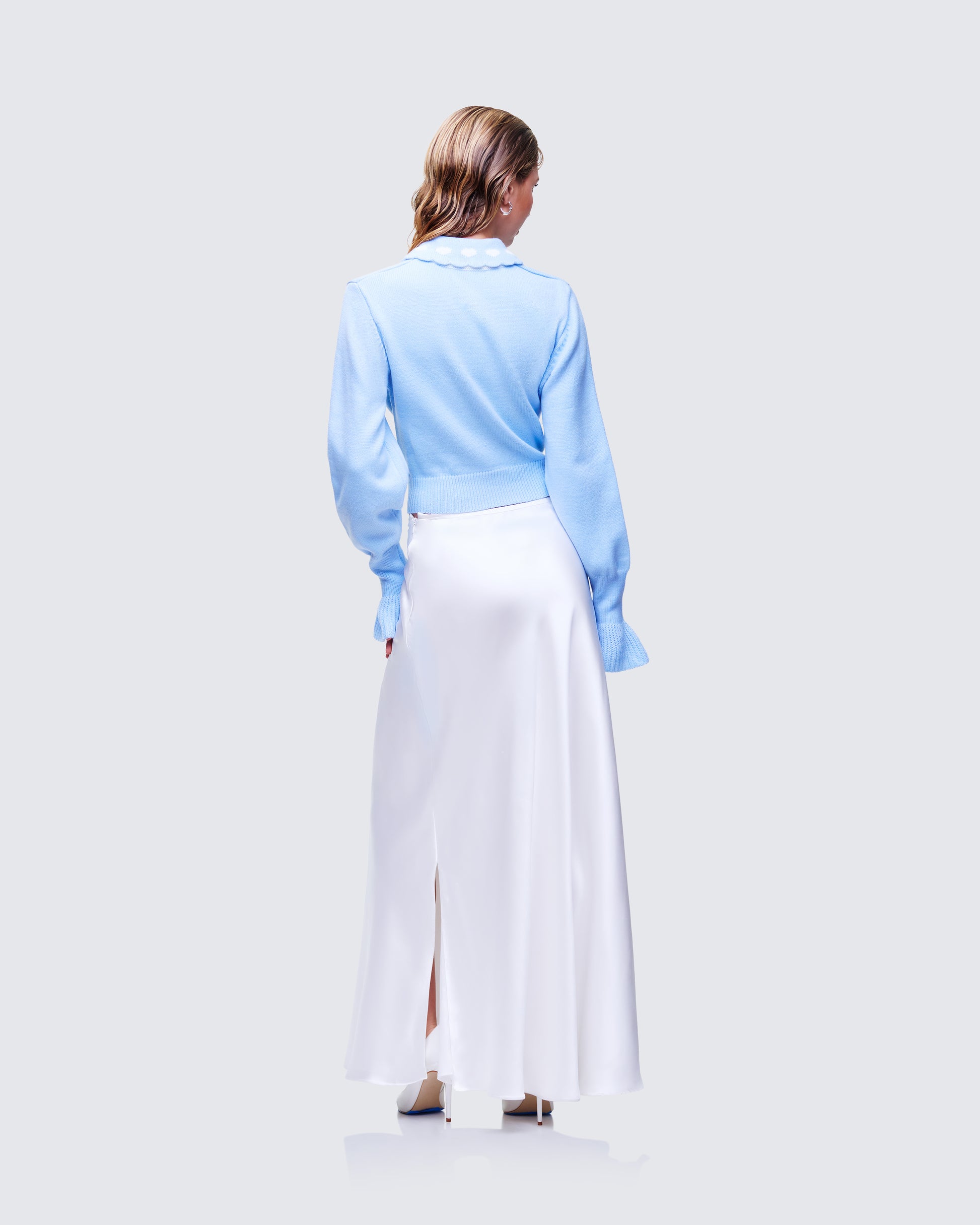 Knit that flirts, satin that floats π Pearl-effect buttons and flutter cuffs keep the cardi dainty while the cream glossy skirt handles the drama with a single swish β¨