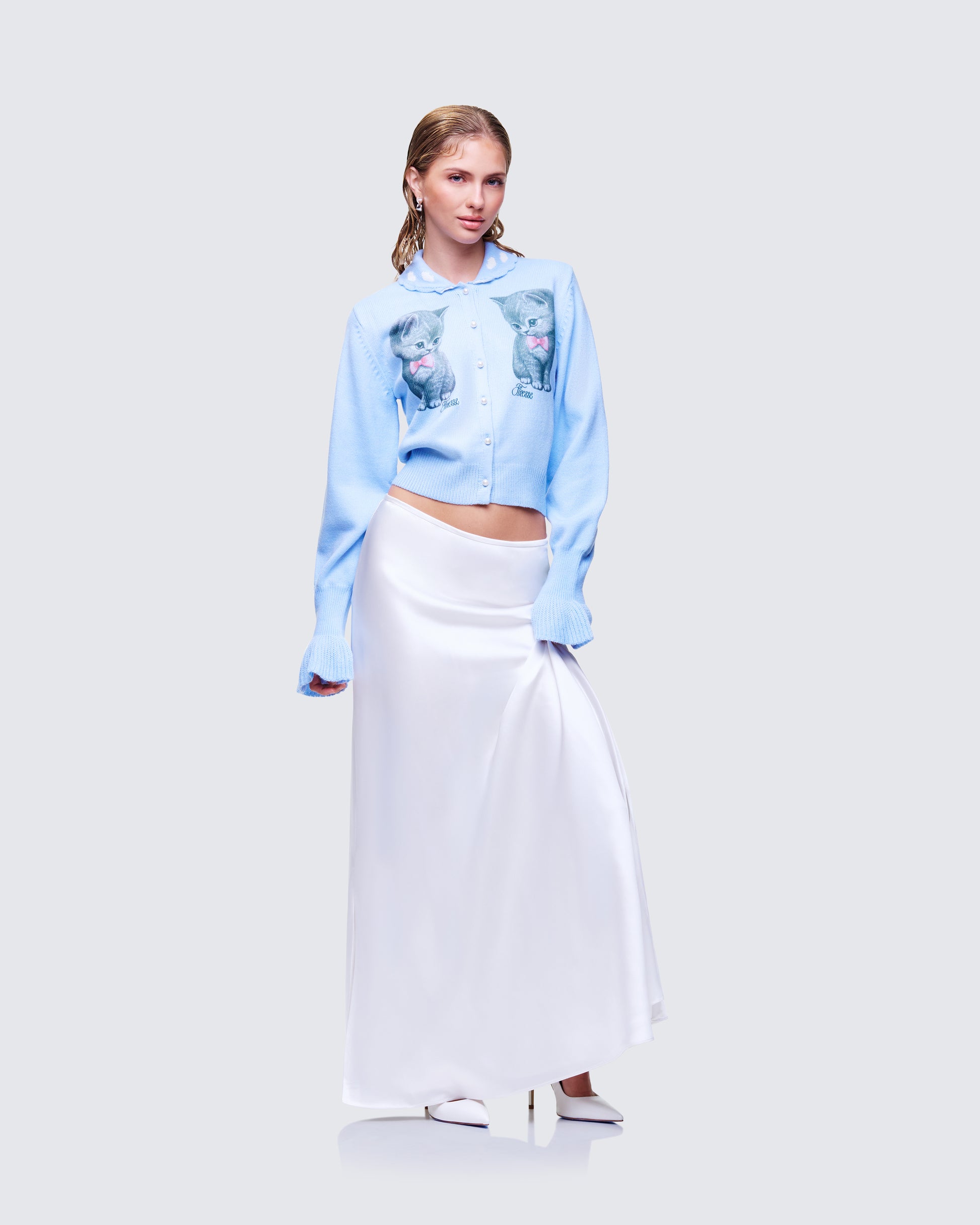 <p>Kitty Blue Printed Cardigan: 92% Acrylic, 8% Nylon</p><p>Amalie White Satin Maxi Skirt: 100% Polyester</p><p>Lining: 100% Polyester</p>