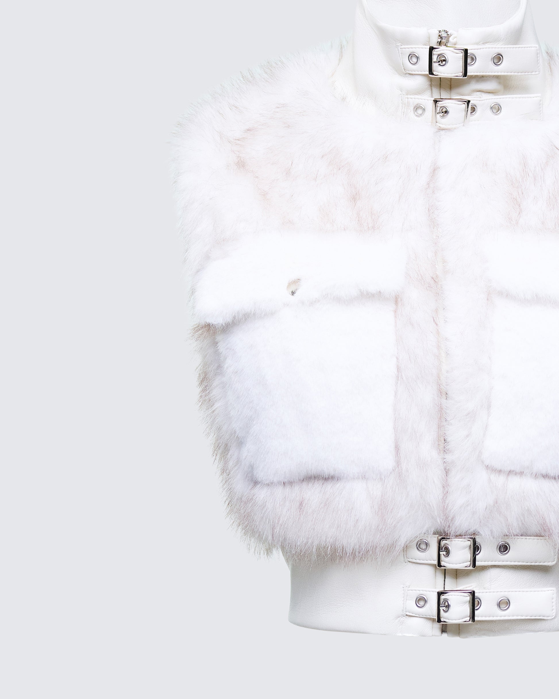 Soft on sight, strict on energy 🤍 This cropped faux fur jacket features bold buckle hardware and a structured silhouette for a look thats made to be worn when warmth is optional but presence is required 😏