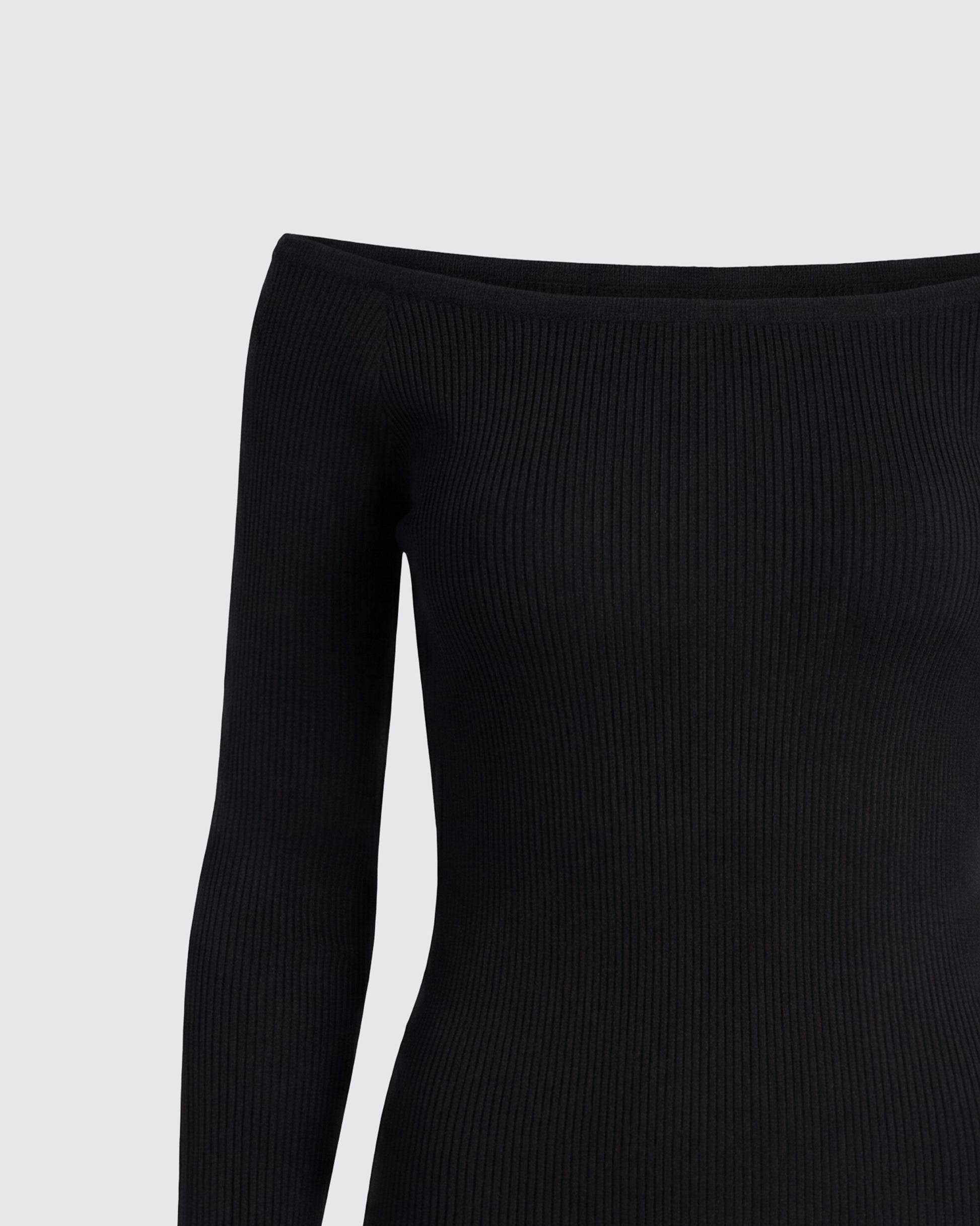 Shoulders that make them stare. This off-shoulder number comes with extra-long sleeves that extend past your hands — ribbed knit that hugs your body and stays put when you're dancing on tables.