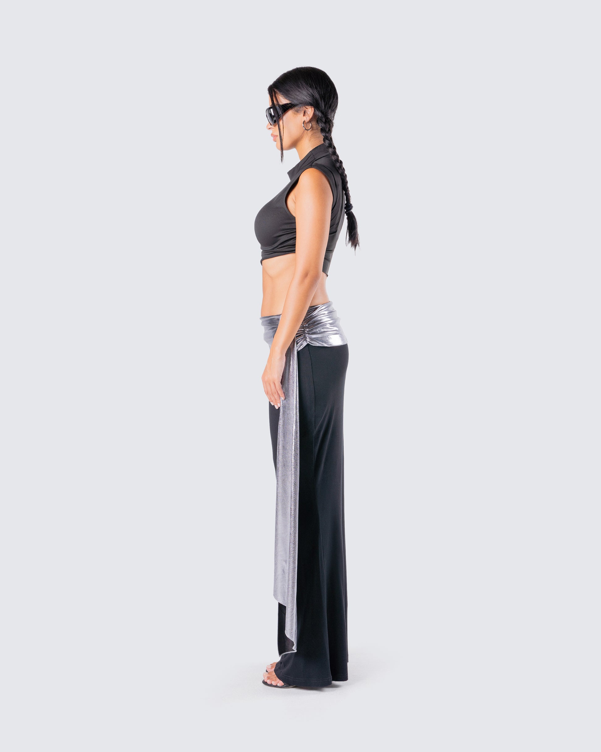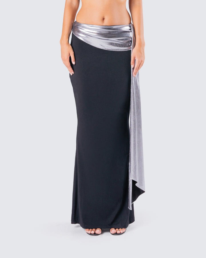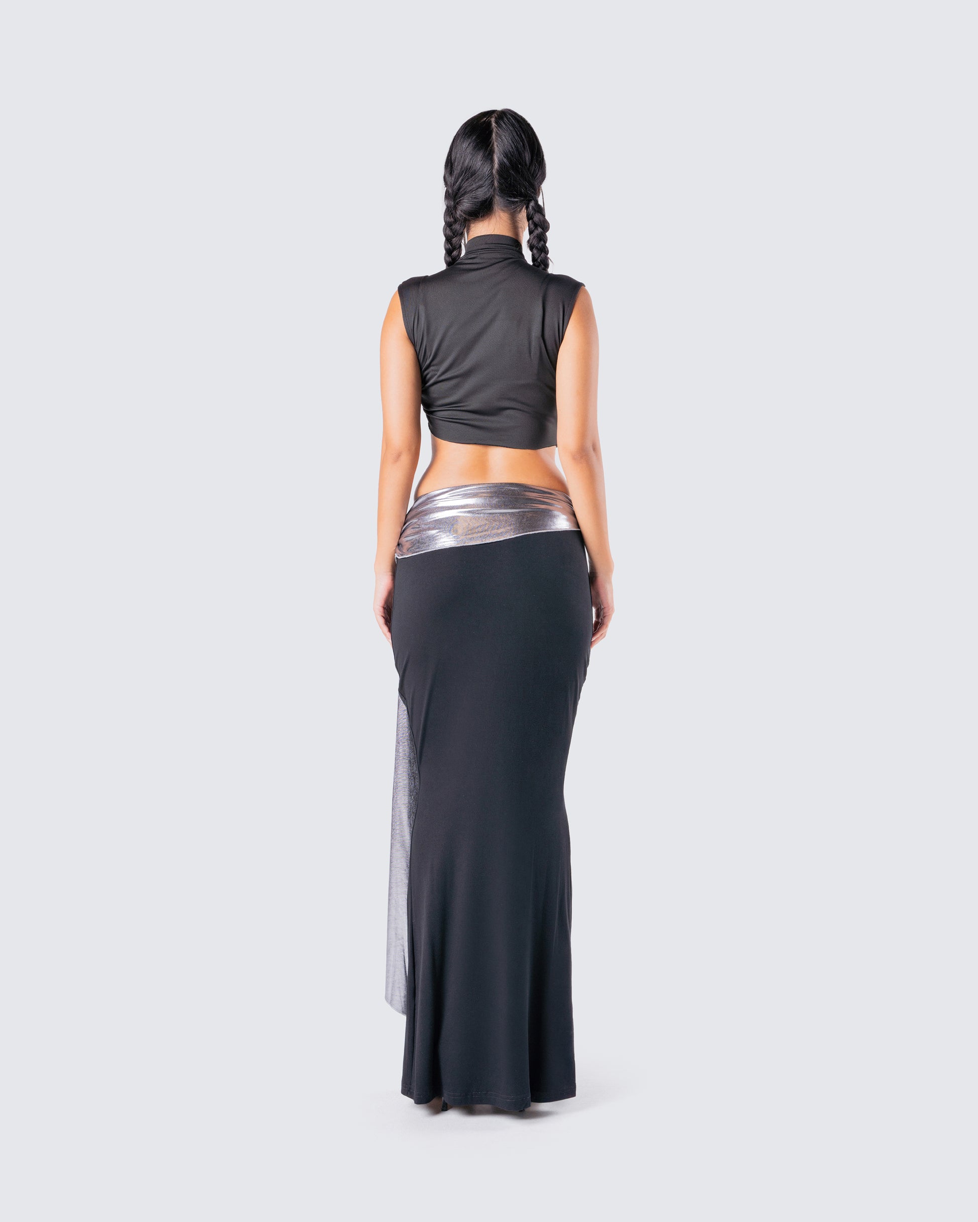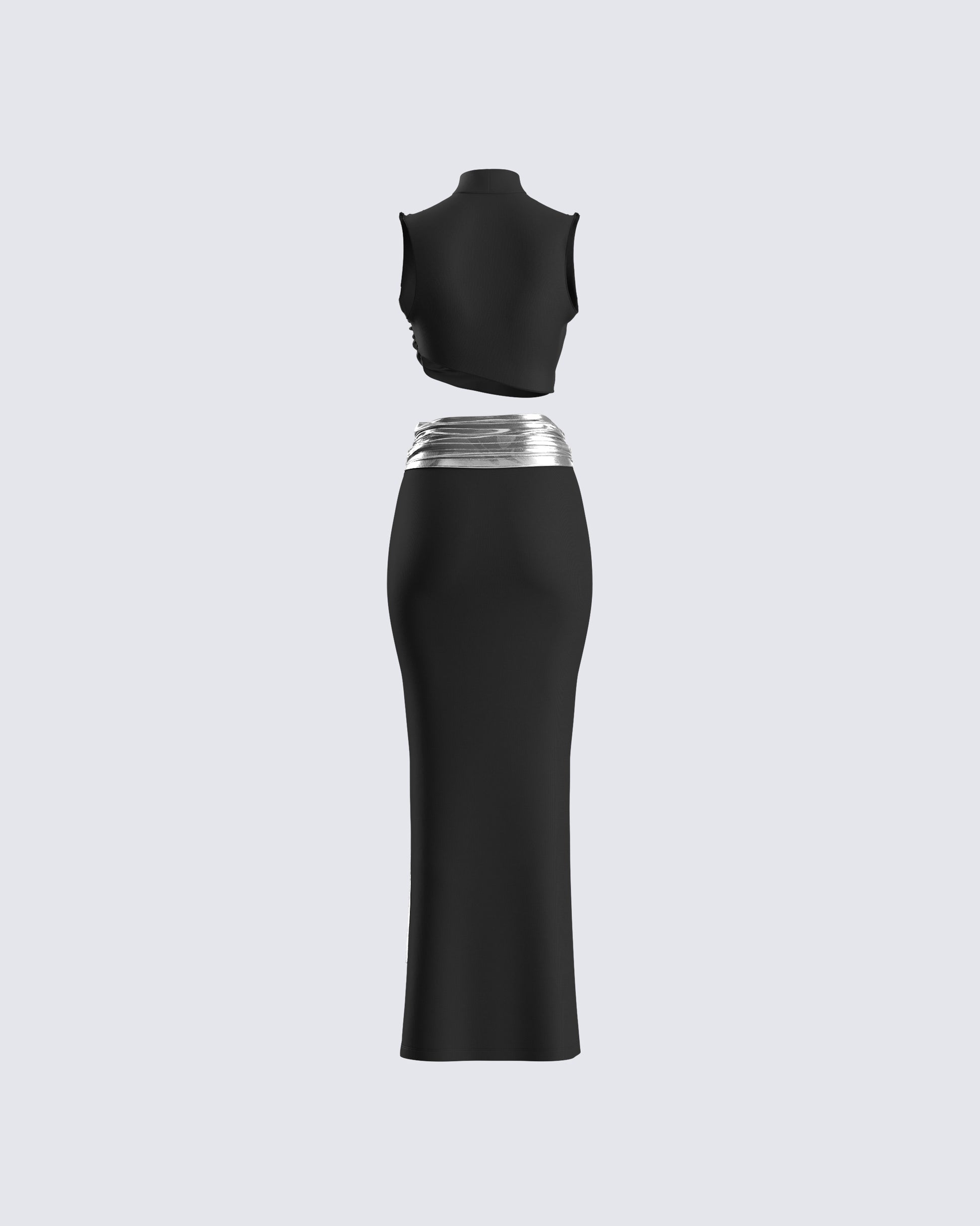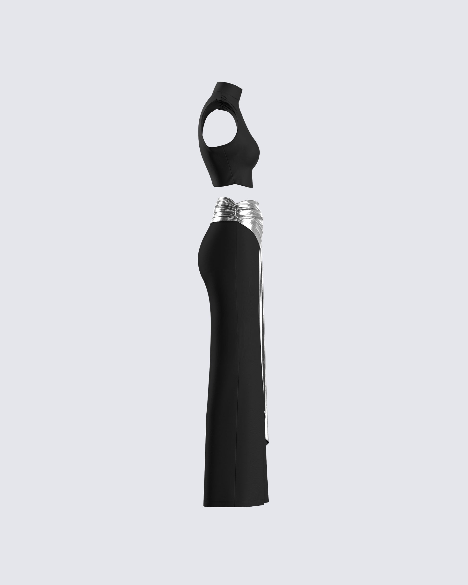 Own the night in this sleek, and classy two piece set š¤Ā Featuring a black turtleneck cropped top and a black draped maxi skirt - this fit will have you looking expensive, and way too good for themĀ š